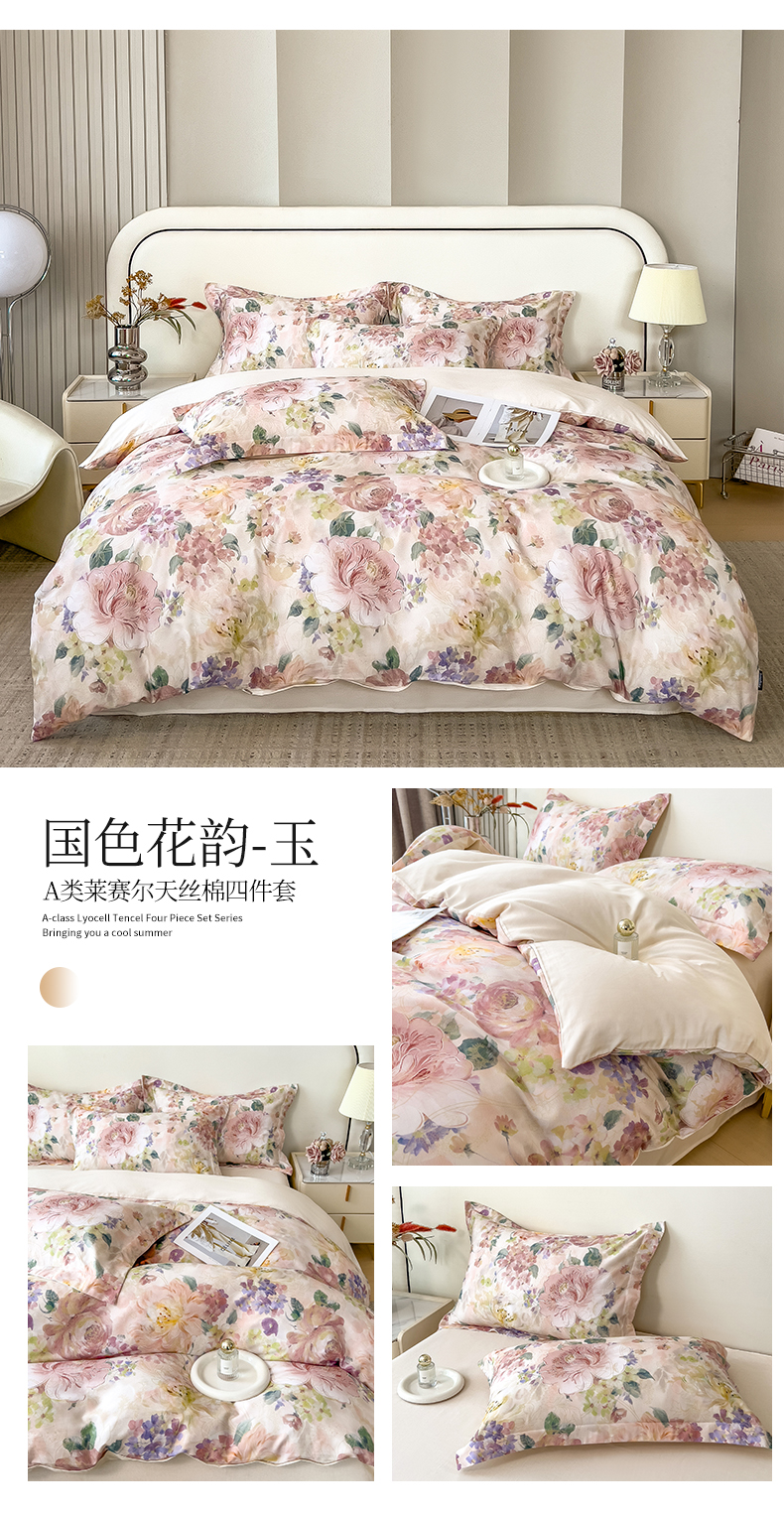 商品名称:芃成家纺 2025新款A类莱赛尔天丝棉四件套 国色花韵-玉