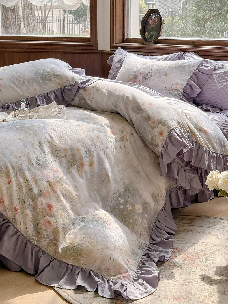 胜权家纺 2025新款全棉纯棉数码印花双层纱床盖四件套 梵花紫梦