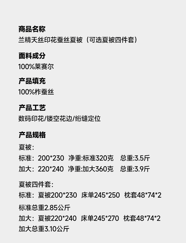 [{"sp_id":11,"sp_name":"\u989c\u8272\u5206\u7c7b","sp_format":2,"sp_list":[{"sp_value_id":55,"sp_value_name":"\u4e91\u79be\u5ddd-\u5170","sp_value_image":{"id":999,"path":"https:\/\/img3.91jf.com\/ghelp\/2025\/20250405\/20250405183447_672150.jpg"},"sp_value_video":{"id":1439762,"img":"https:\/\/img3.91jf.com\/ghelp\/2025\/20250405\/20250405183447_672150.jpg","path":"https:\/\/img3.91jf.com\/ghelp\/2025\/20250405\/20250405184141_176356.mp4","time":1,"download_num":0,"play_num":0},"price":"265.00","storage":400,"weight":"1.750","is_check_weight":0,"plus_price":"","sp_sort":5}]},{"sp_id":27,"sp_name":"\u5c3a\u5bf8","sp_format":1,"sp_list":[{"sp_value_id":298,"sp_value_name":"200*230\u5355\u590f\u88ab","sp_value_image":{"id":0,"path":""},"sp_value_video":{"id":0,"img":"","path":"","time":0,"download_num":0,"play_num":0},"price":"265.00","storage":100,"weight":"1.750","is_check_weight":0,"plus_price":"","sp_sort":1},{"sp_value_id":299,"sp_value_name":"220*240\u5355\u590f\u88ab","sp_value_image":{"id":0,"path":""},"sp_value_video":{"id":0,"img":"","path":"","time":0,"download_num":0,"play_num":0},"price":"285.00","storage":100,"weight":"1.950","is_check_weight":0,"plus_price":"","sp_sort":2},{"sp_value_id":302,"sp_value_name":"200*230\u590f\u88ab\u56db\u4ef6\u5957","sp_value_image":{"id":0,"path":""},"sp_value_video":{"id":0,"img":"","path":"","time":0,"download_num":0,"play_num":0},"price":"380.00","storage":100,"weight":"2.850","is_check_weight":0,"plus_price":"","sp_sort":5},{"sp_value_id":303,"sp_value_name":"220*240\u590f\u88ab\u56db\u4ef6\u5957","sp_value_image":{"id":0,"path":""},"sp_value_video":{"id":0,"img":"","path":"","time":0,"download_num":0,"play_num":0},"price":"400.00","storage":100,"weight":"3.100","is_check_weight":0,"plus_price":"","sp_sort":6}]}]