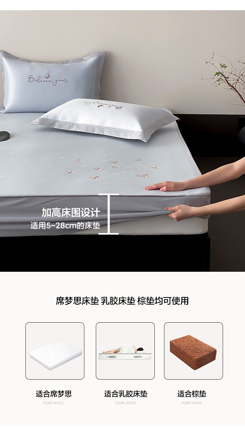(总)由有家居 2025新品50S双股全棉长绒棉刺绣绗缝夹棉床笠床垫保护罩三件套,舒芙蕾,海清绿,慕晴粉,奶茶咖,暖心粉,星辰灰,星光蓝,珍珠白,组合图