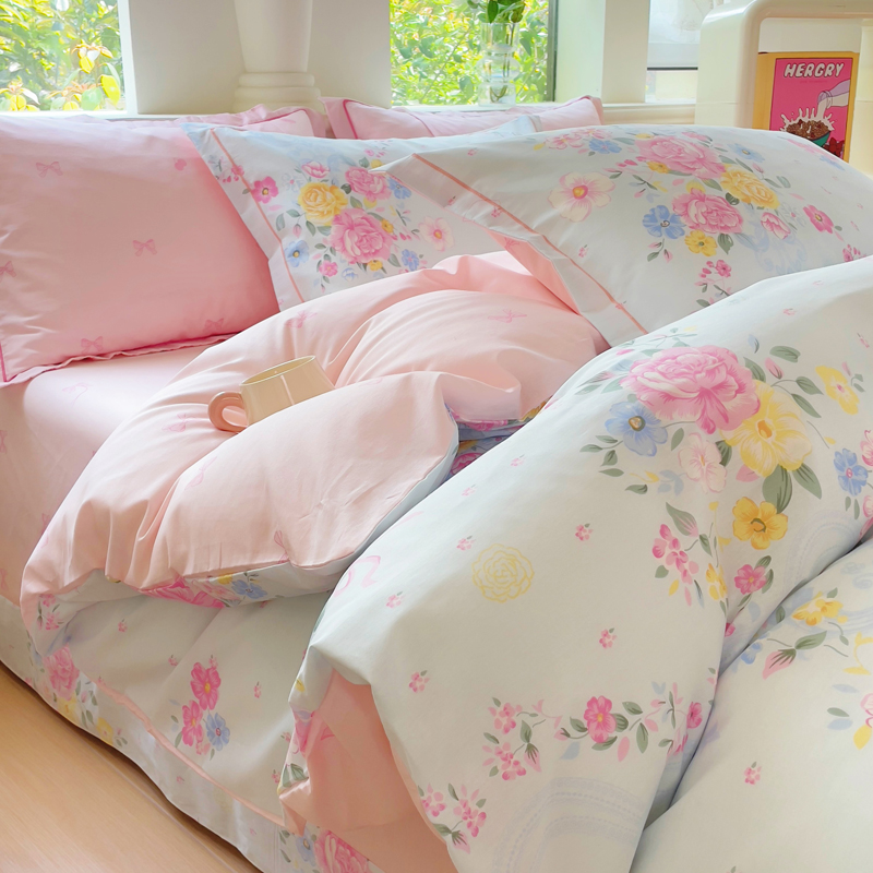 铭博家纺 新款直播爆款网红全棉四件套13070印花吊边一字绣纯棉被套工艺款 花语呢喃,花语呢喃