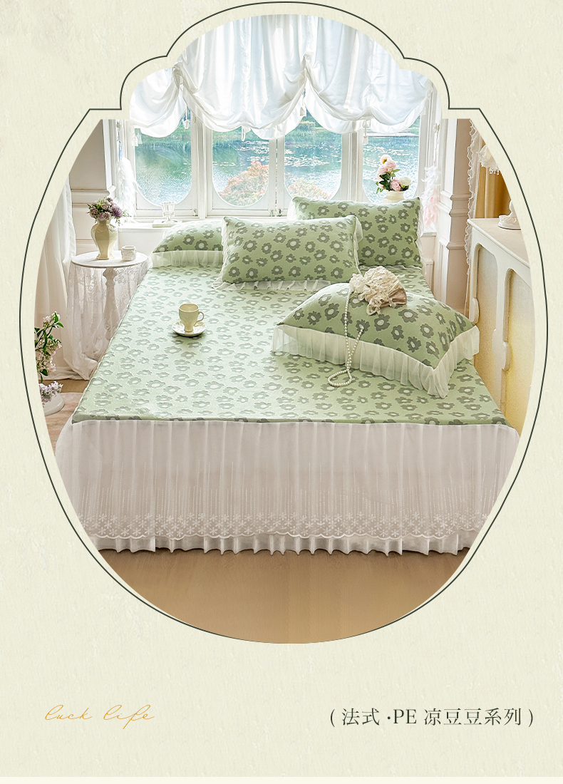 (总)芷卧 2025新款凉豆豆PE凉感刺绣双层花边床裙款冰豆豆凉席三件套(提供买家秀)