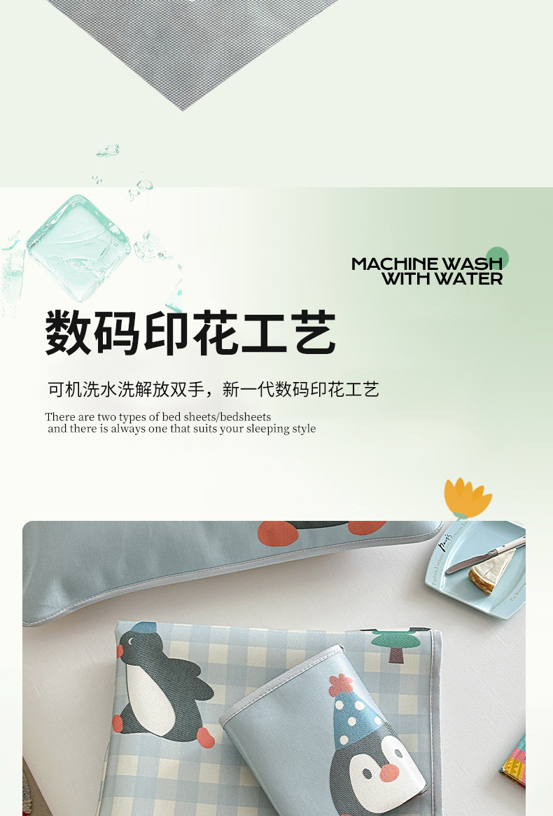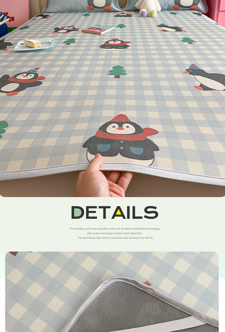 商品名称:萝莉家纺 2025新款升级900D加厚数码印花斜纹冰丝床席款凉席三件套 企鹅萌萌