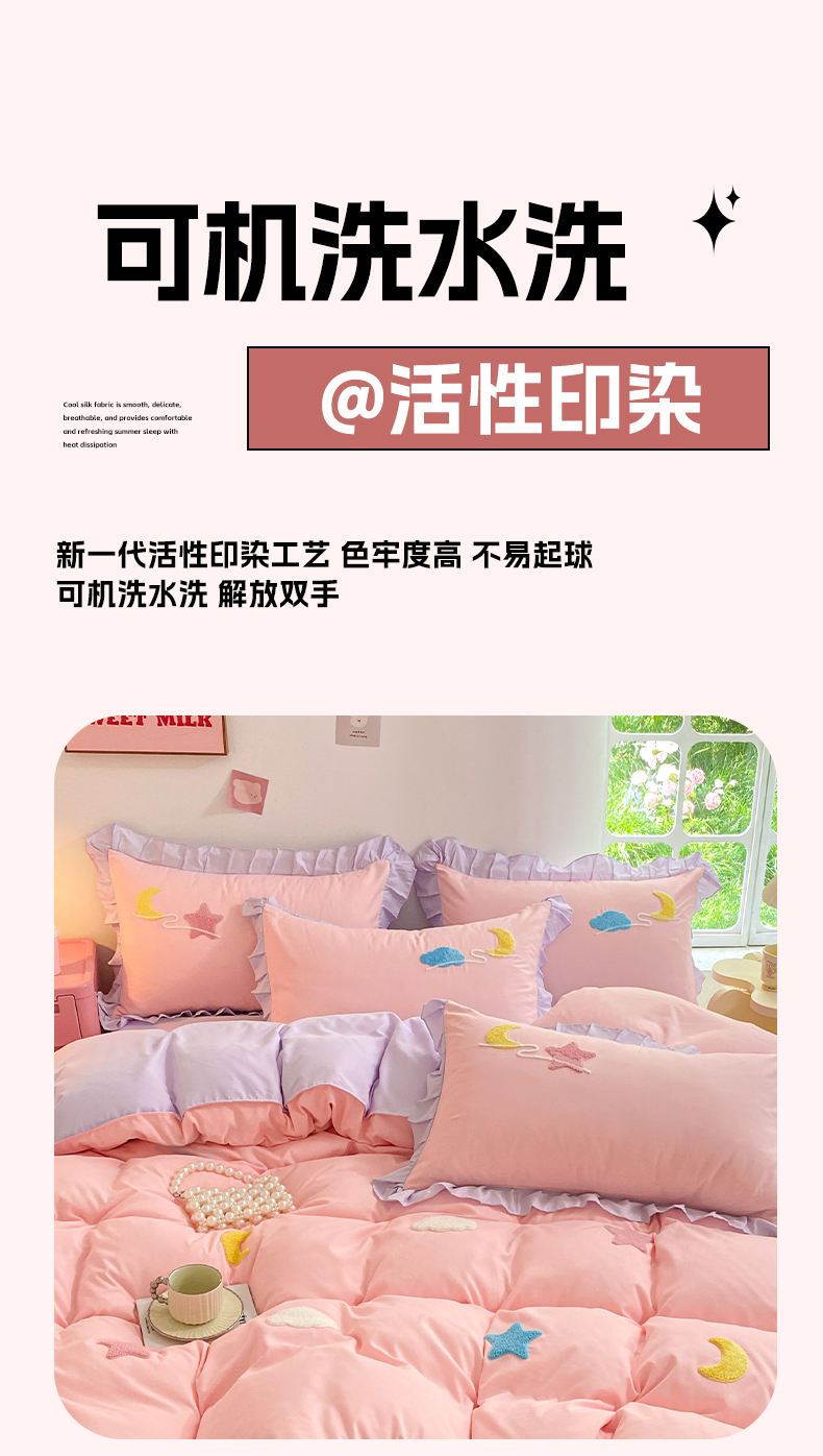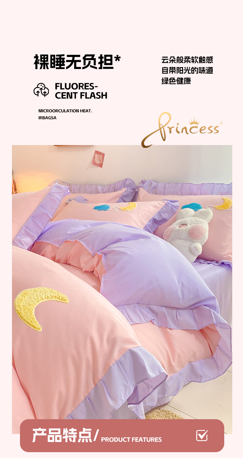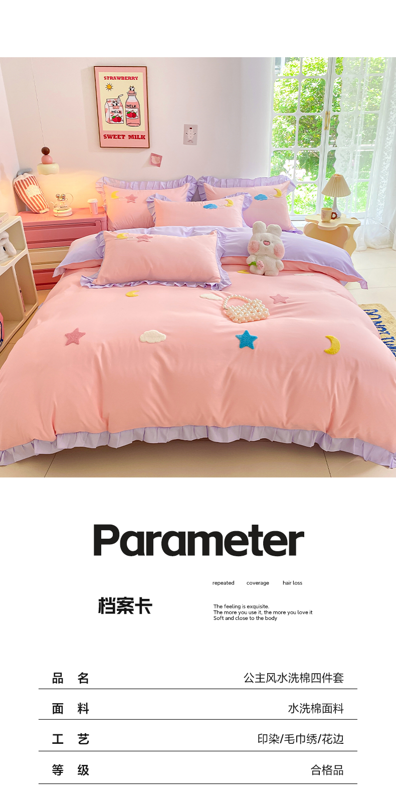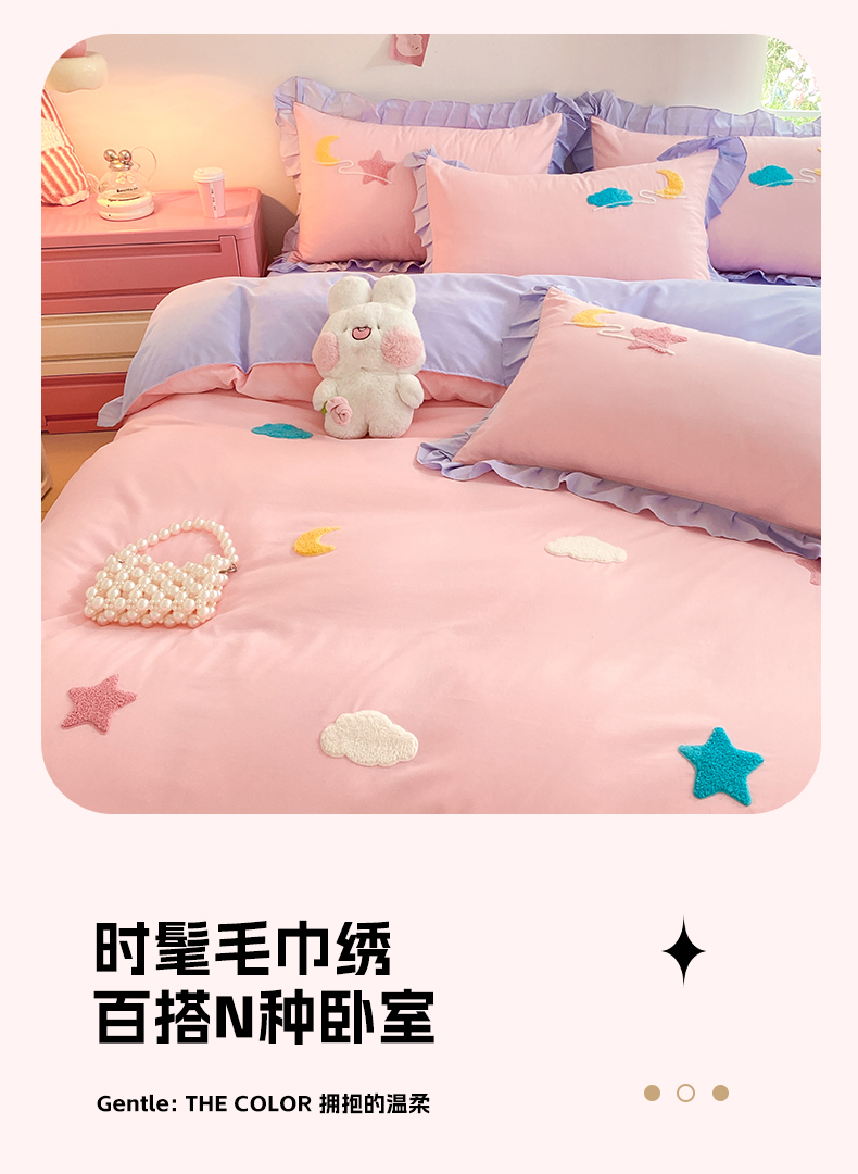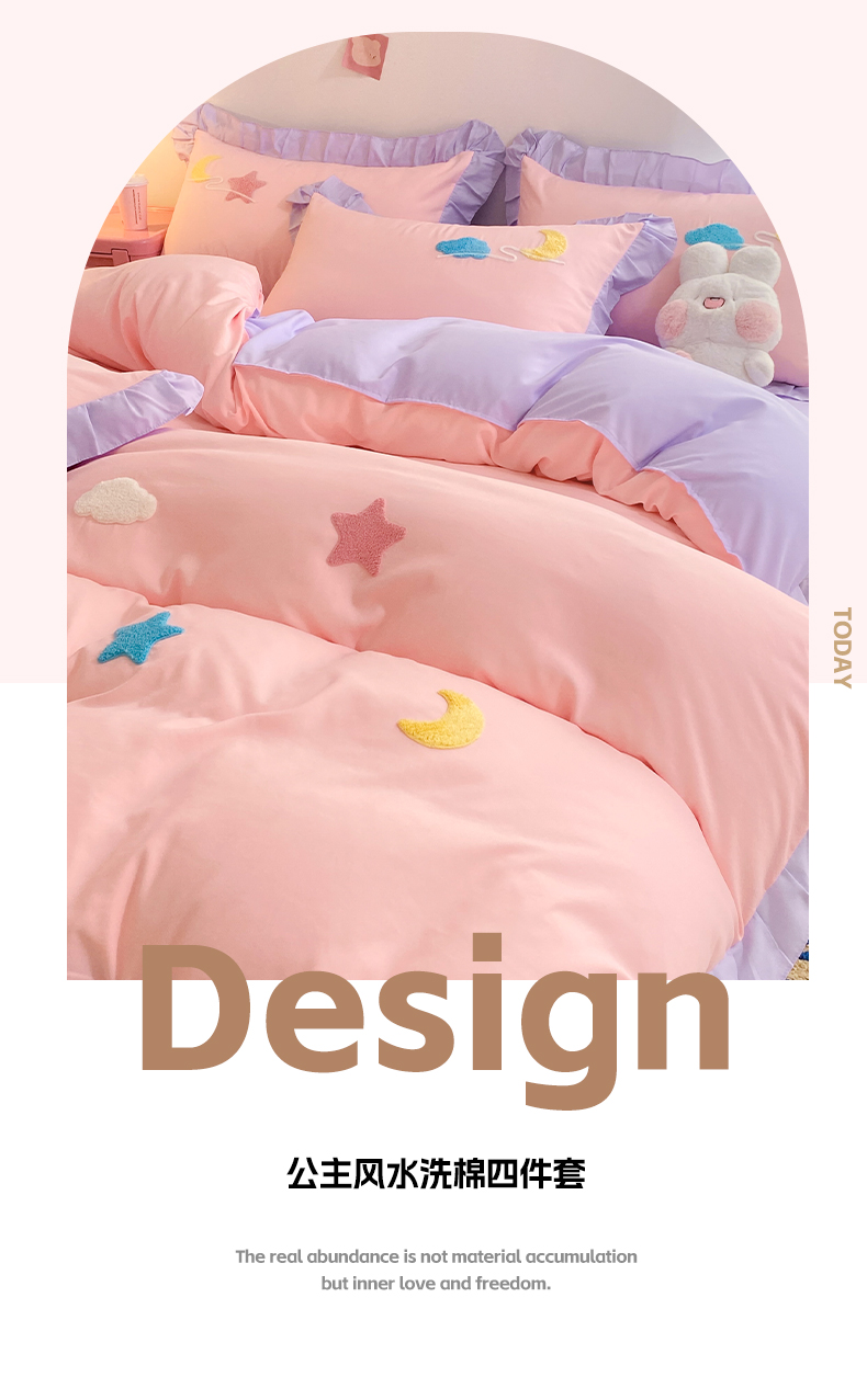 当前位置: 91家纺网 > 商品网购 > 床品套件 > 四件套 > 水洗棉四件套 > 雨菲家纺 2025新款公主风水洗棉四件套-星月 星月粉紫