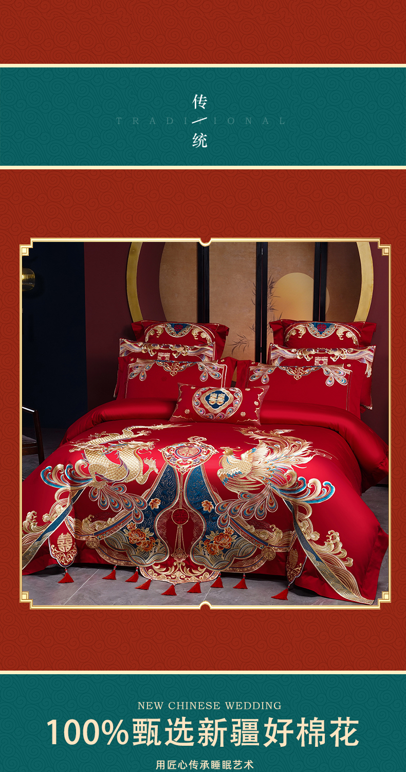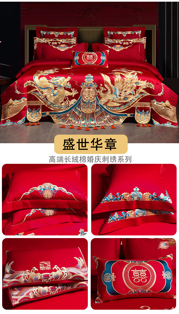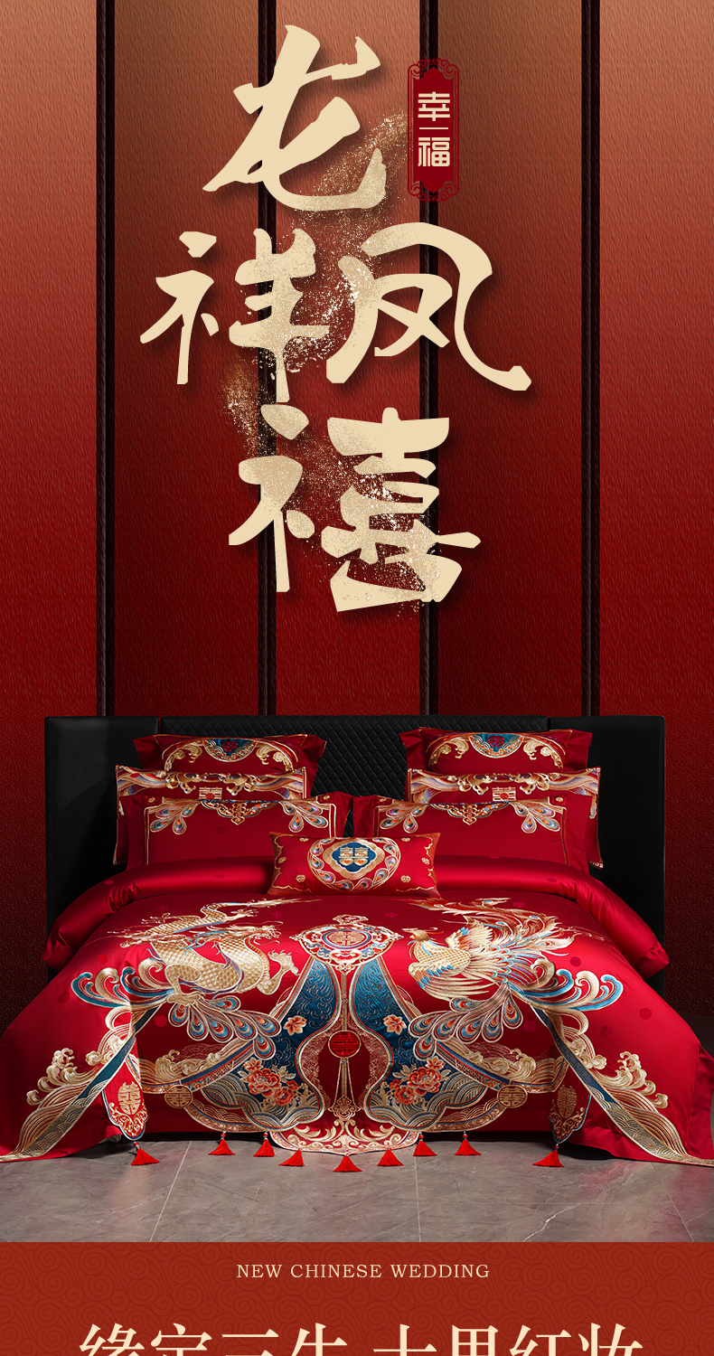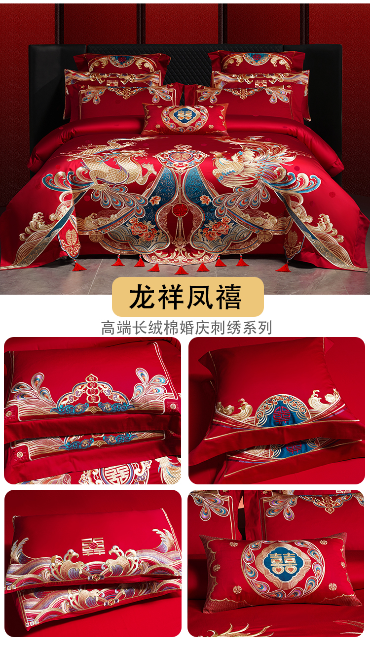 当前位置: 91家纺网 > 商品网购 > 床品套件 > 多件套 > 多件套 > 用心 2025新款长绒棉刺绣新中式婚庆多件套系列 龙祥凤禧
