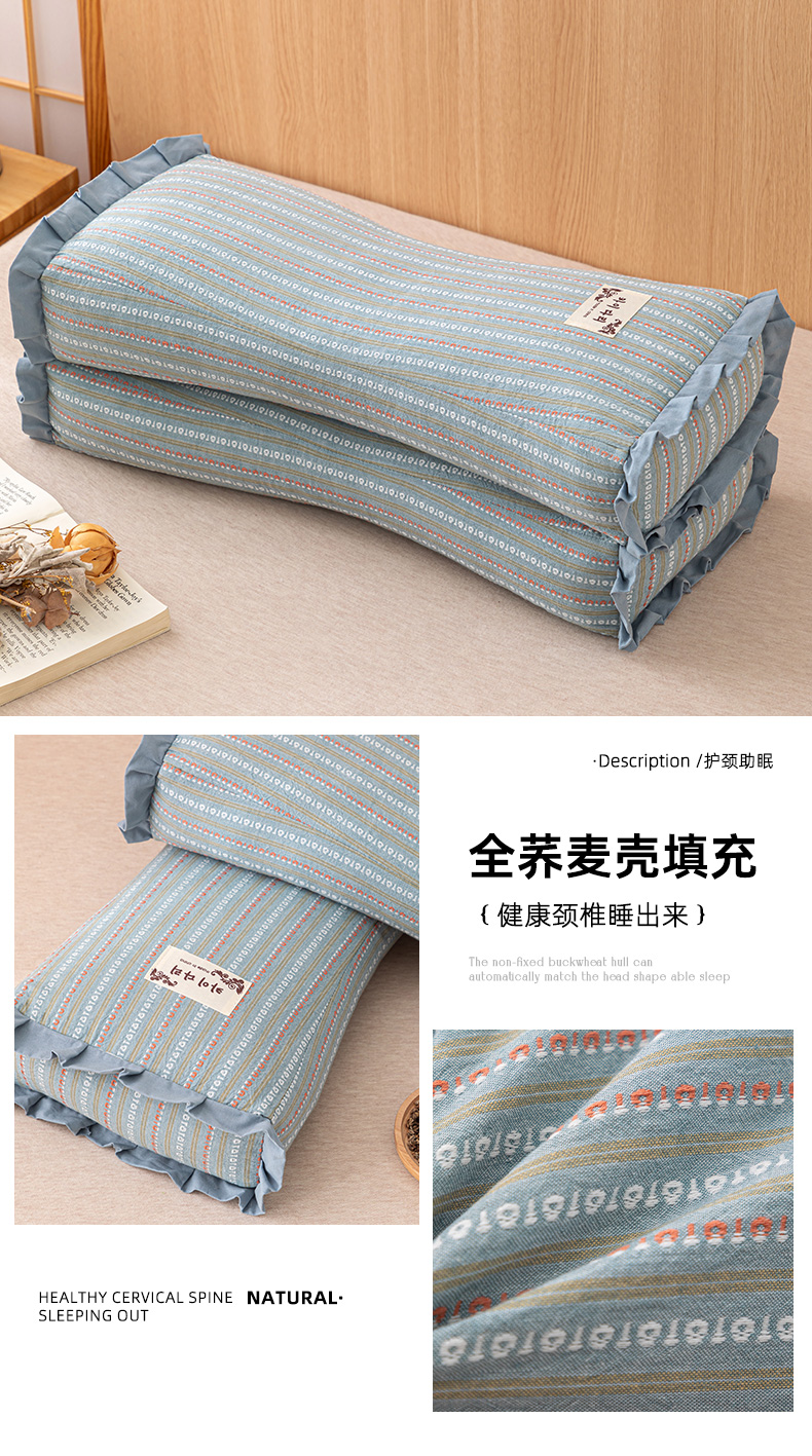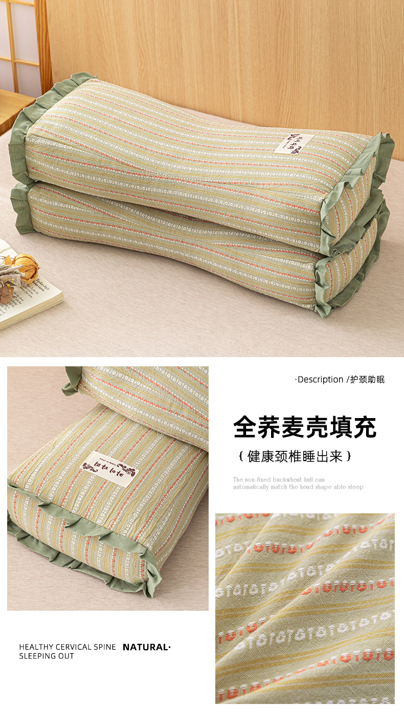 当前位置: 91家纺网 > 商品网购 > 枕头/枕芯/保健枕/颈椎枕 > 普通枕芯 > 织布人 2025新款荞麦枕全棉条纹花边护颈全荞麦壳枕头成人家用助眠硬枕芯 全棉条纹花边护颈枕-绿色 50x20cm/只