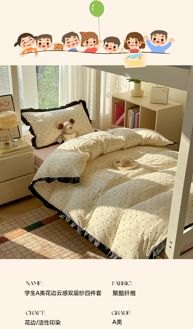 当前位置: 91家纺网 > 商品网购 > 床品套件 > 四件套 > 其它四件套 > 韩巢家纺 2025新款小波点学生宿舍寝室上下铺三件套开学季花边被套四件套 咖波点【黑皱皱花边款】