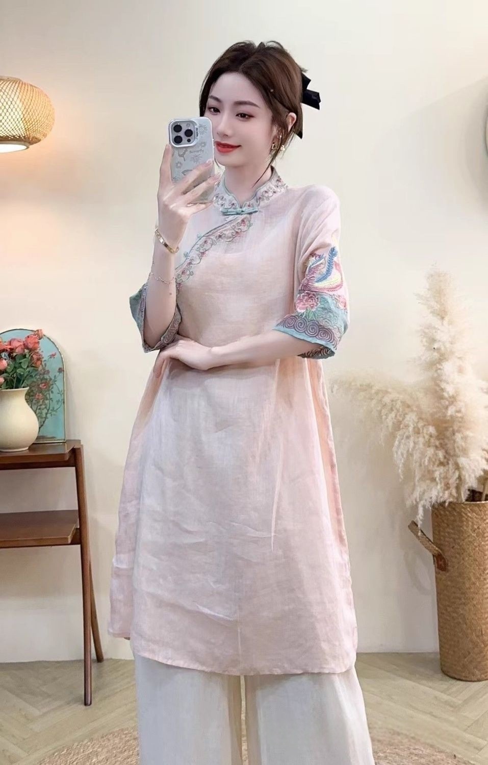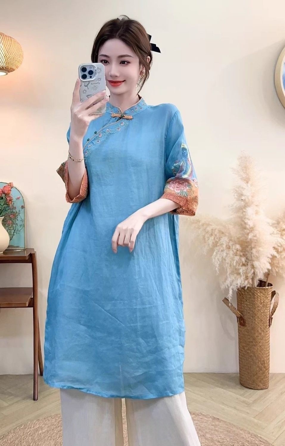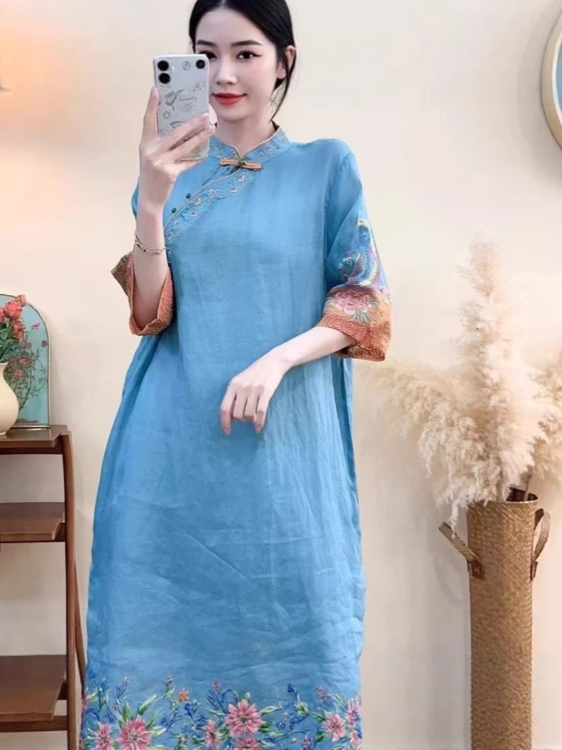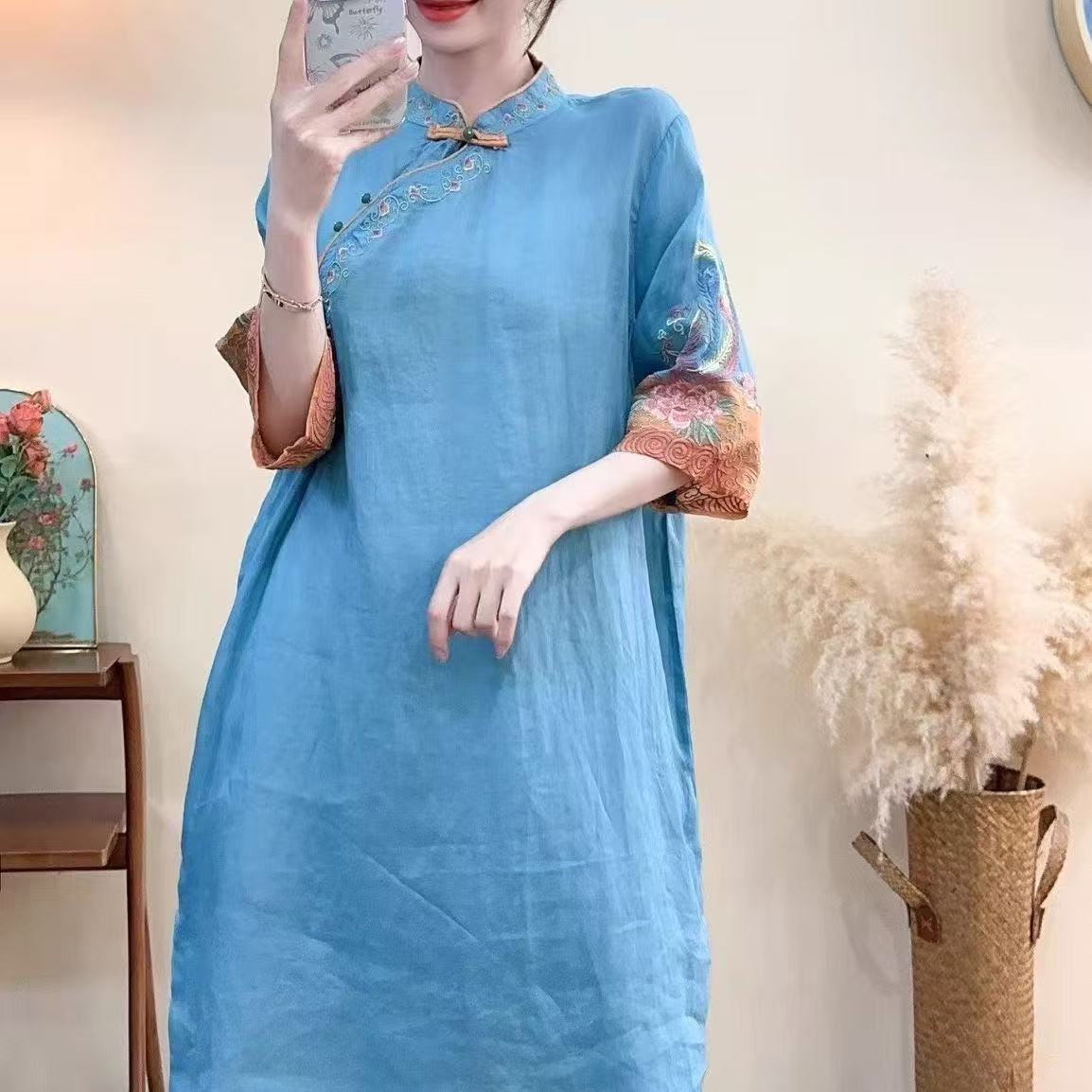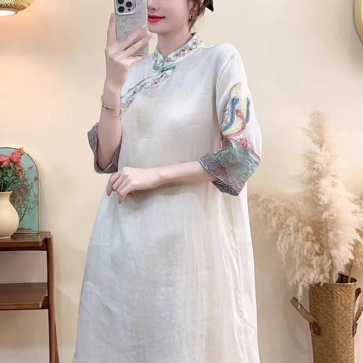 商品名称:(总)洛兰沙家居馆【只代发】【只代发】 2025春夏新款文艺复古民族风上衣女刺绣花棉麻连衣裙盘扣立领连衣裙女装