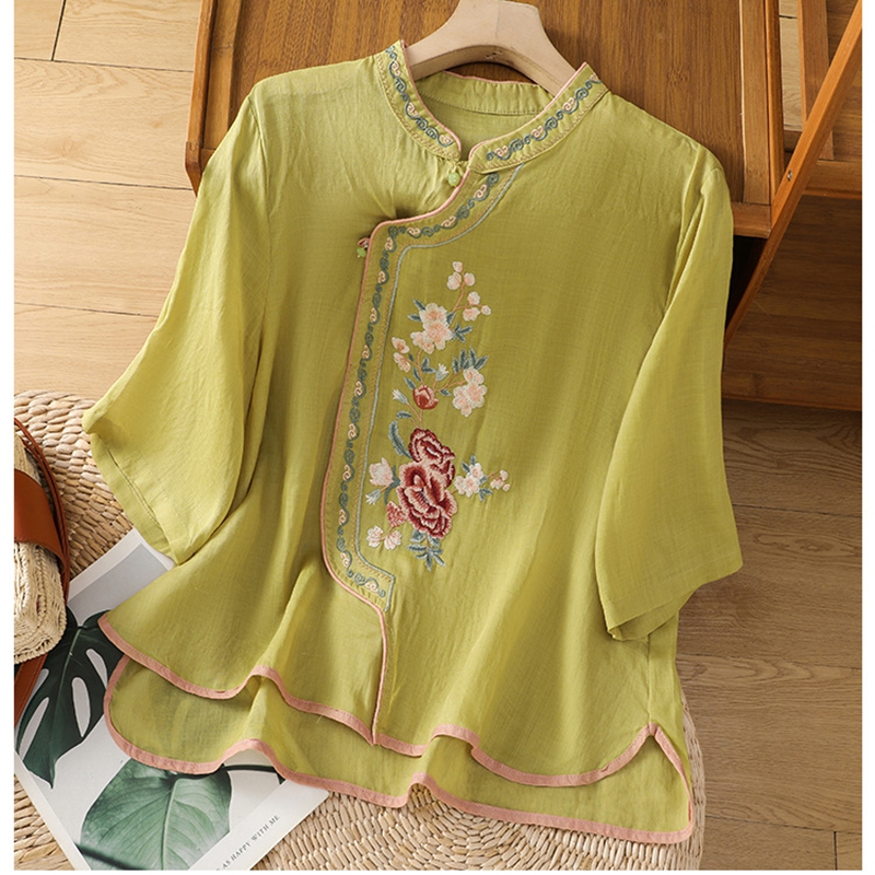 洛兰沙家居馆【只代发】【只代发】 2025夏季新款棉麻文艺复古衬衫新中式牡丹花刺绣国风茶服立领上衣 粉色