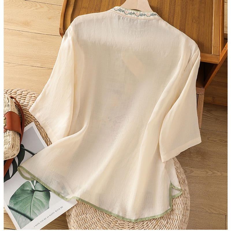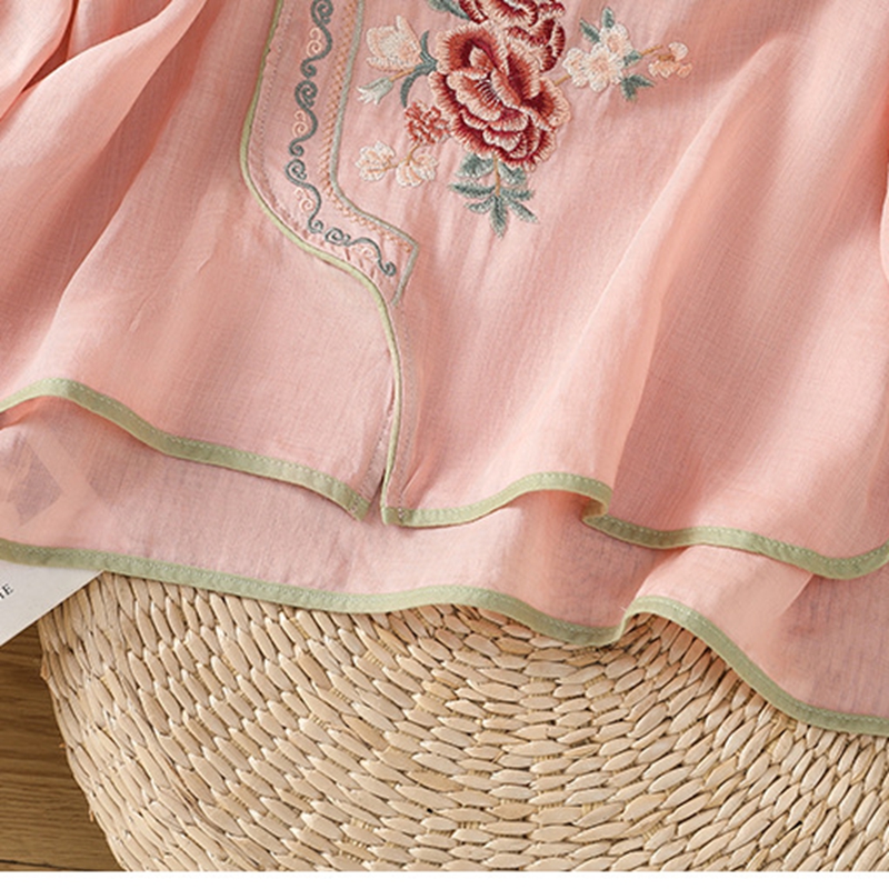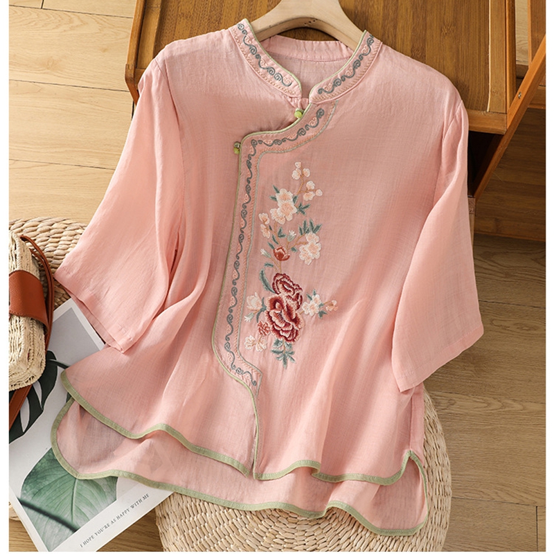 商品名称:洛兰沙家居馆【只代发】【只代发】 2025夏季新款棉麻文艺复古衬衫新中式牡丹花刺绣国风茶服立领上衣 粉色