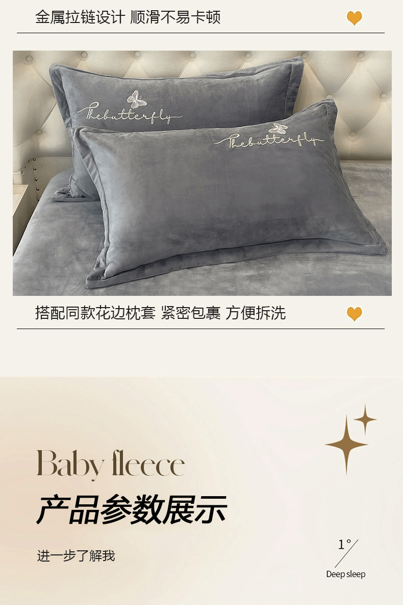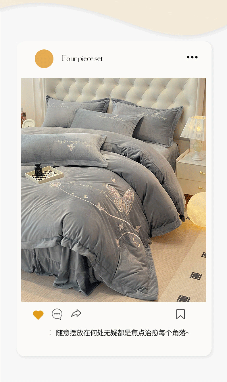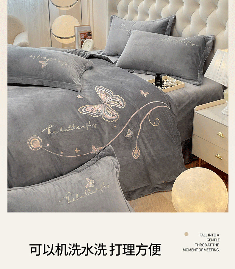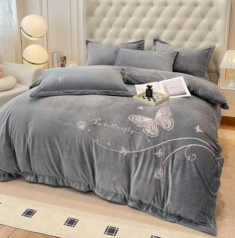 商品名称:艺玲家纺 2025新款婴儿绒高端绣花四件套 蝶舞-灰色