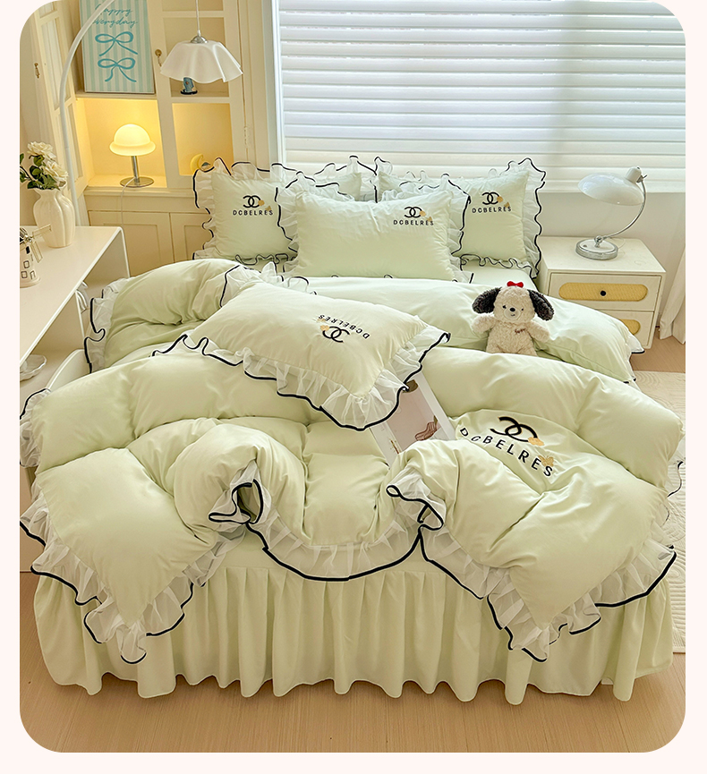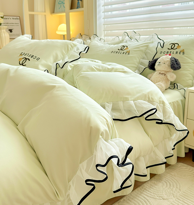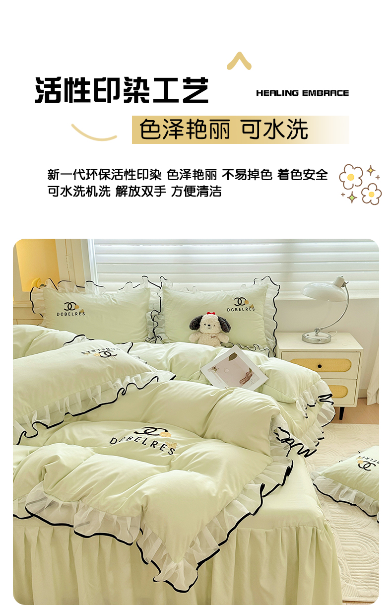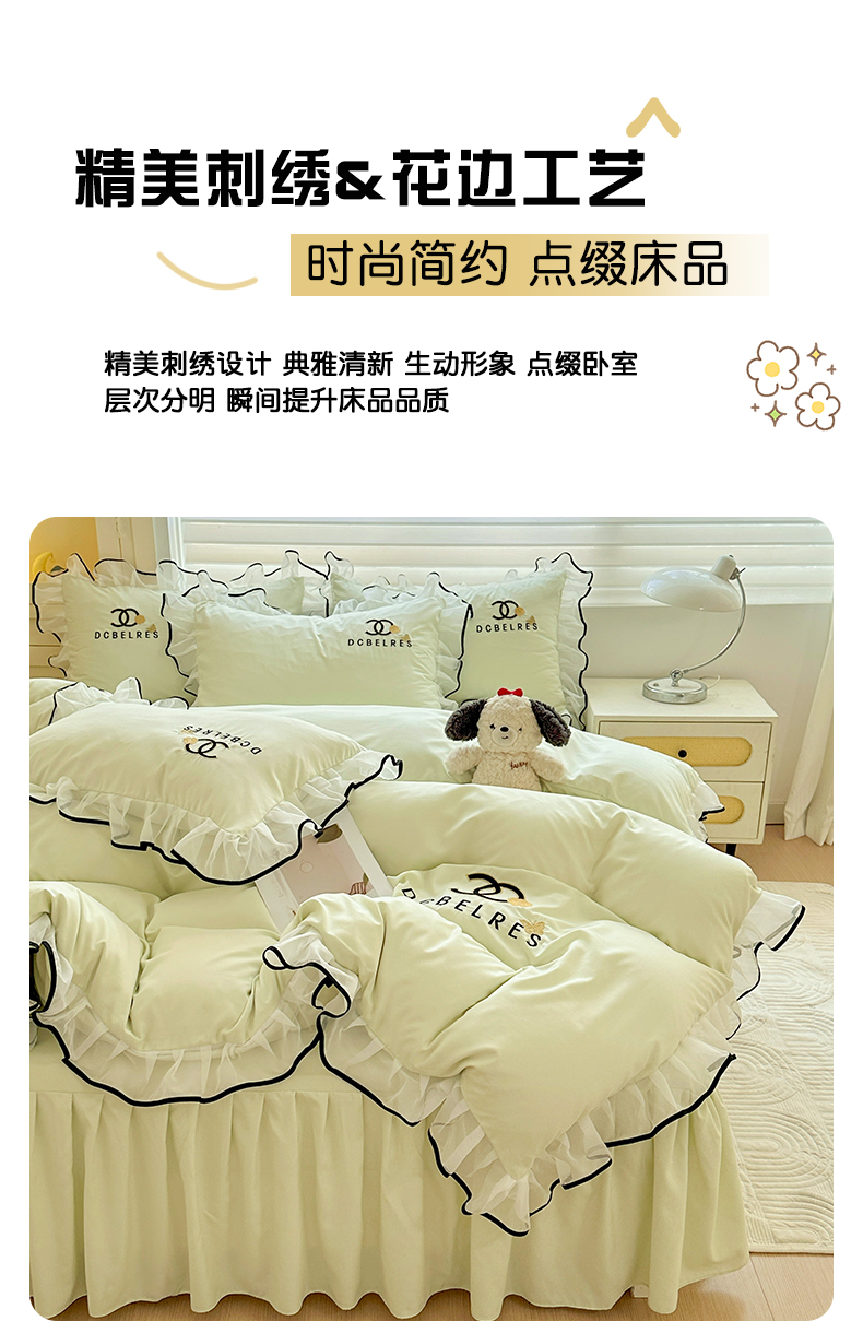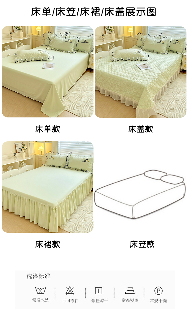 当前位置: 91家纺网 > 商品网购 > 床品套件 > 四件套 > 水洗棉四件套 > 艺玲家纺 2025新款韩版亲肤水洗棉刺绣花边床裙四件套 香香小姐-浅绿