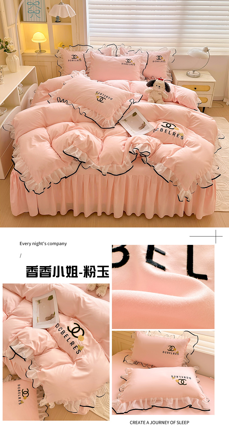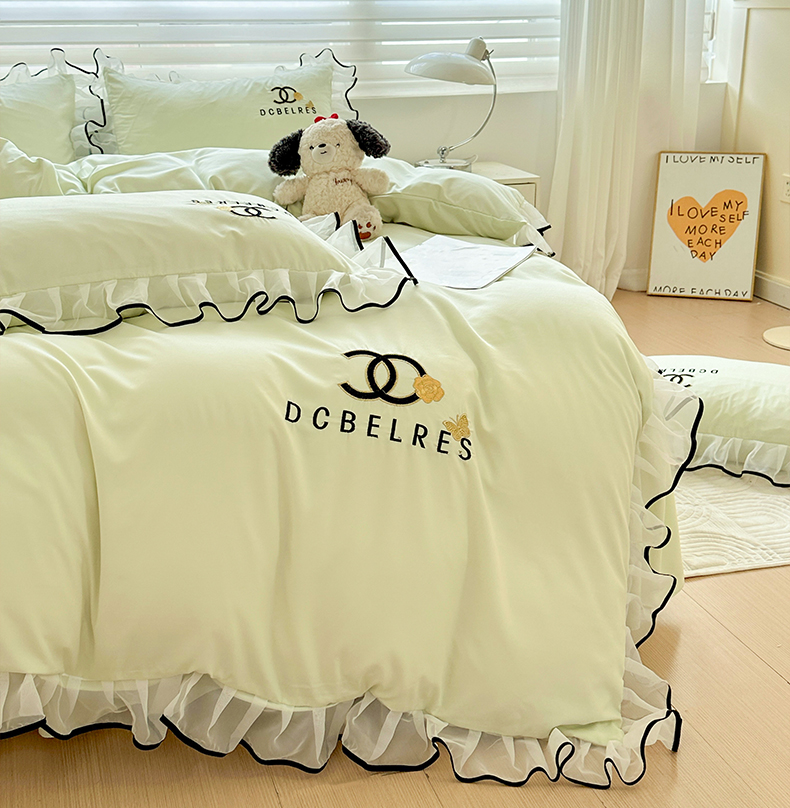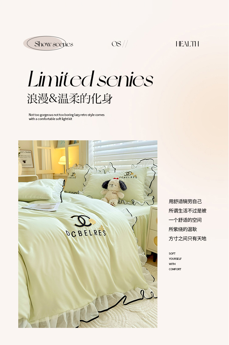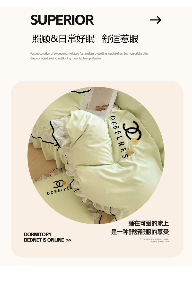当前位置: 91家纺网 > 商品网购 > 床品套件 > 四件套 > 水洗棉四件套 > 艺玲家纺 2025新款韩版亲肤水洗棉刺绣花边床裙四件套 香香小姐-浅绿