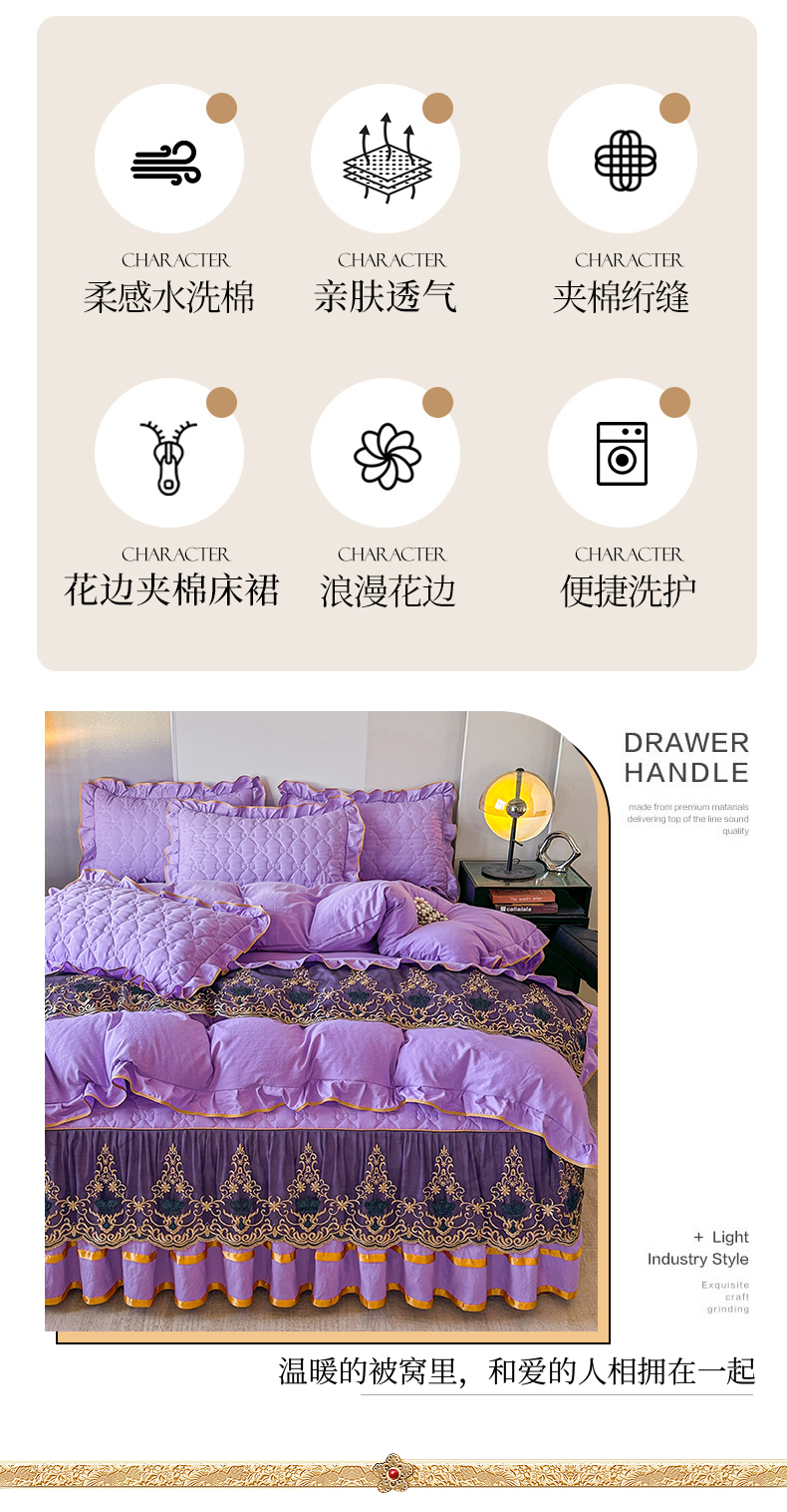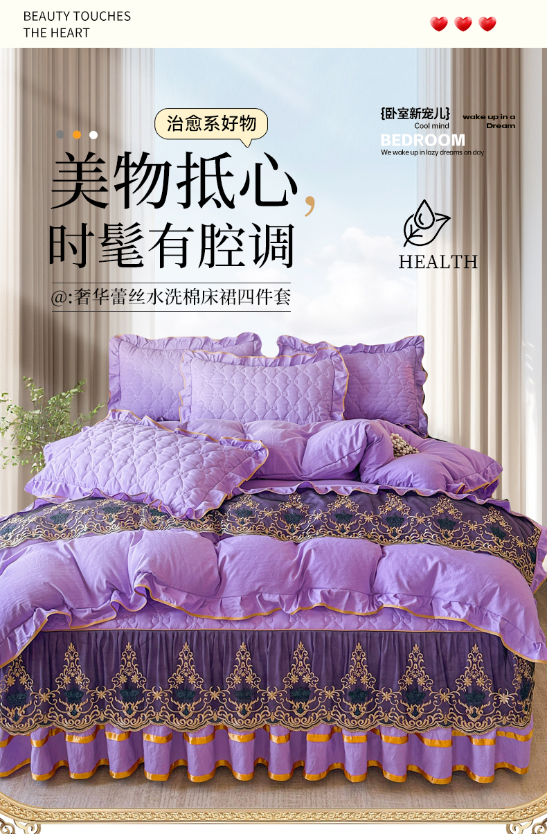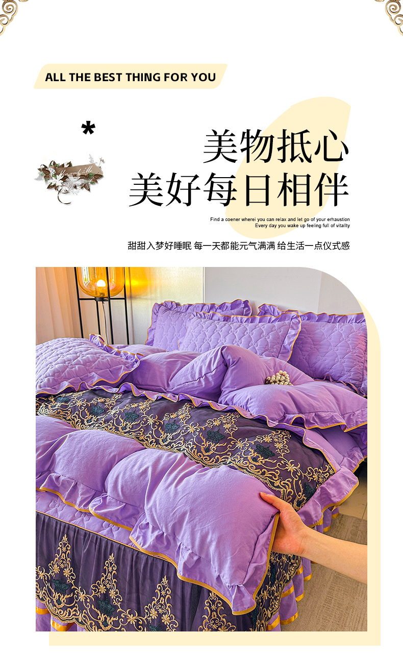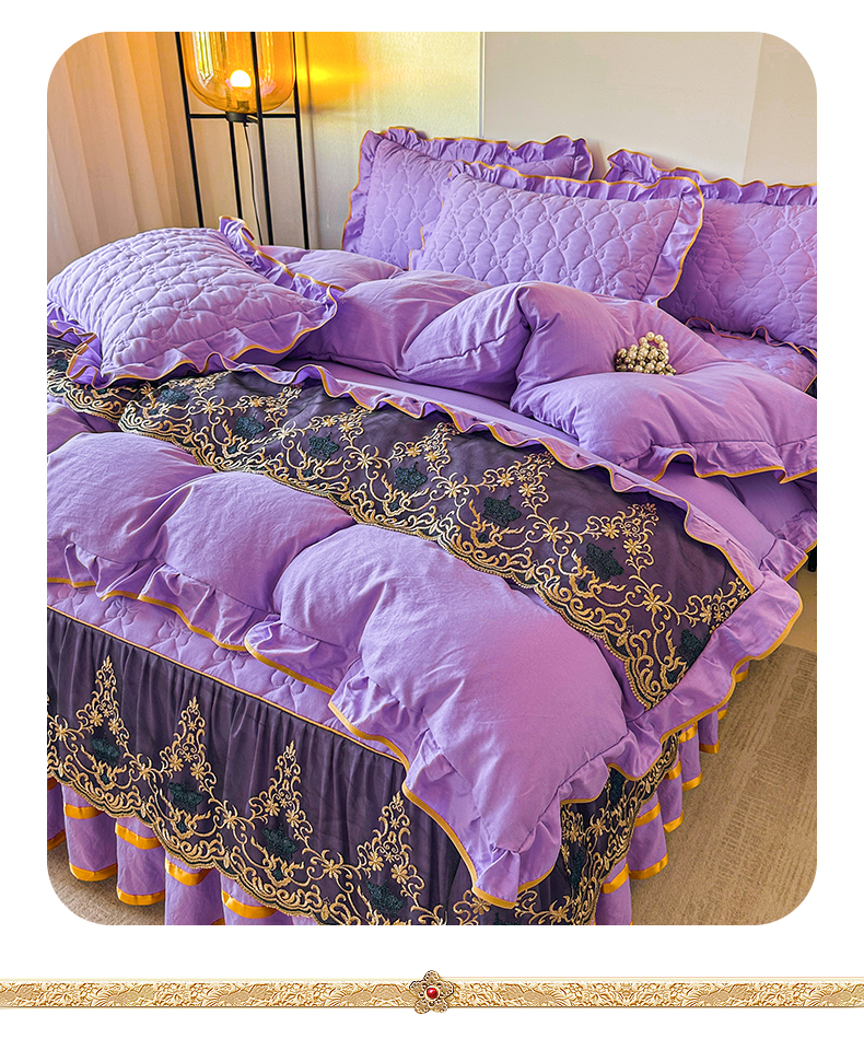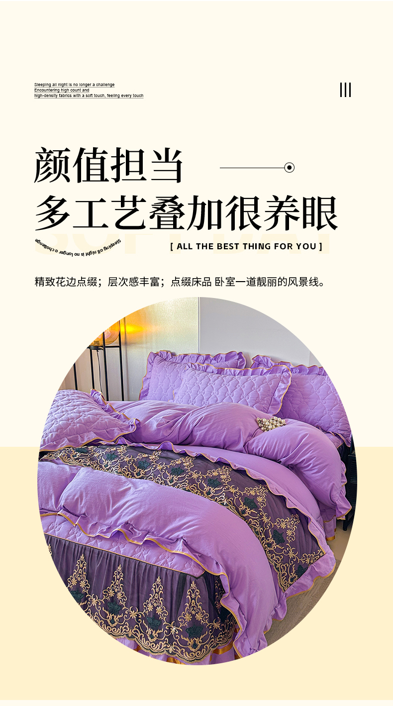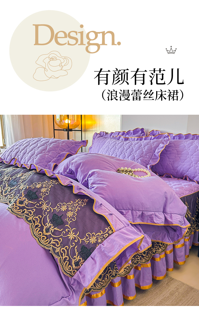 当前位置: 91家纺网 > 商品网购 > 床品套件 > 四件套 > 水洗棉四件套 > 屹成家纺 2025新款水洗棉床裙款四件套-倾城 倾城-浅紫