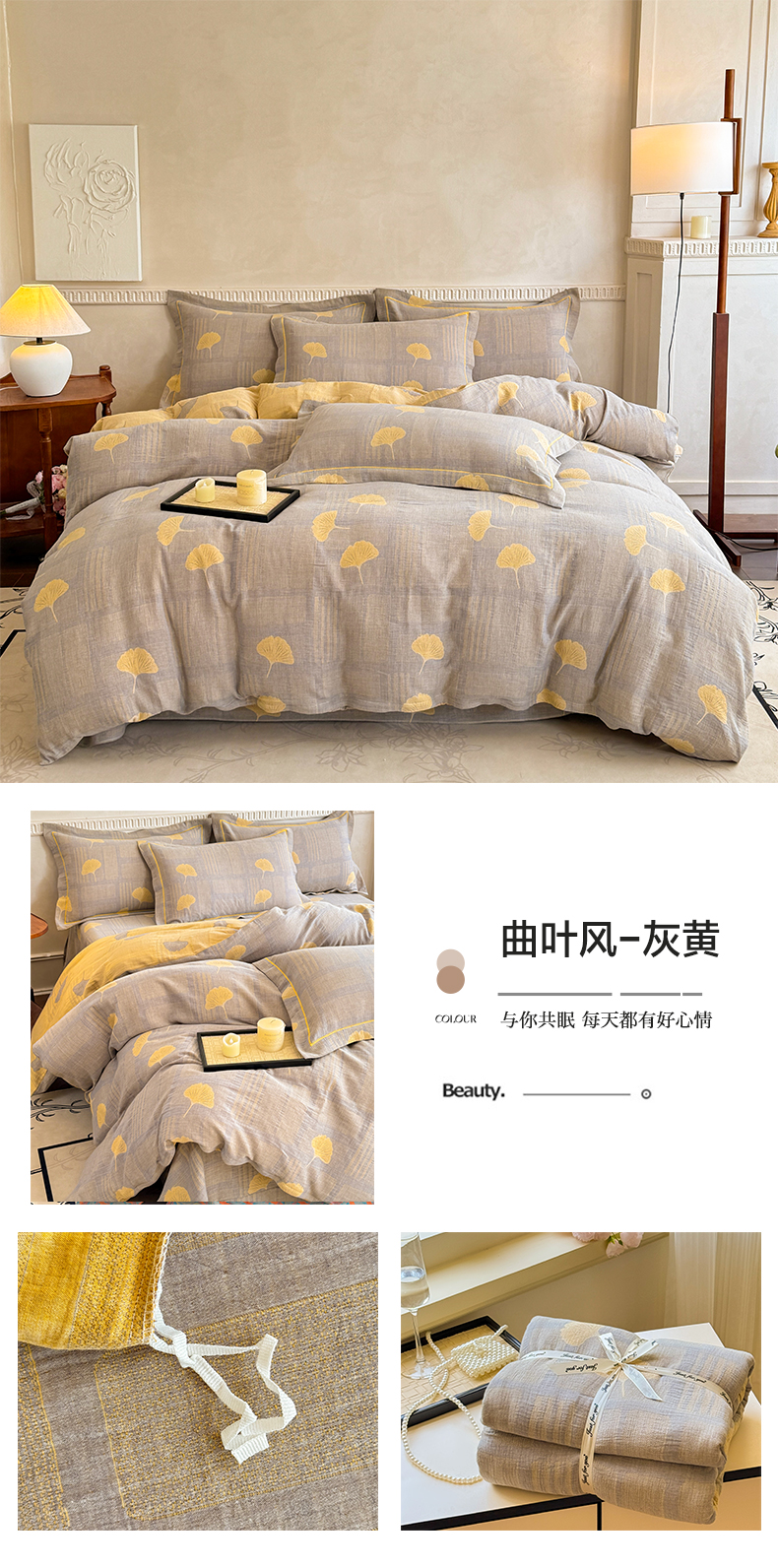 当前位置: 91家纺网 > 商品网购 > 床品套件 > 四件套 > 双层纱四件套 > 江南春家纺 【幻-暖纱】2025新款A类100%全棉色织提花双层纱四件套 【幻-暖纱】曲叶风-灰黄
