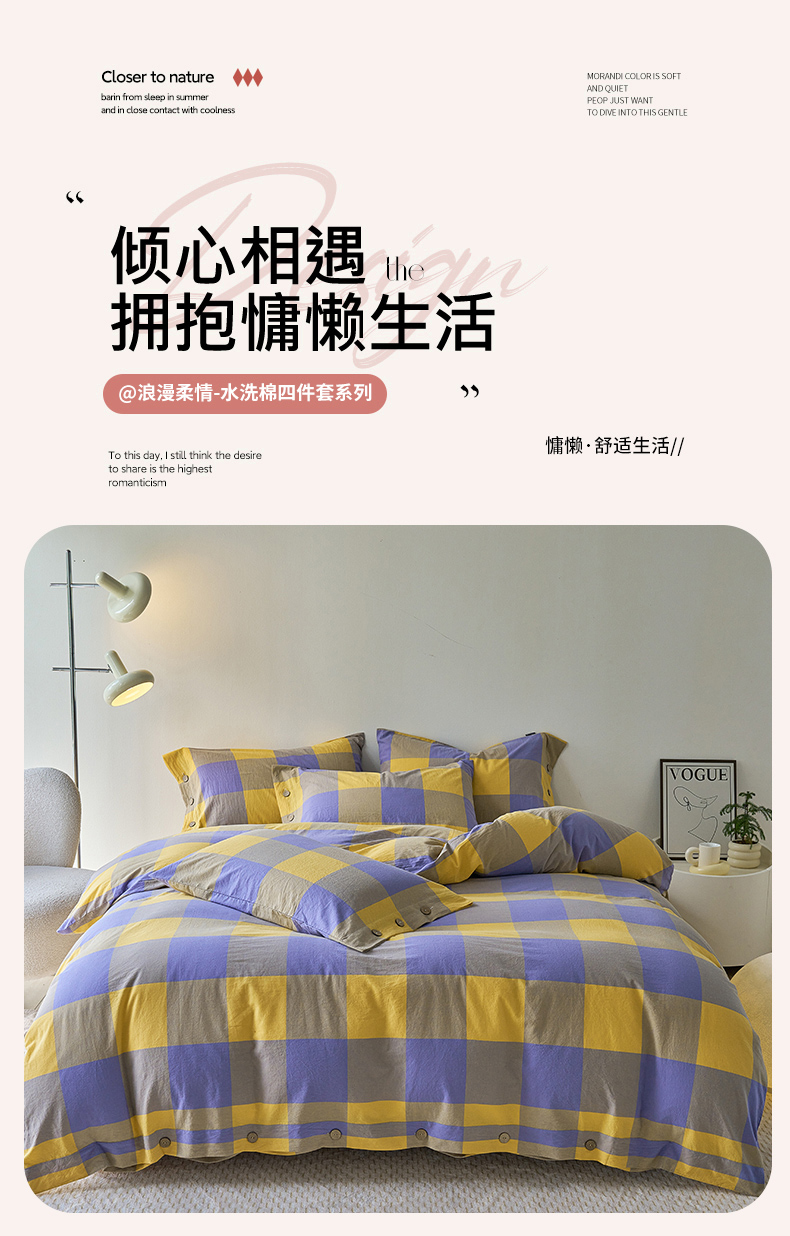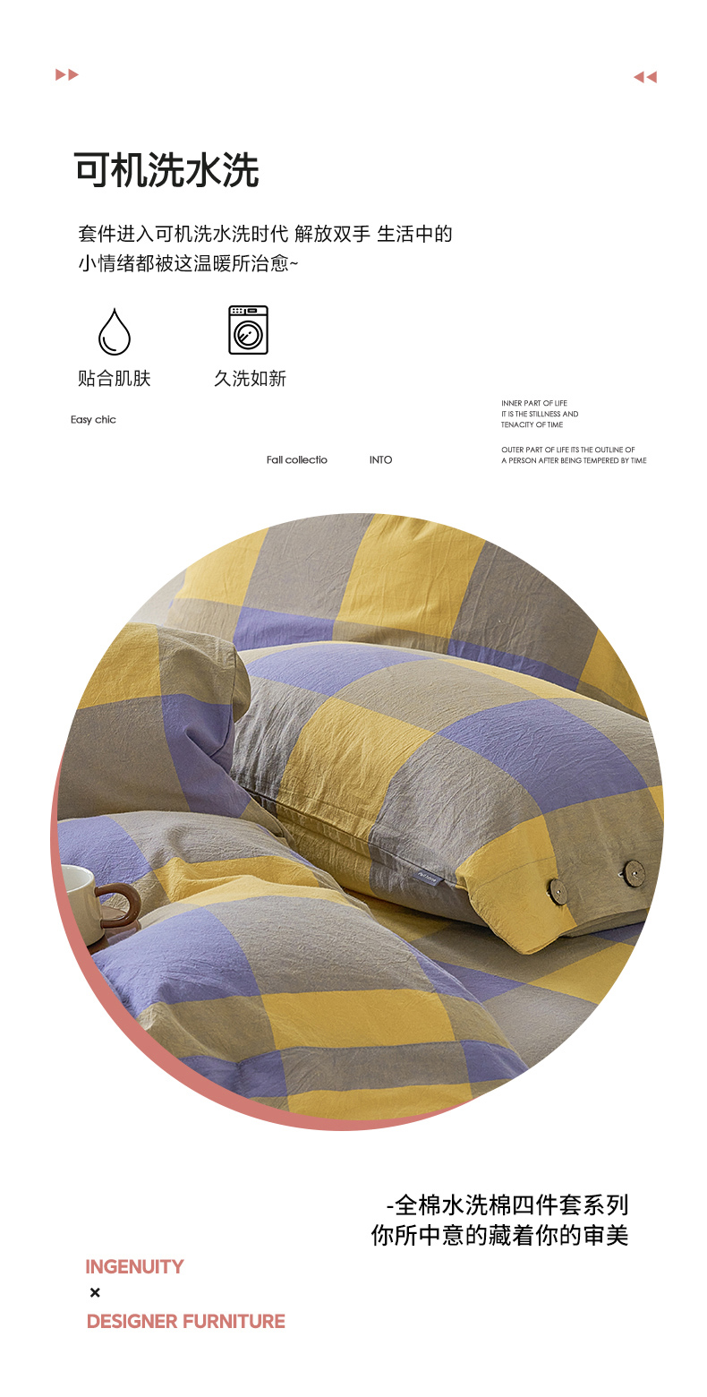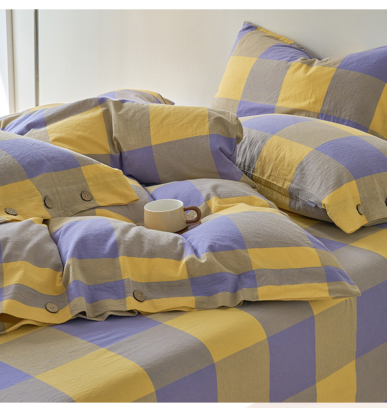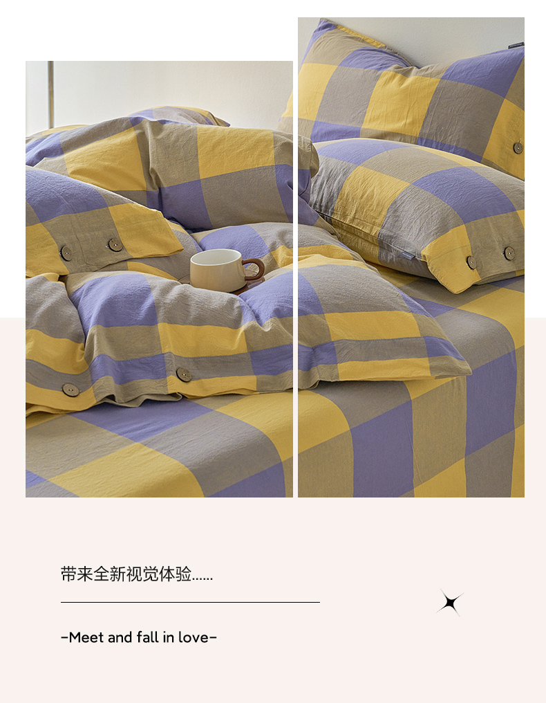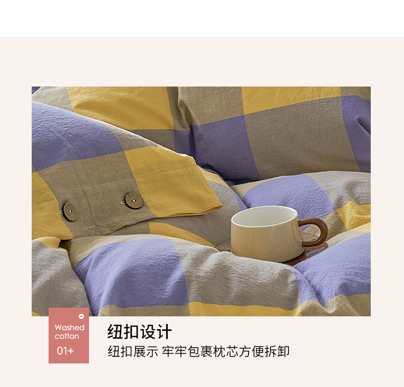 当前位置: 91家纺网 > 商品网购 > 床品套件 > 四件套 > 水洗棉四件套 > 贝尔 PELLHOME 全棉纽扣色织水洗棉格子四件套(可抖音代发) 紫咖大格