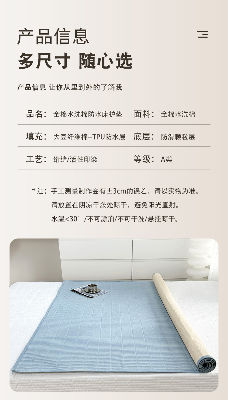 (总)拾小柒 2025新款A类全棉水洗棉床盖防水隔尿床护垫防滑隔脏姨妈垫,粉玉色,鹅黄色,姜黄色,焦糖色,卡其色,牛仔蓝,浅蓝色,浅绿色,青灰色,组合图