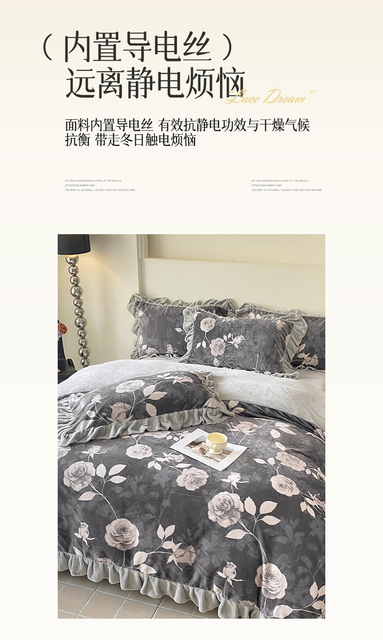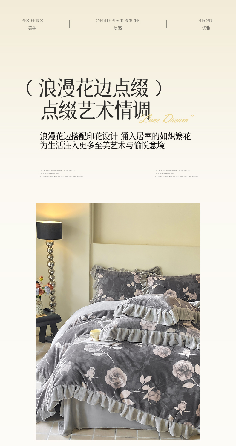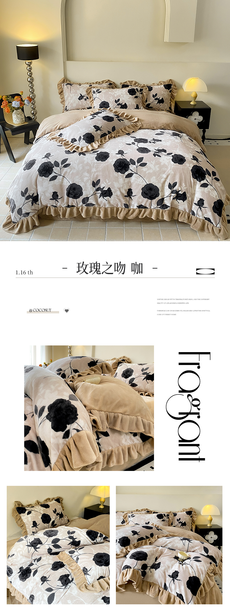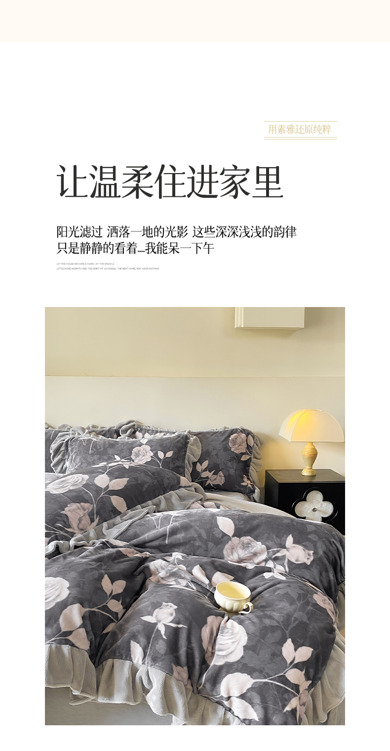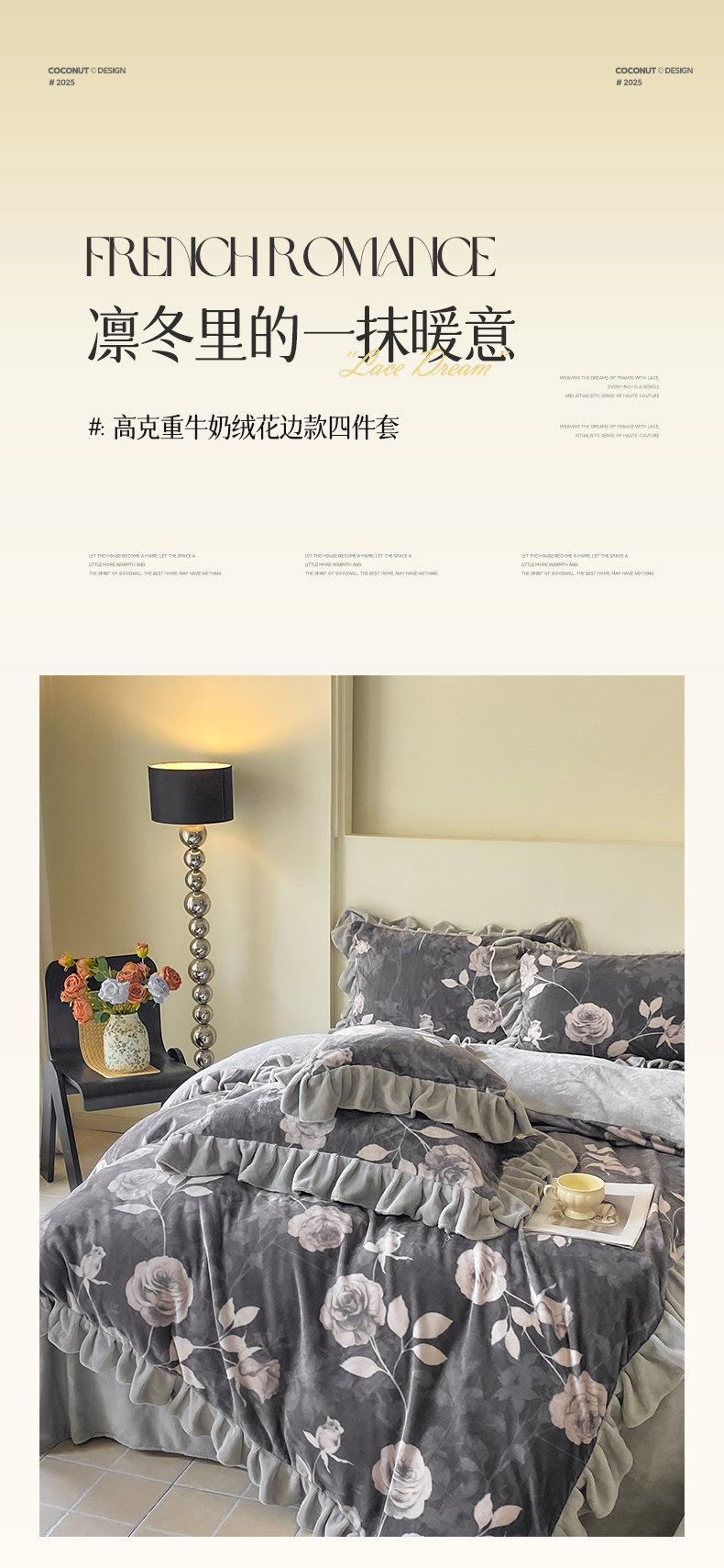 当前位置: 91家纺网 > 商品网购 > 床品套件 > 四件套 > 牛奶绒四件套 > 慕希家纺 2025新款高克重牛奶绒花边款四件套 玫瑰之吻-米