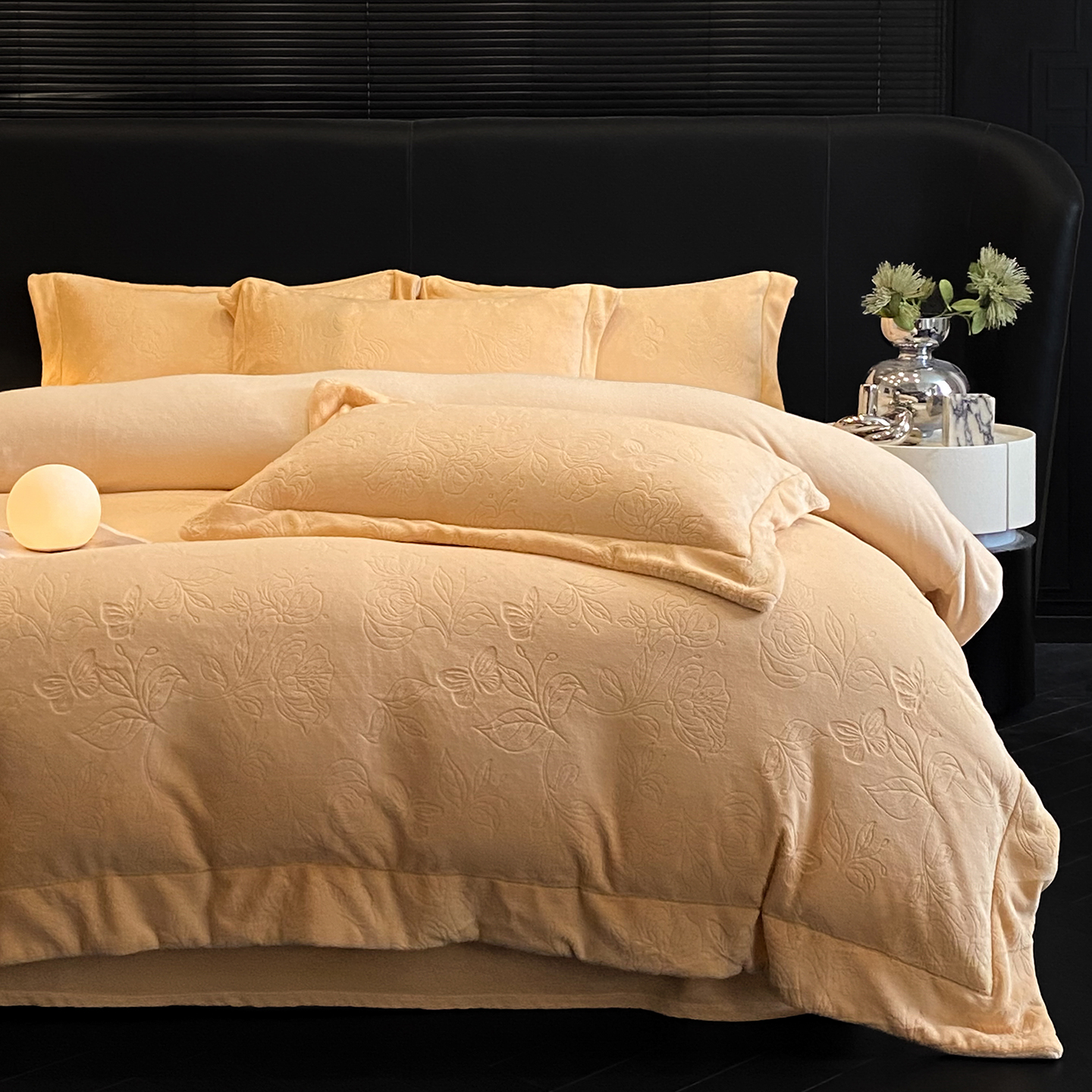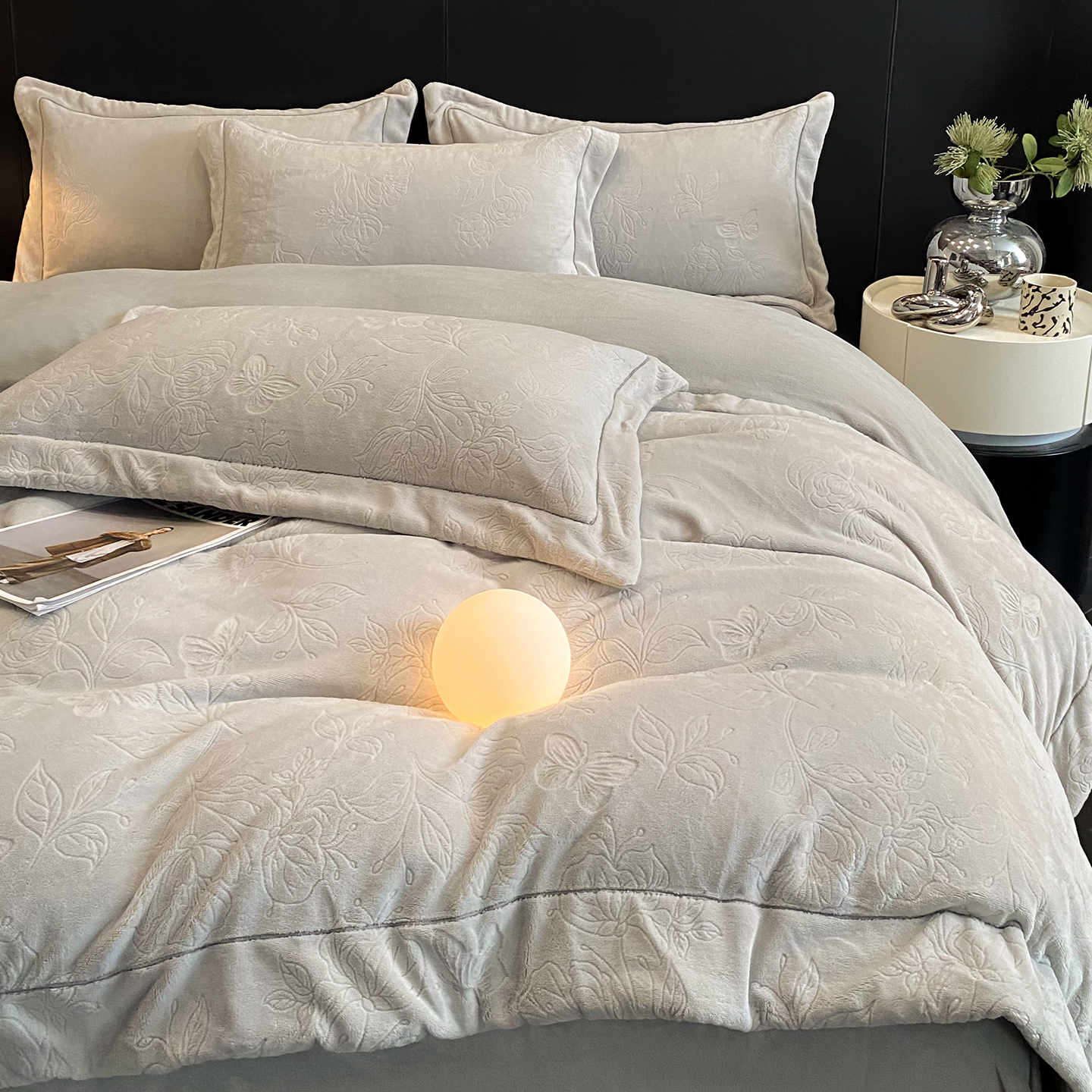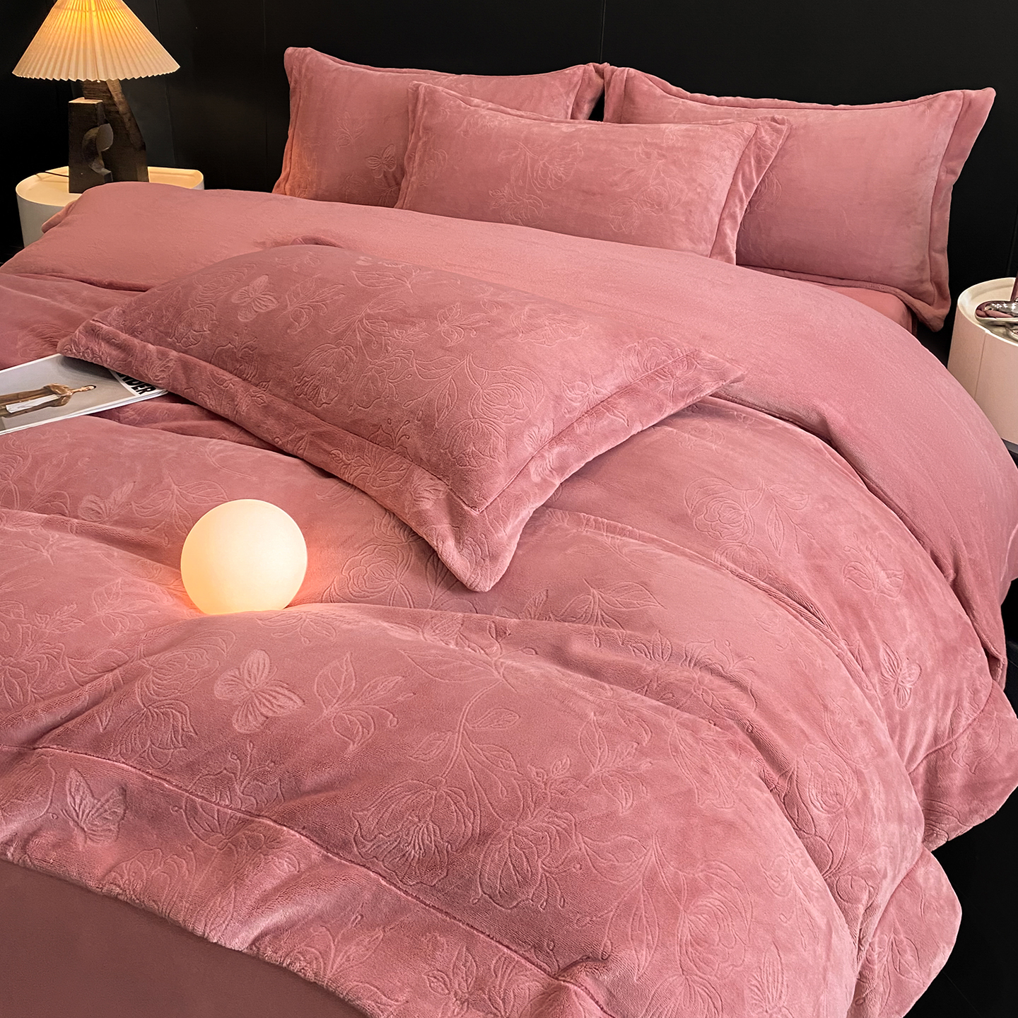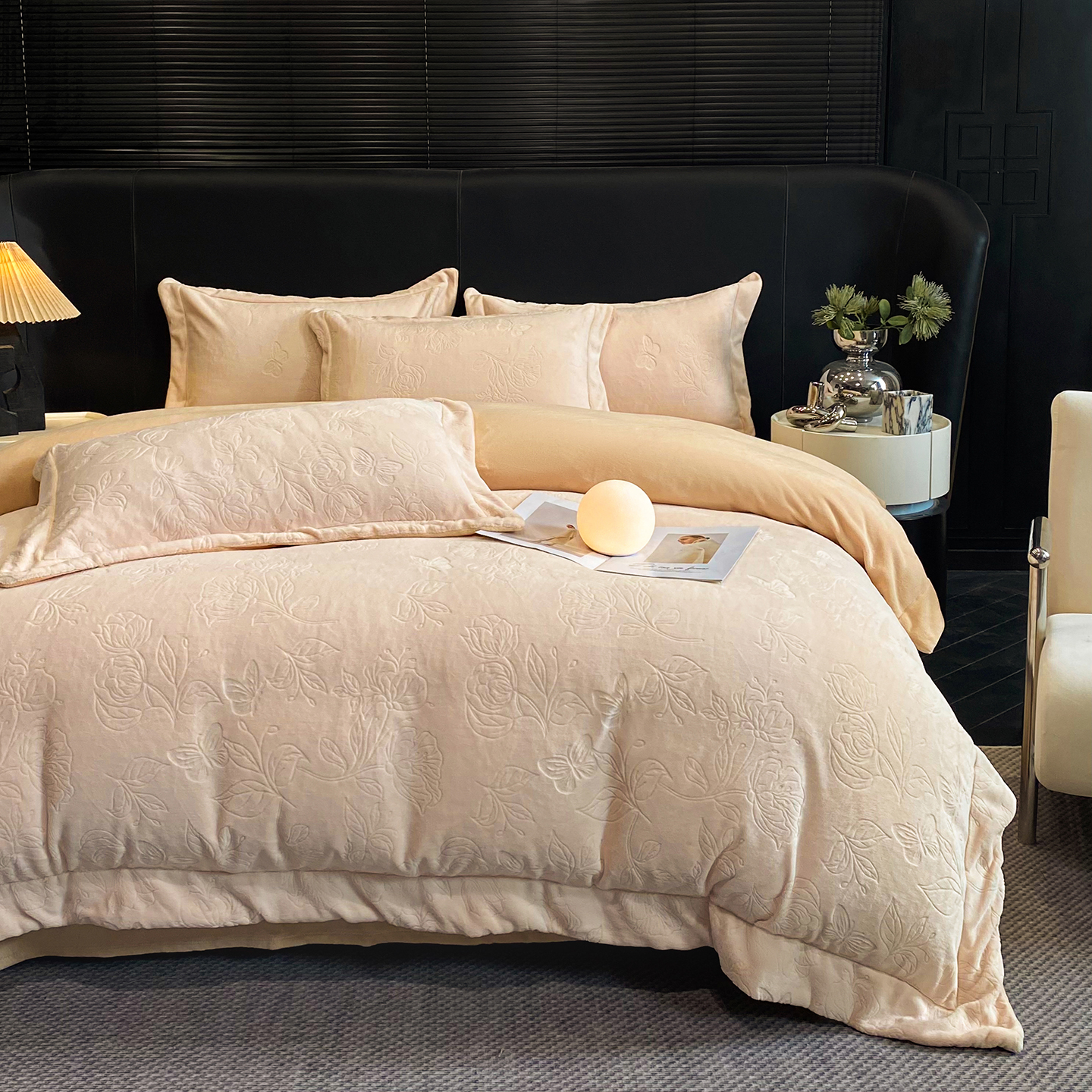 商品名称:(总)控价 专版花型 2025年新款240克9.2斤全消光A类烂花牛奶绒四件套-蝴蝶戏花