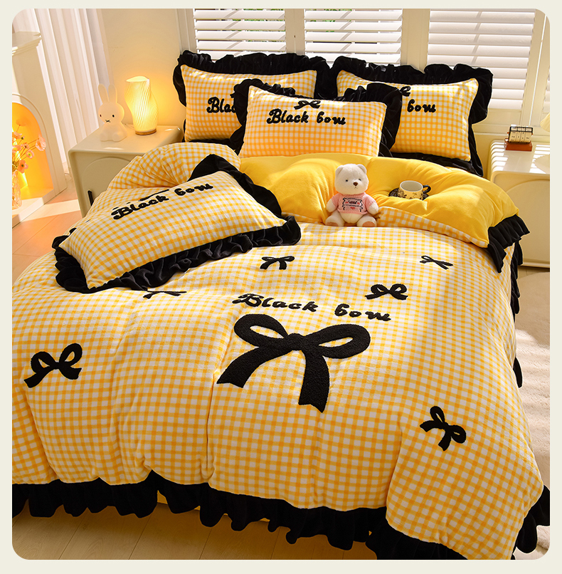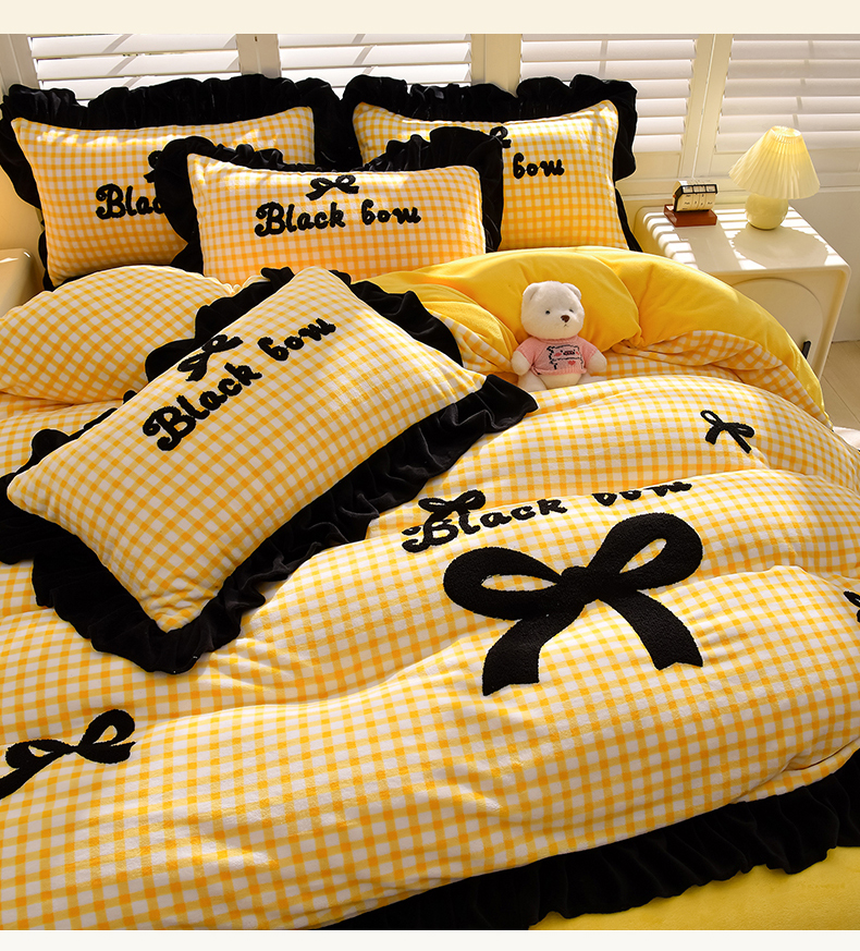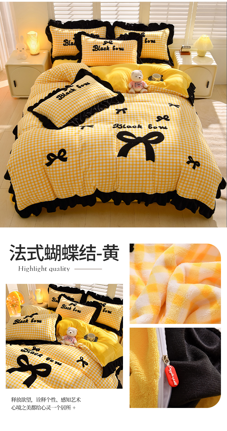 商品名称:炫拼家纺 2025新款法式蝴蝶结毛巾绣韩版加厚小格子花边牛奶绒四件套 法式蝴蝶结-黄