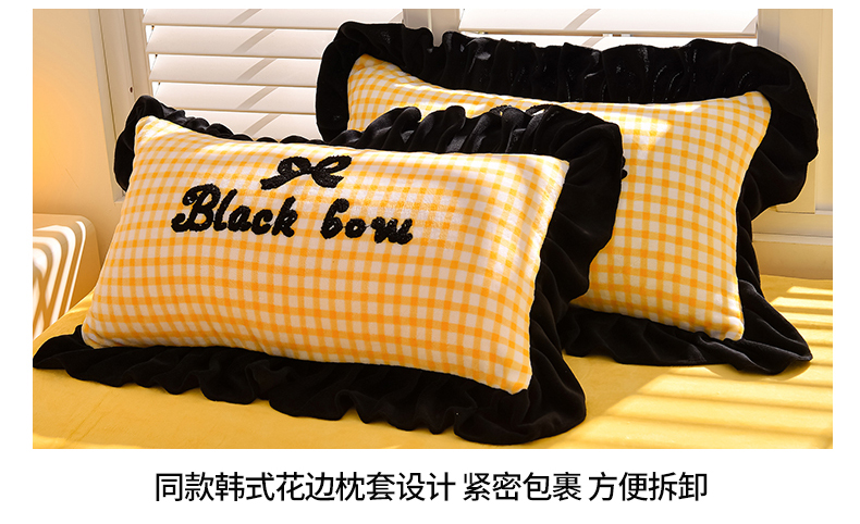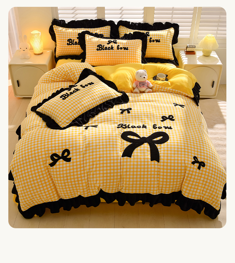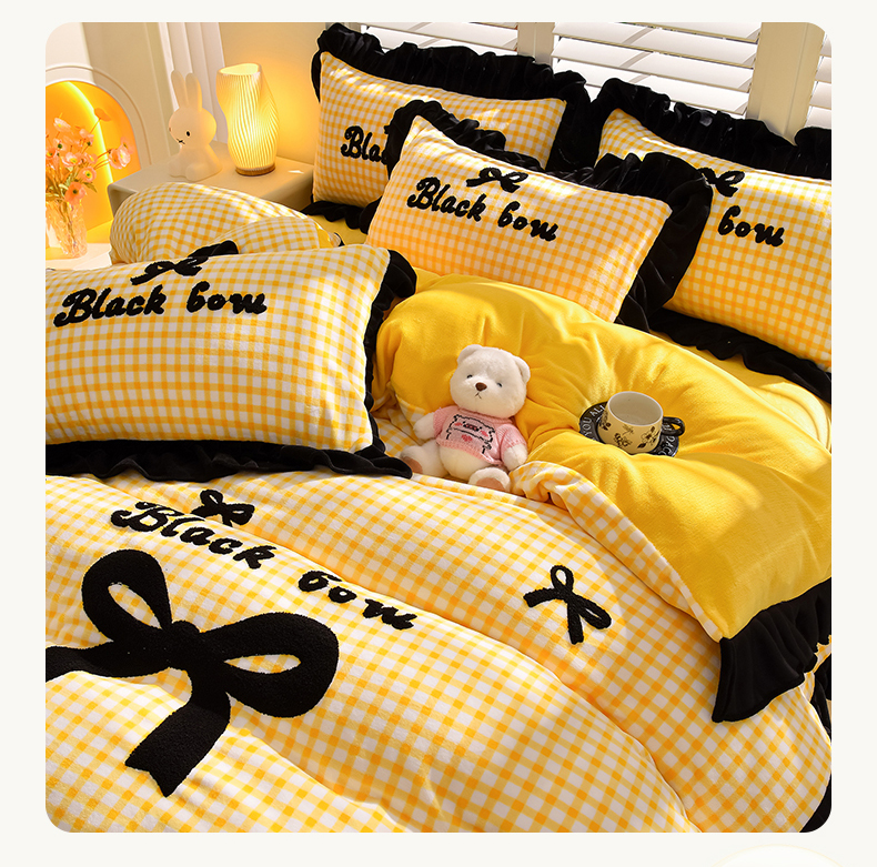 炫拼家纺 2025新款法式蝴蝶结毛巾绣韩版加厚小格子花边牛奶绒四件套 法式蝴蝶结-黄