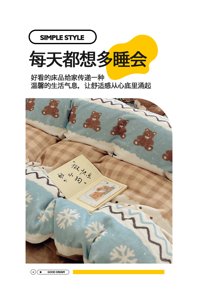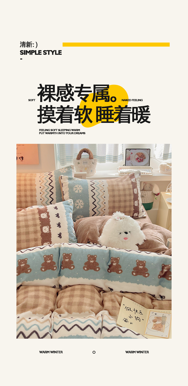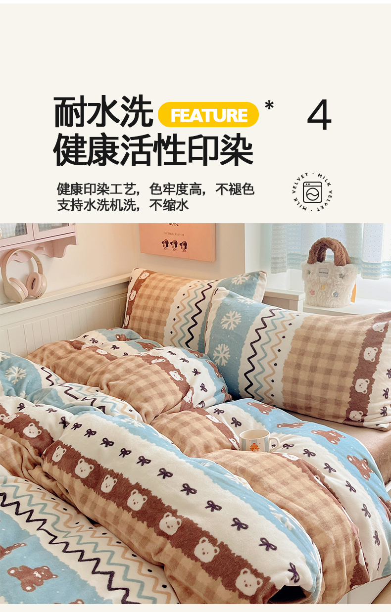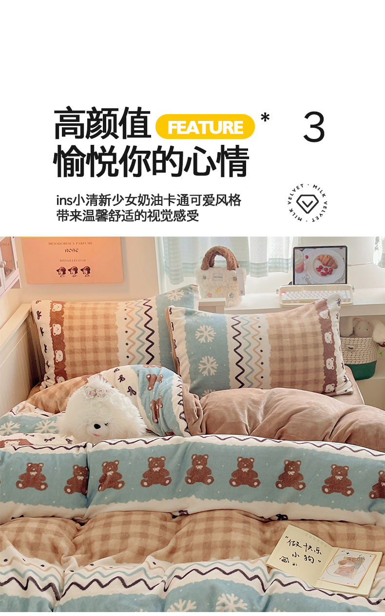 金爱家 2025新款A类ins小清新少女奶油卡通可爱加厚牛奶绒四件套 绒-菲尔岛小熊