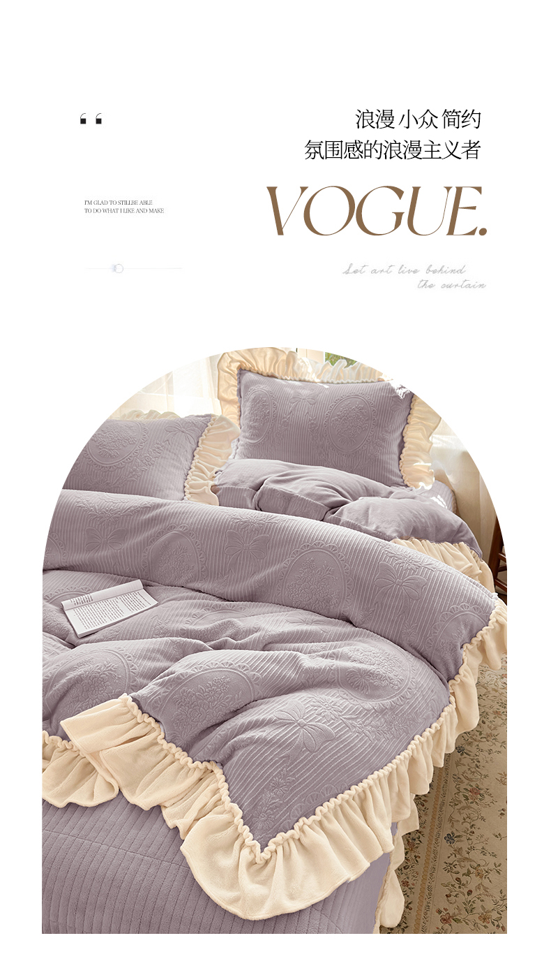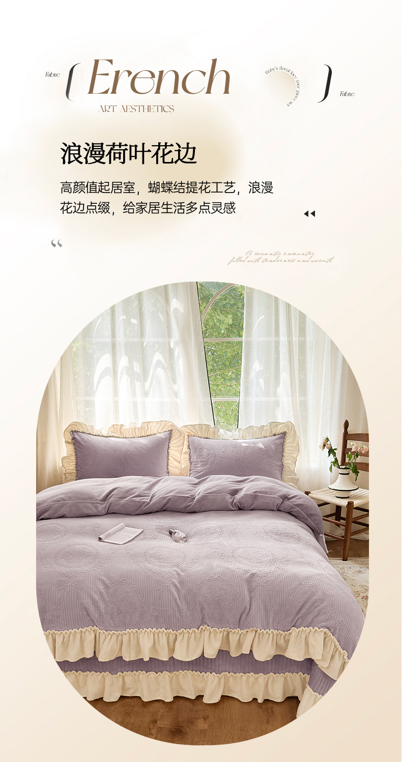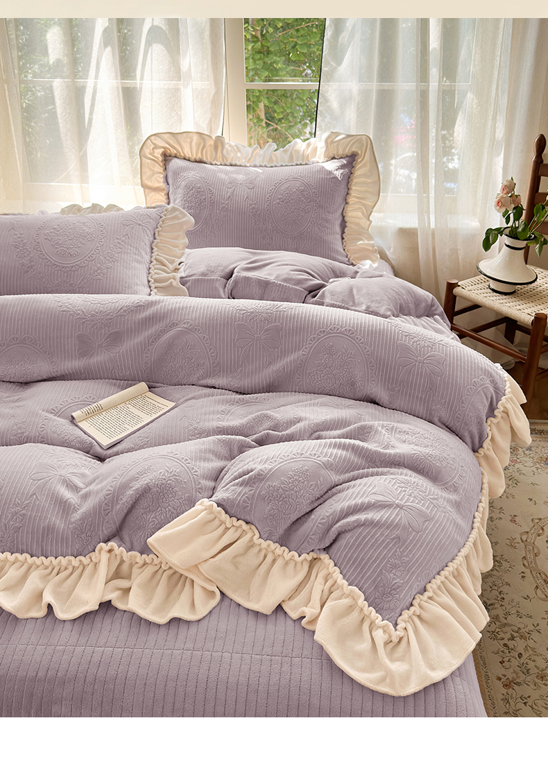当前位置: 91家纺网 > 商品网购 > 床品套件 > 四件套 > 牛奶绒四件套 > 乐野家居 2025年新款轻法式甜心蝴蝶结高克重提花牛奶绒床盖四件套 甜心蝴蝶结-紫