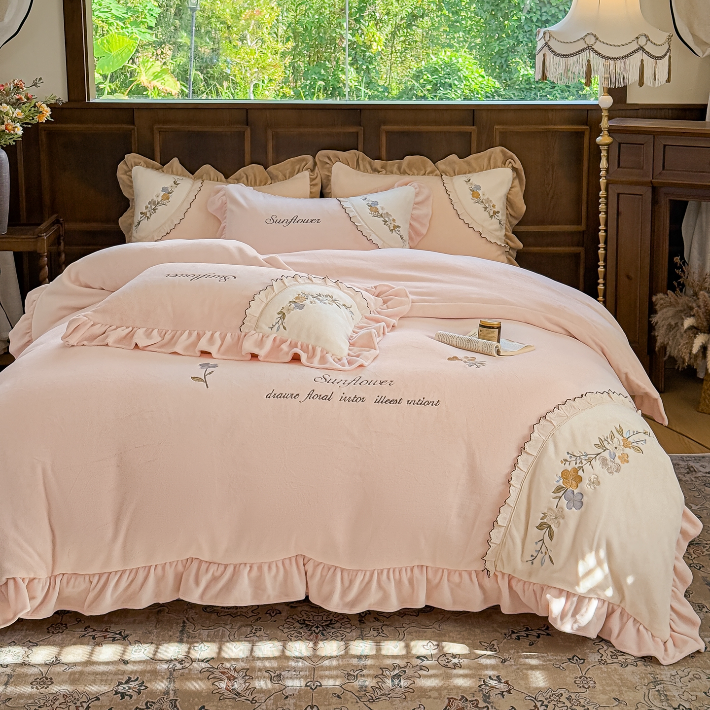 阿那亚 2025新款加厚煦暖绒牛奶绒四件套韩版花边四件套刺绣四件套 繁华粉