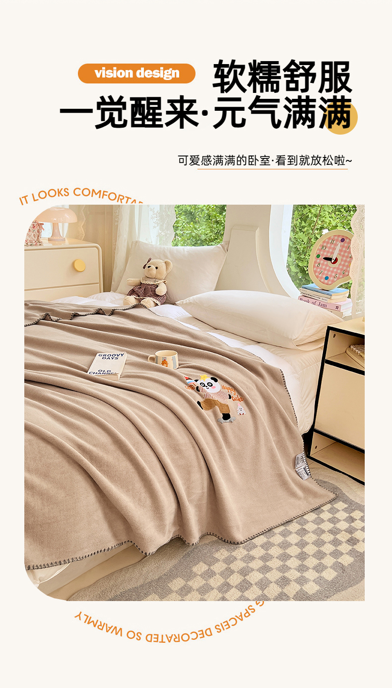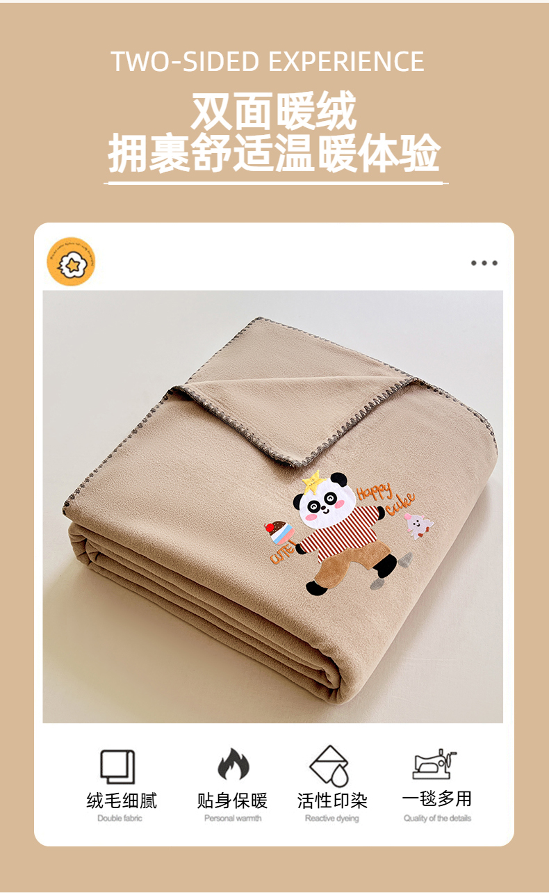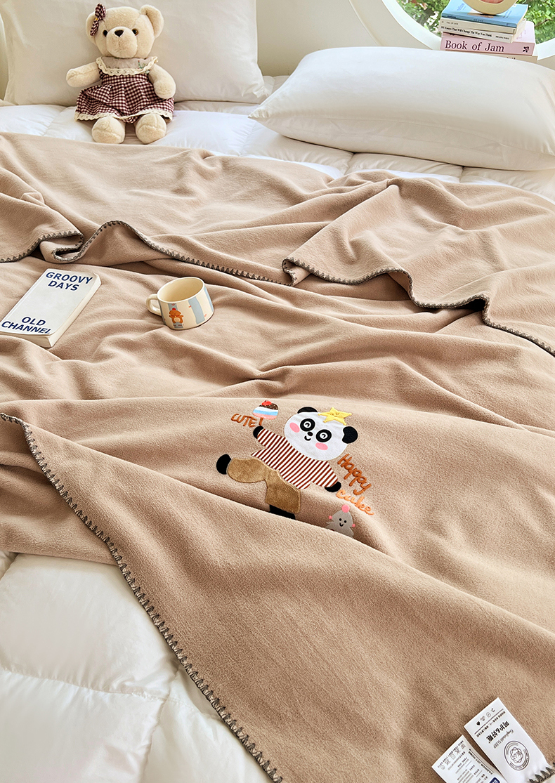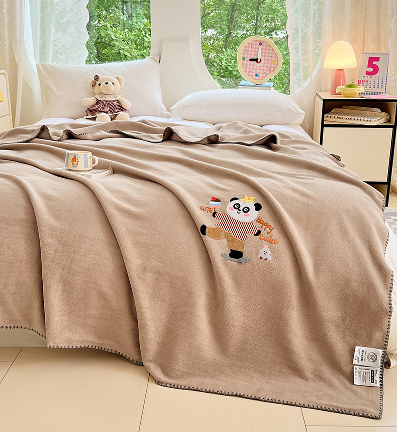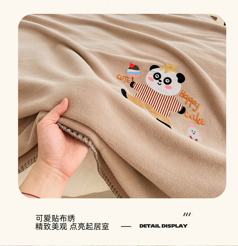 凯轩毛毯网销专供 2025新款仿羊绒贴布绣毛毯毯子 欢乐熊猫-咖