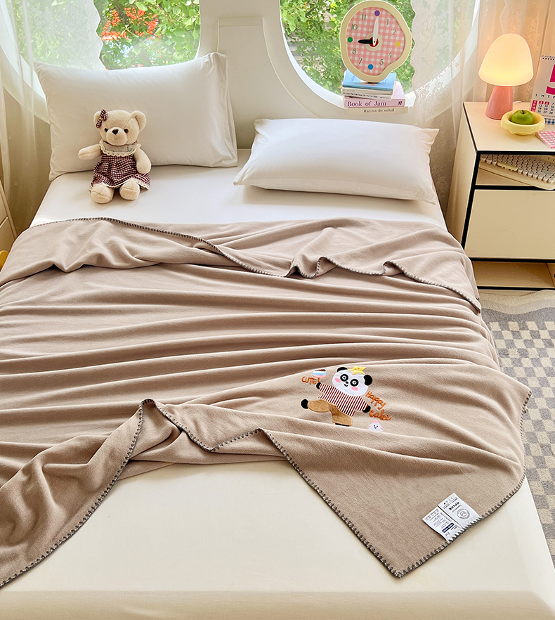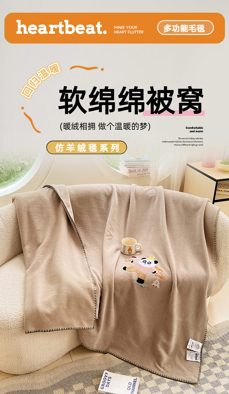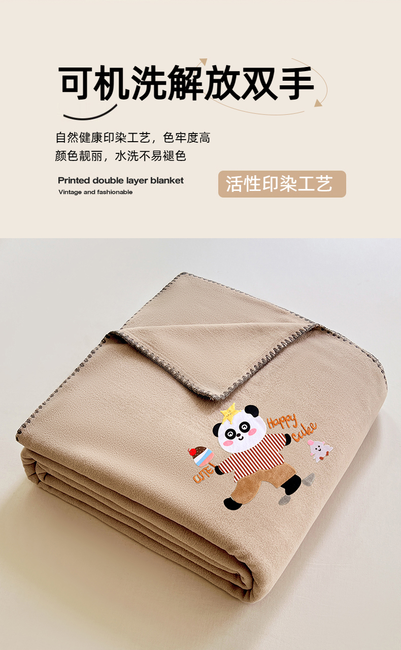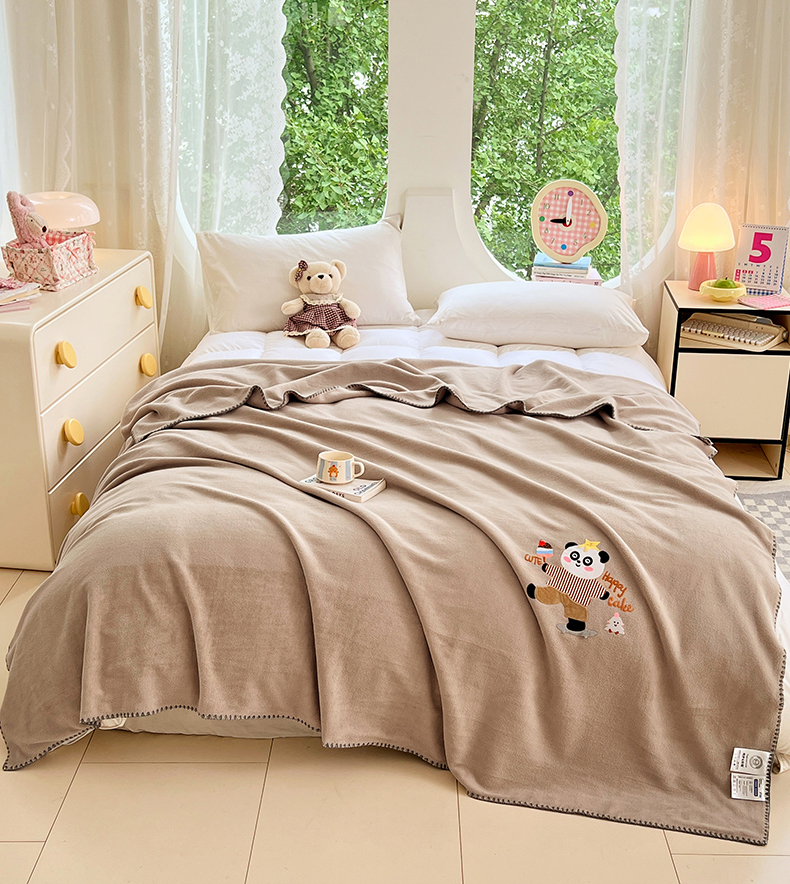 凯轩毛毯网销专供 2025新款仿羊绒贴布绣毛毯毯子 欢乐熊猫-咖