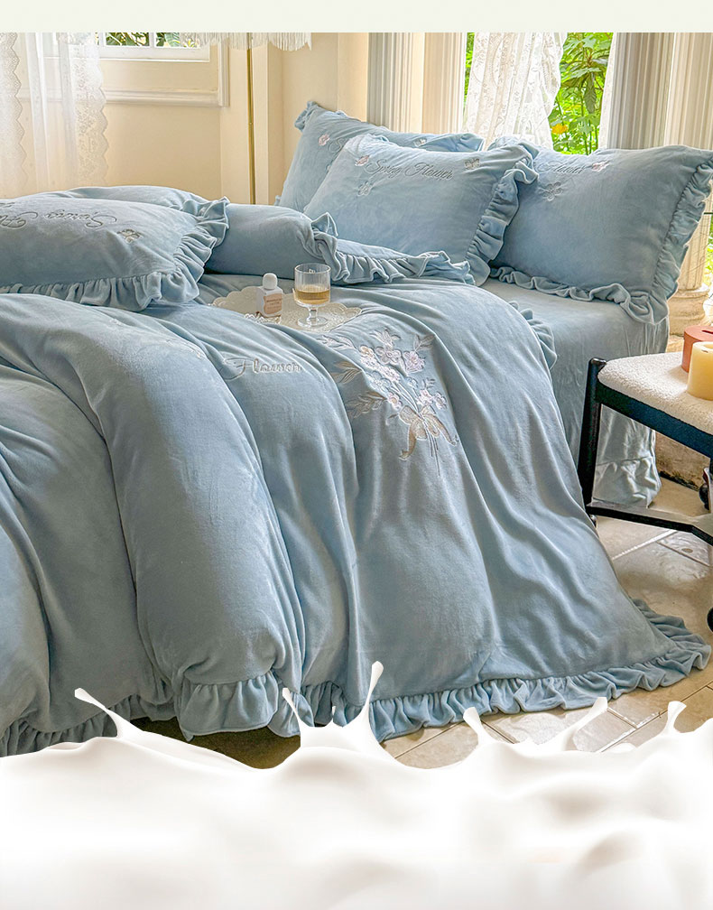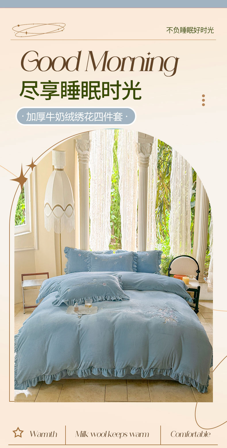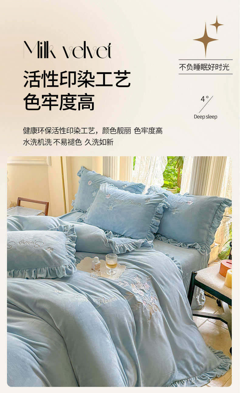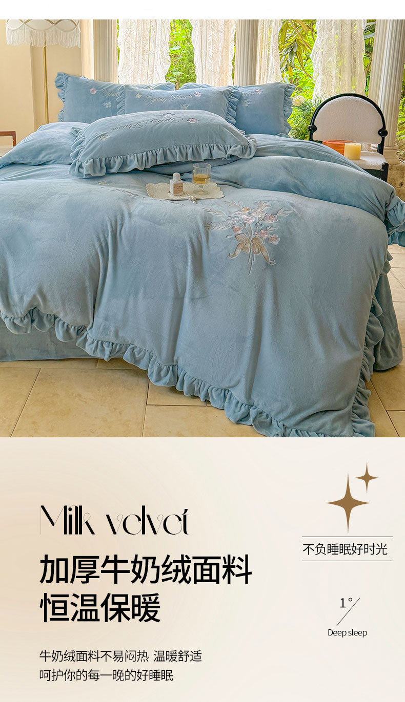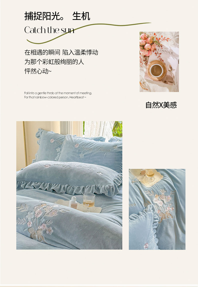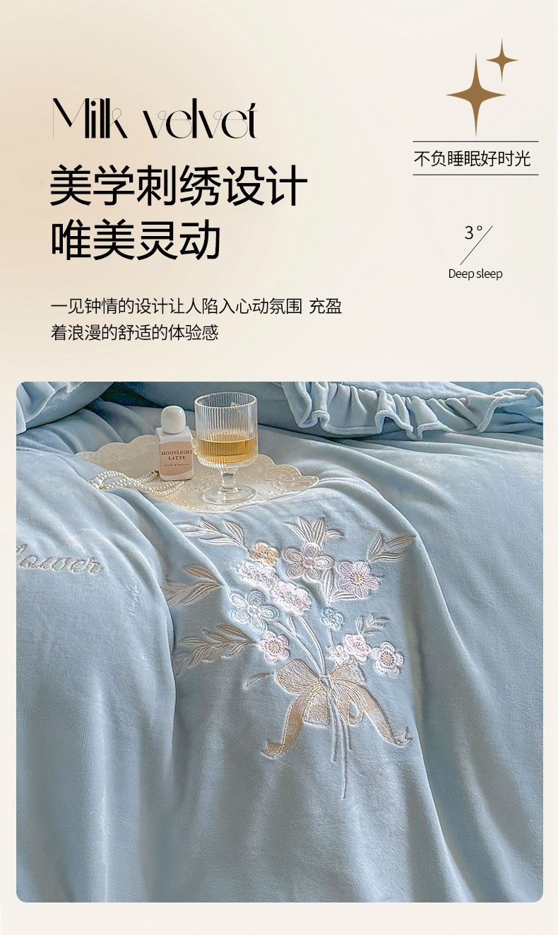 美洲琳 2025新款高克重牛奶绒绣花四件套 手捧花-浅蓝