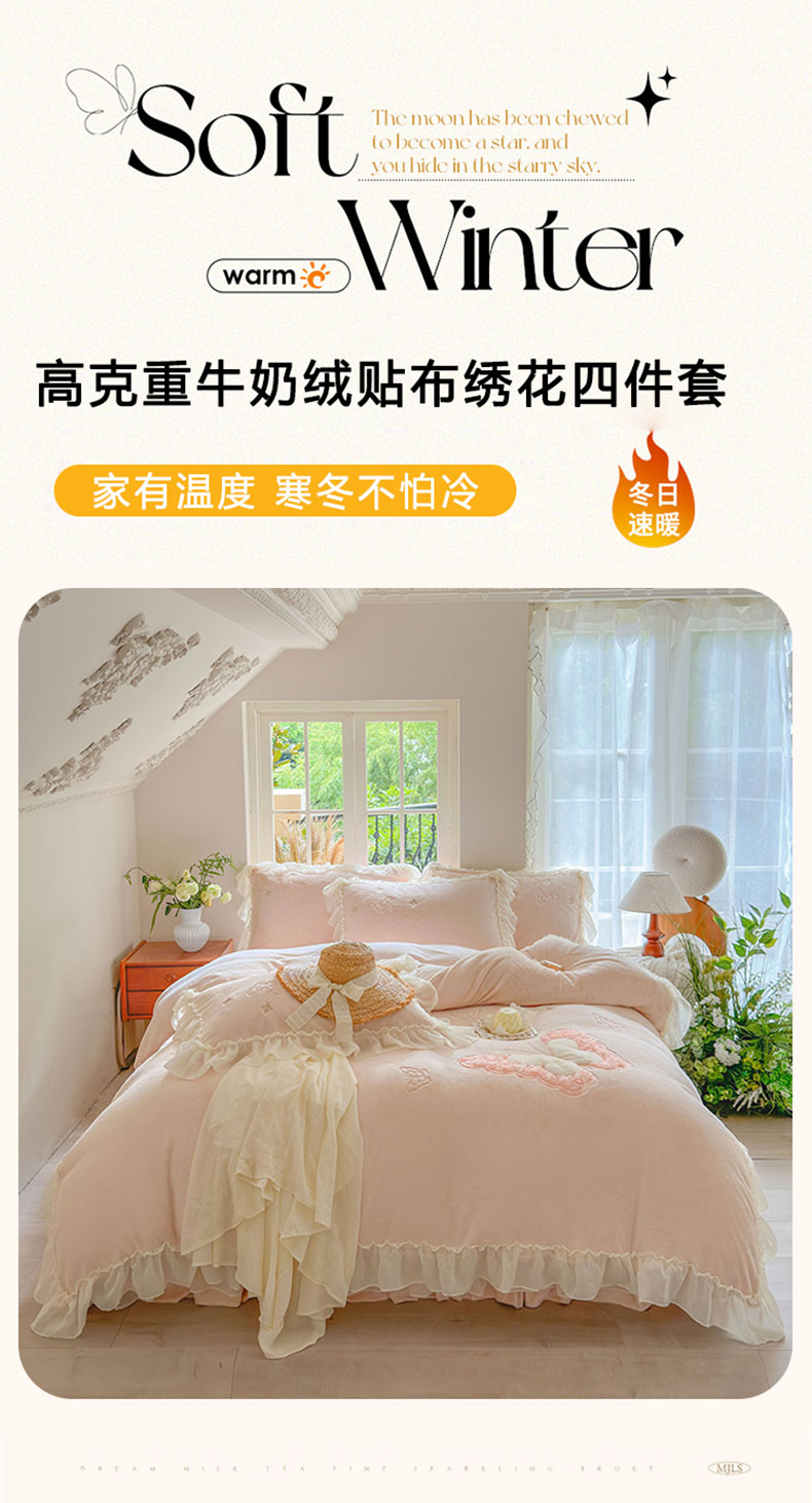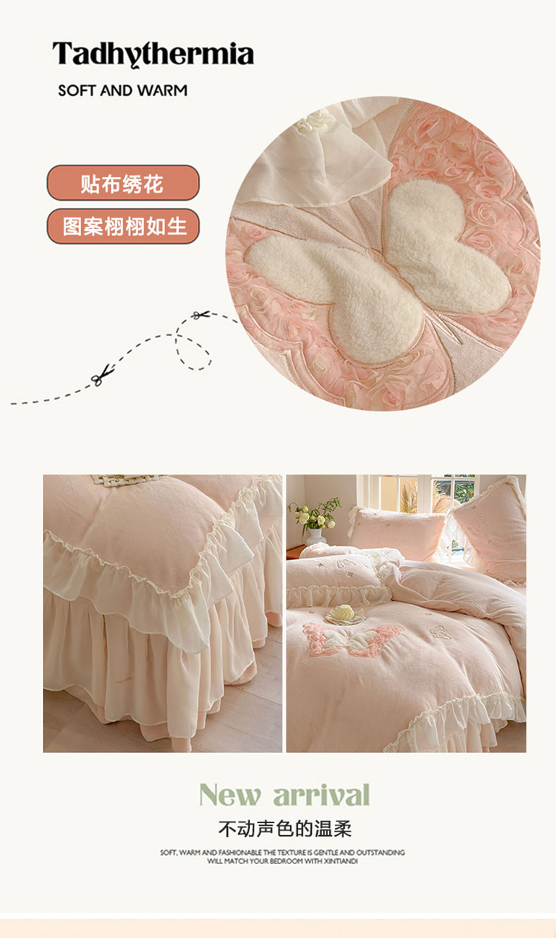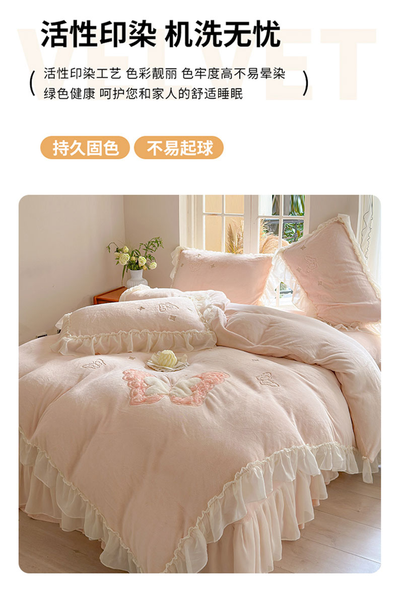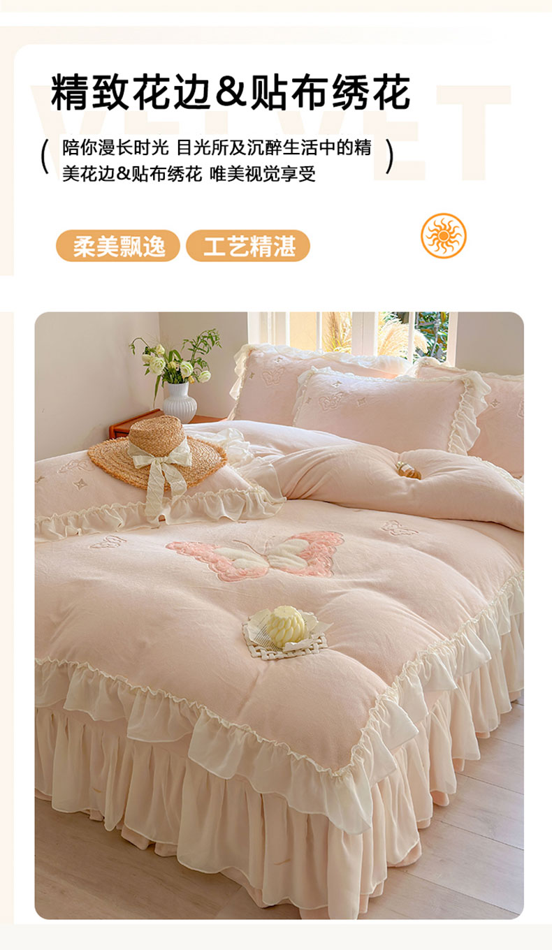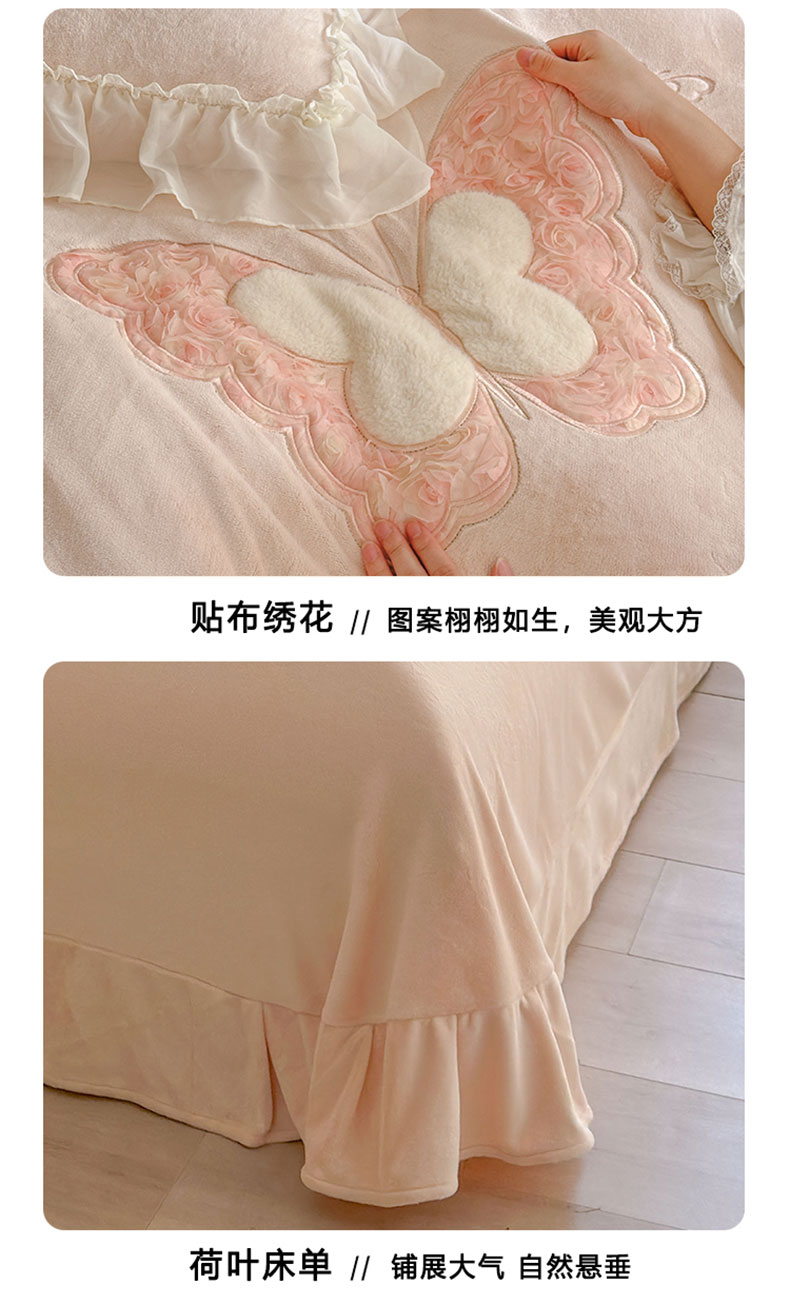 商品名称:美洲琳 2025新款高克重全消光贴布绣花牛奶绒四件套 蝴蝶-浅粉