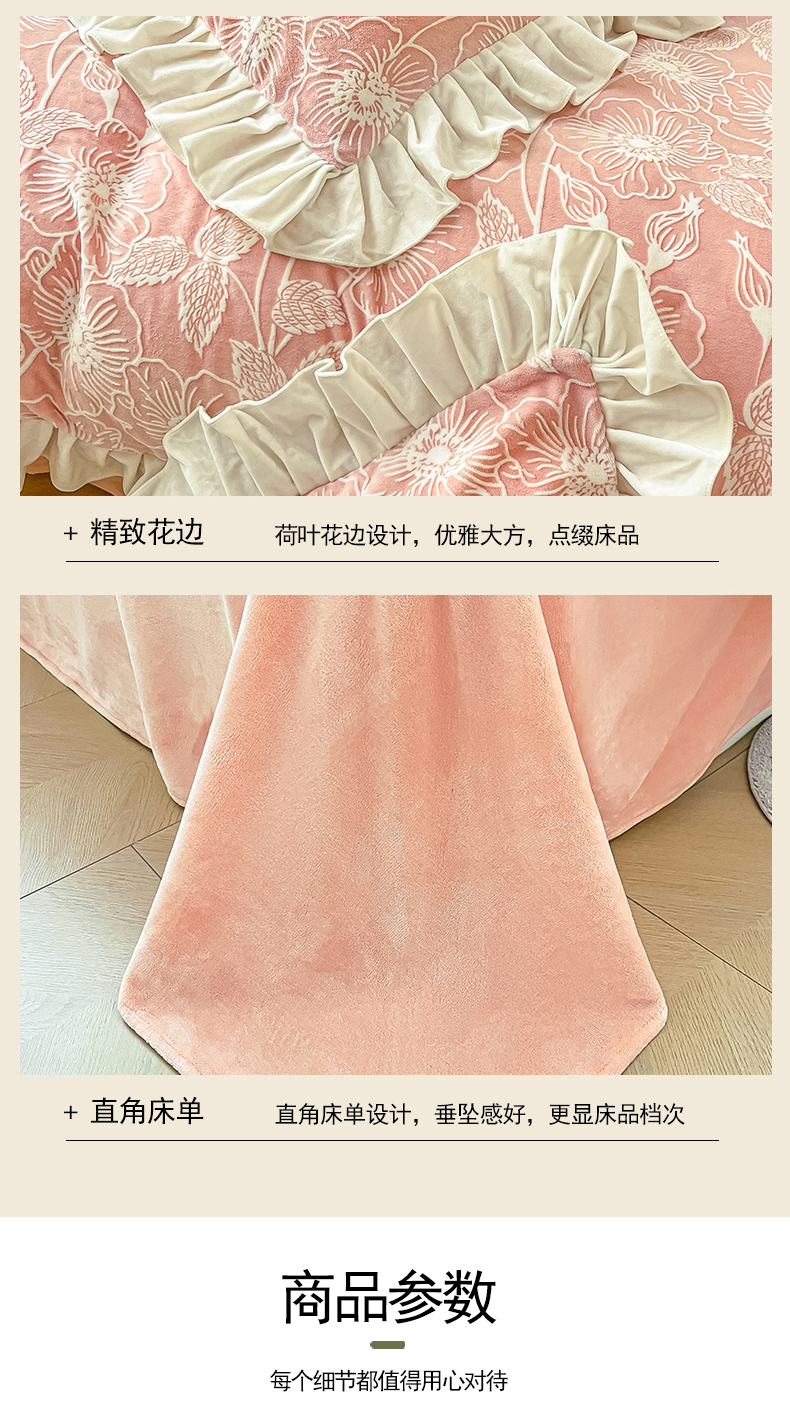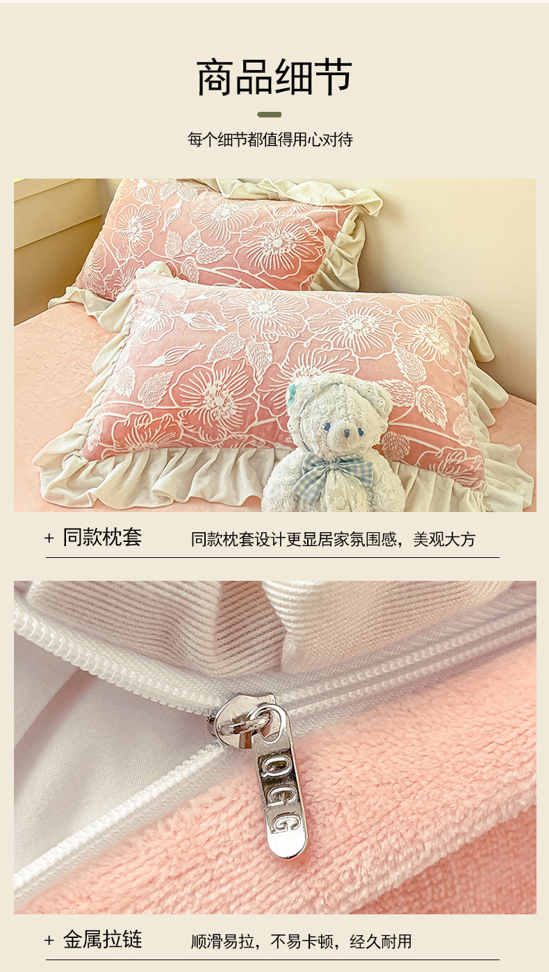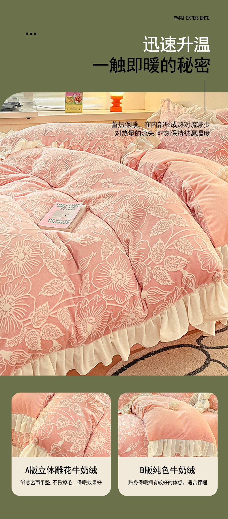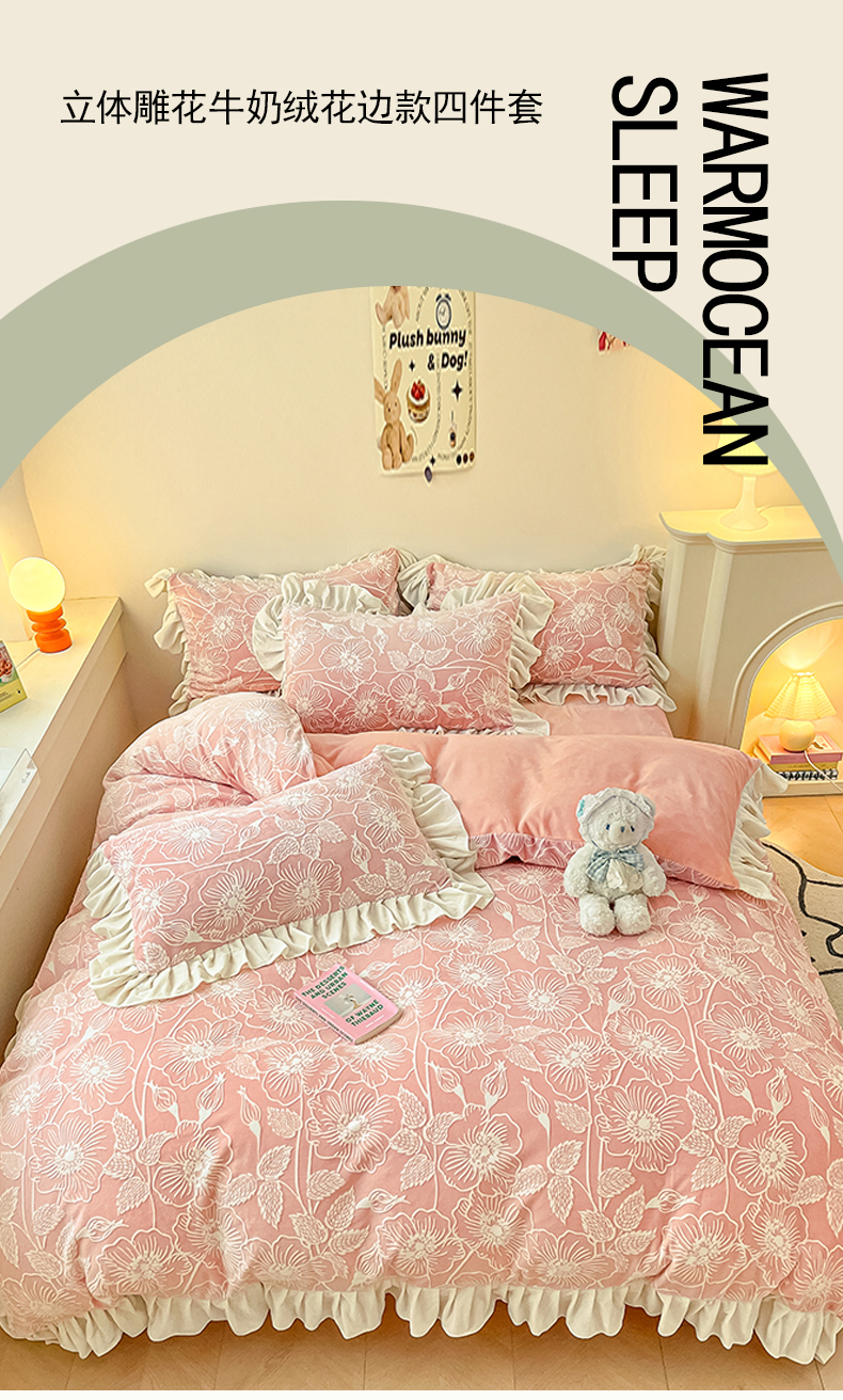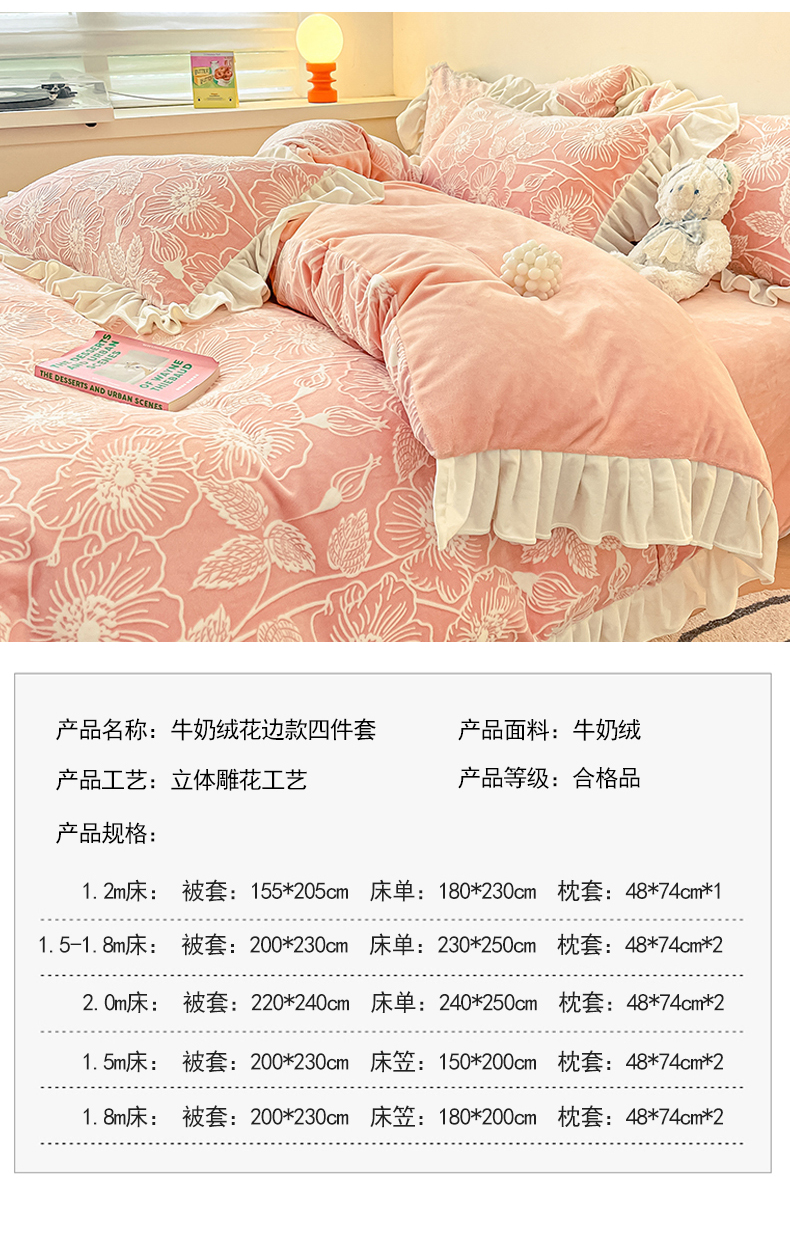 当前位置: 91家纺网 > 商品网购 > 床品套件 > 四件套 > 牛奶绒四件套 > 琪格格纺织 2025新款全消光小清新花边款雕花牛奶绒四件套 雕花绒花边 安妮花苑 粉
