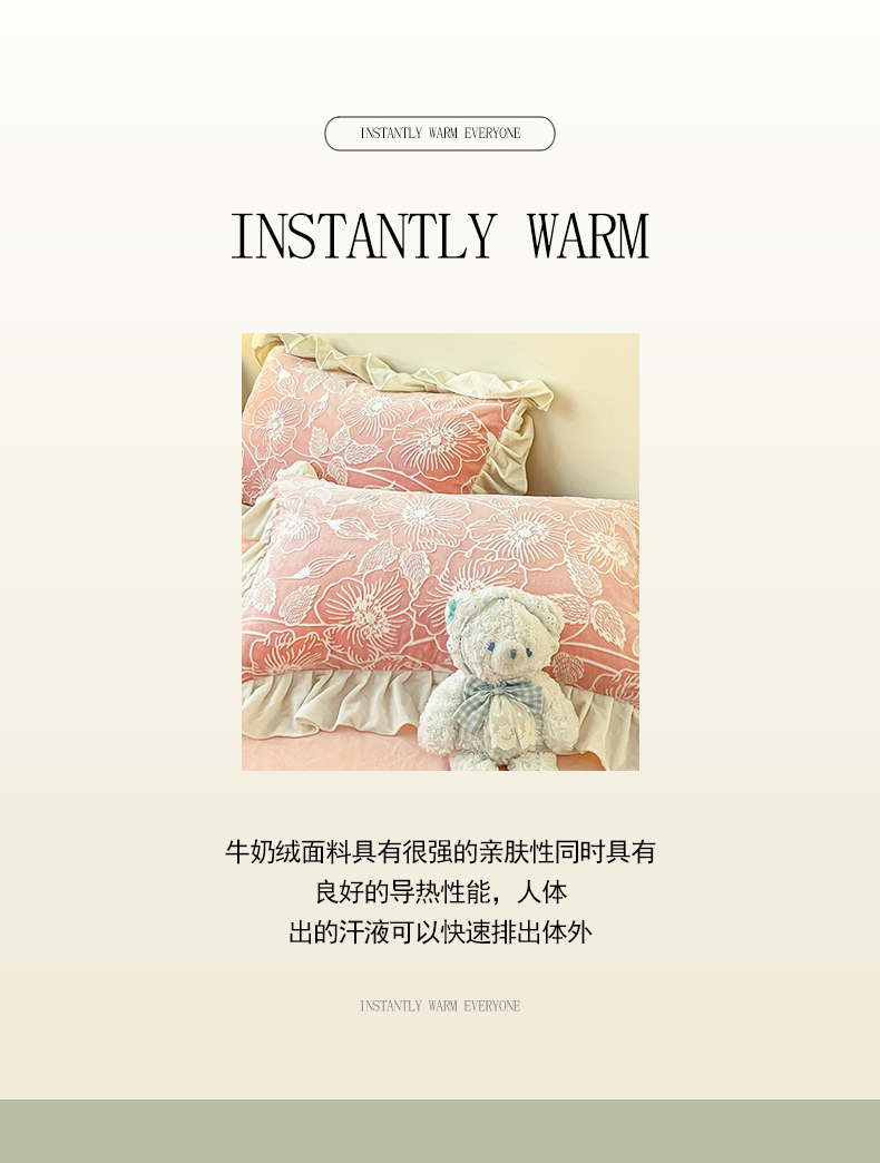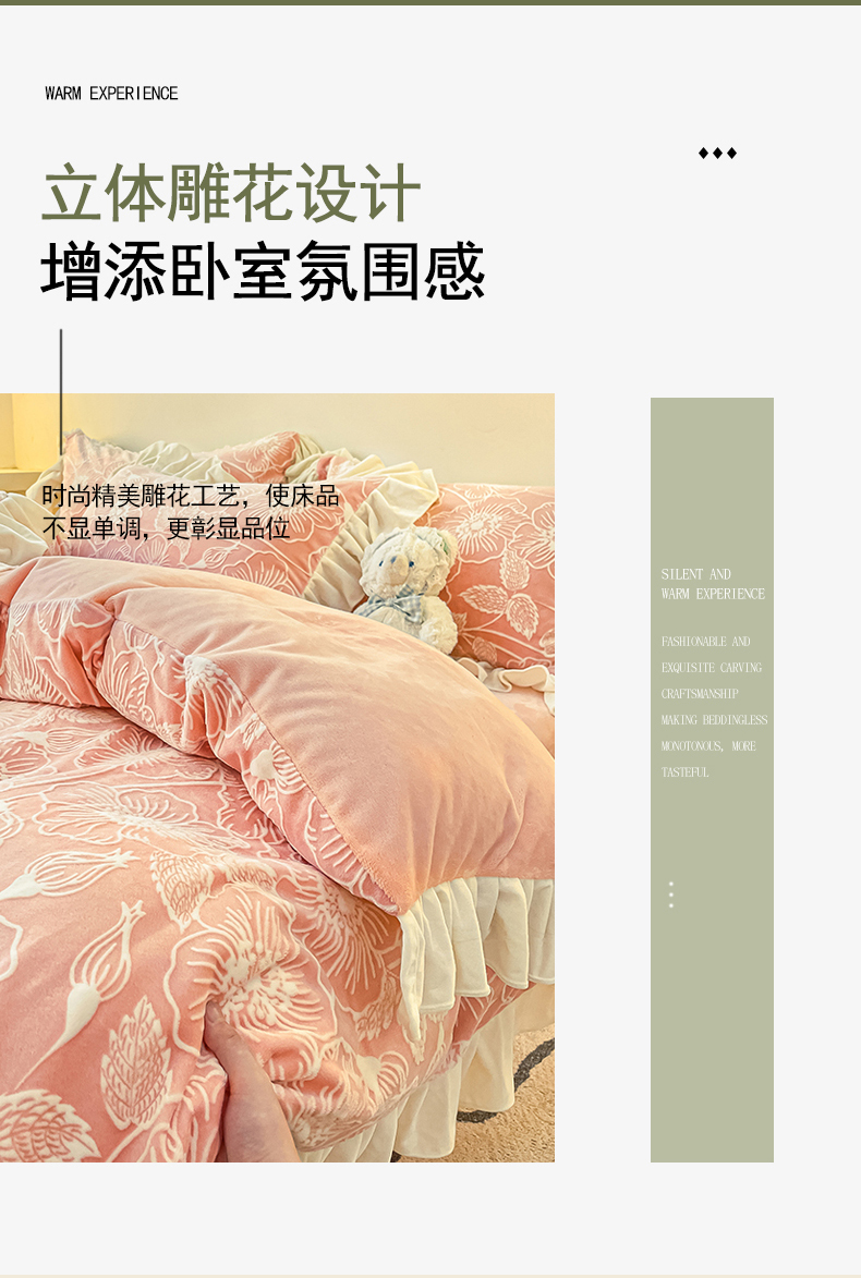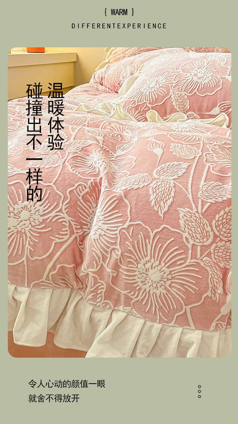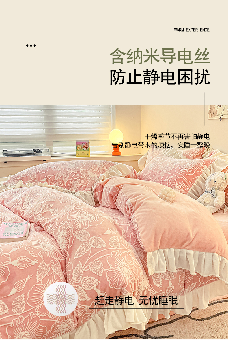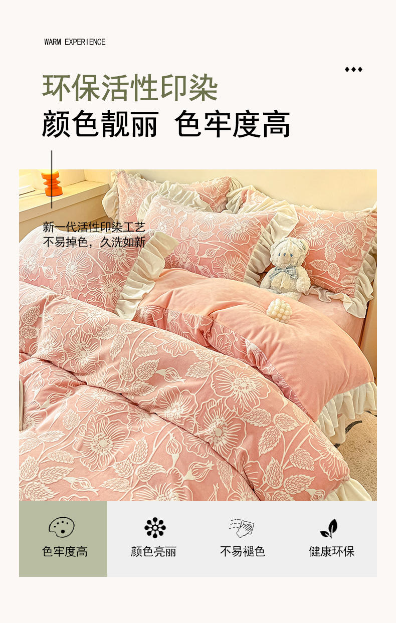 当前位置: 91家纺网 > 商品网购 > 床品套件 > 四件套 > 牛奶绒四件套 > 琪格格纺织 2025新款全消光小清新花边款雕花牛奶绒四件套 雕花绒花边 安妮花苑 粉