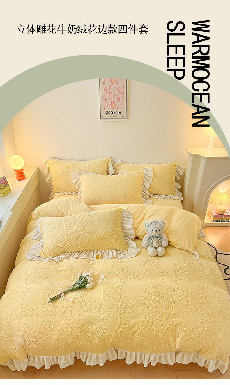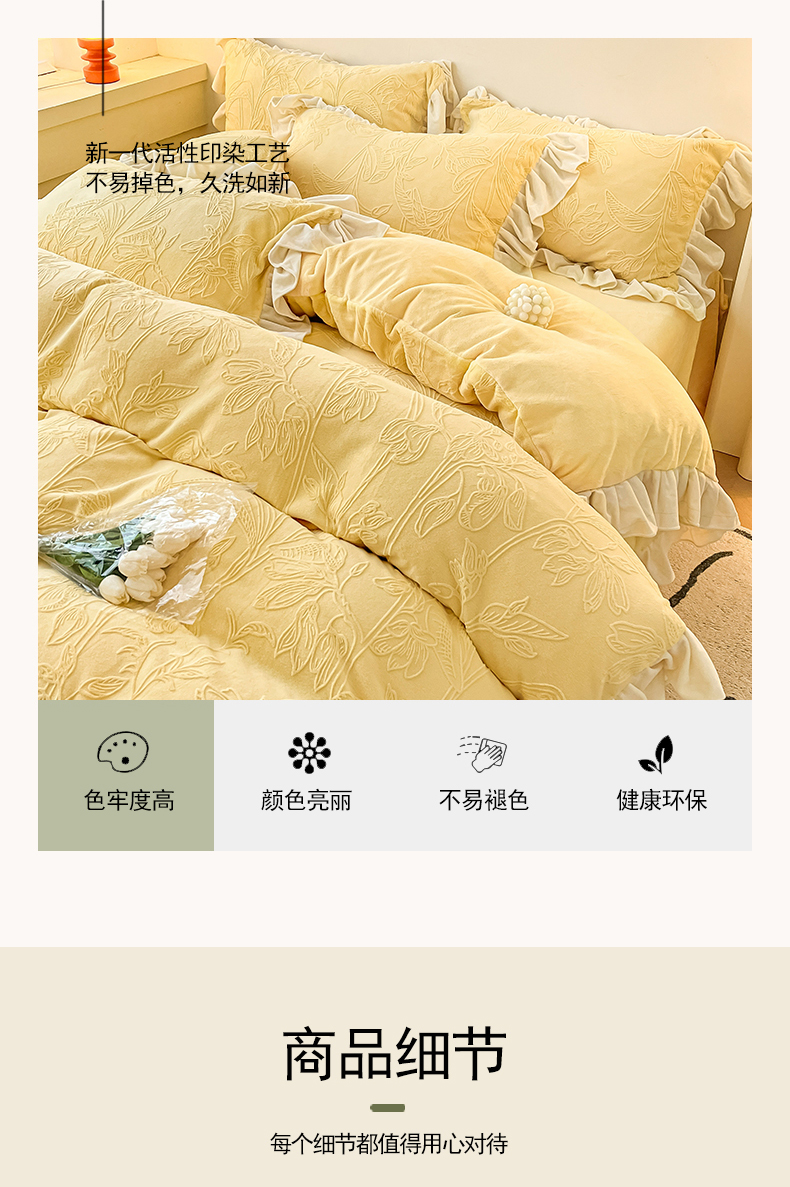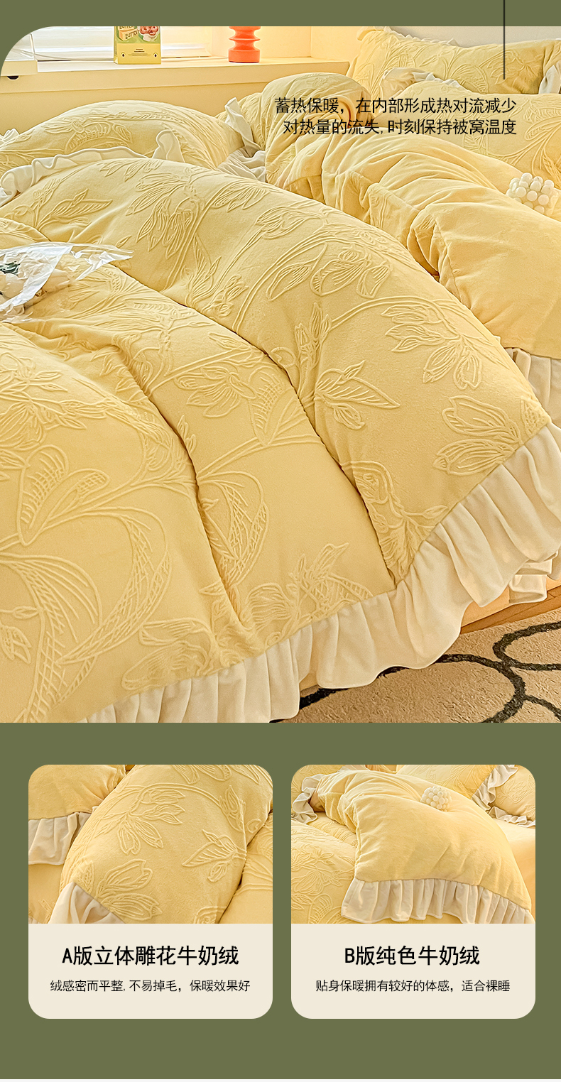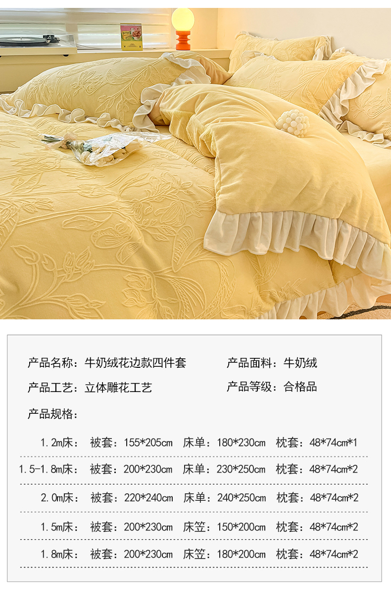 当前位置: 91家纺网 > 商品网购 > 床品套件 > 四件套 > 牛奶绒四件套 > 琪格格纺织 2025新款全消光小清新花边款雕花牛奶绒四件套 雕花绒花边 枝枝叶叶 黄