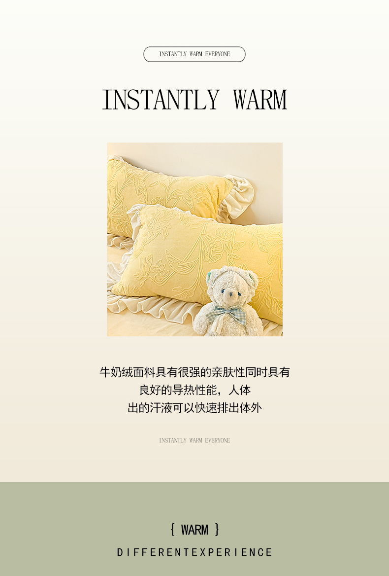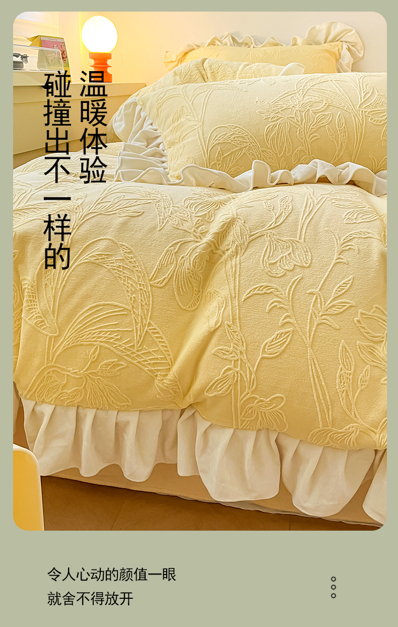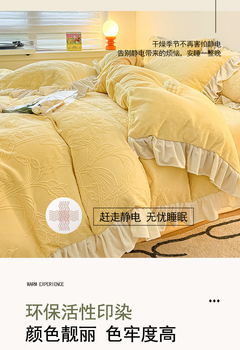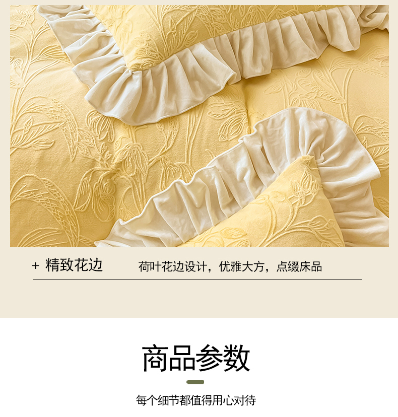 当前位置: 91家纺网 > 商品网购 > 床品套件 > 四件套 > 牛奶绒四件套 > 琪格格纺织 2025新款全消光小清新花边款雕花牛奶绒四件套 雕花绒花边 枝枝叶叶 黄