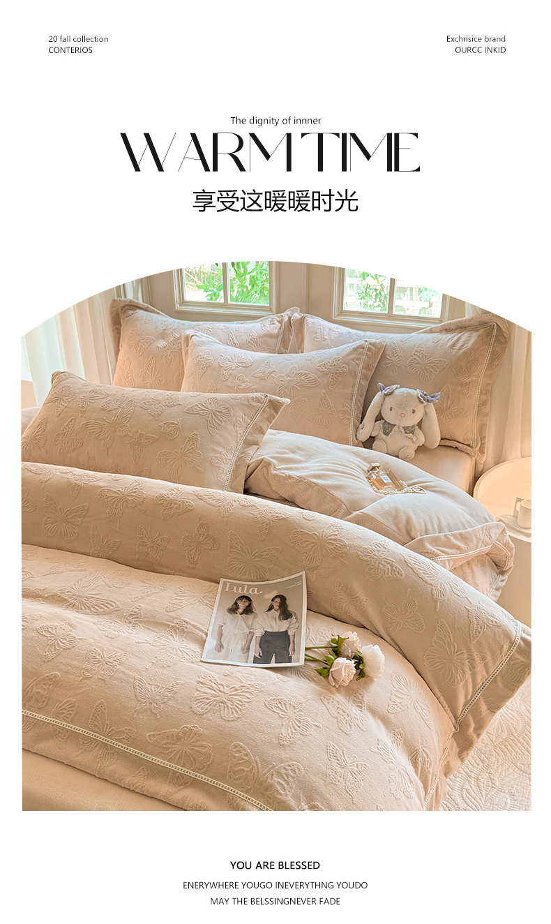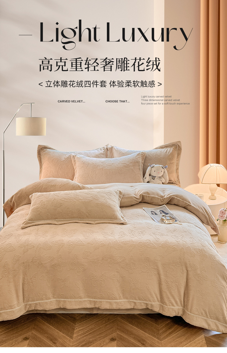 艾唯希家纺 2025新款全消光雕花绒织带款四件套牛奶绒-雕花织带系列 花舞蝶飞-驼