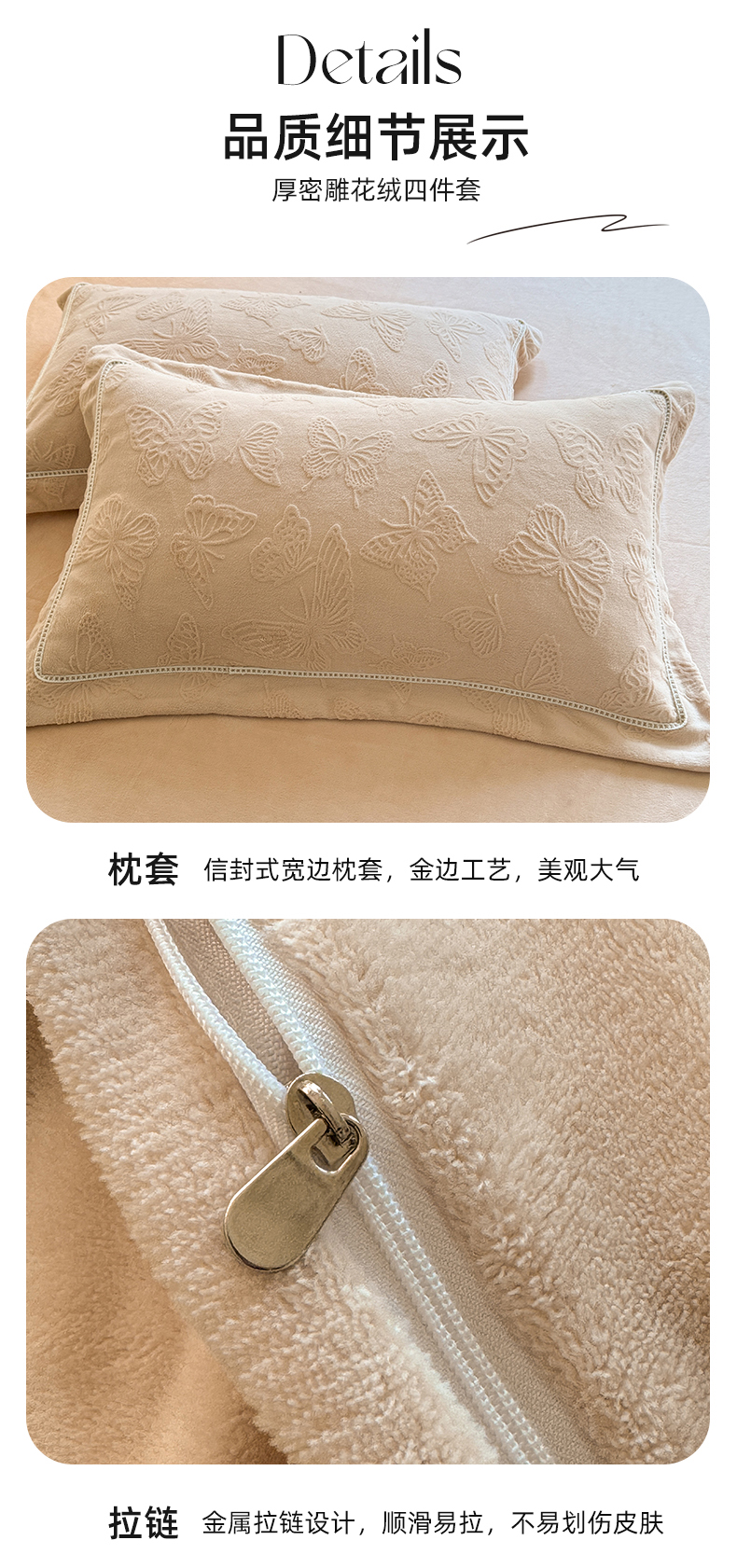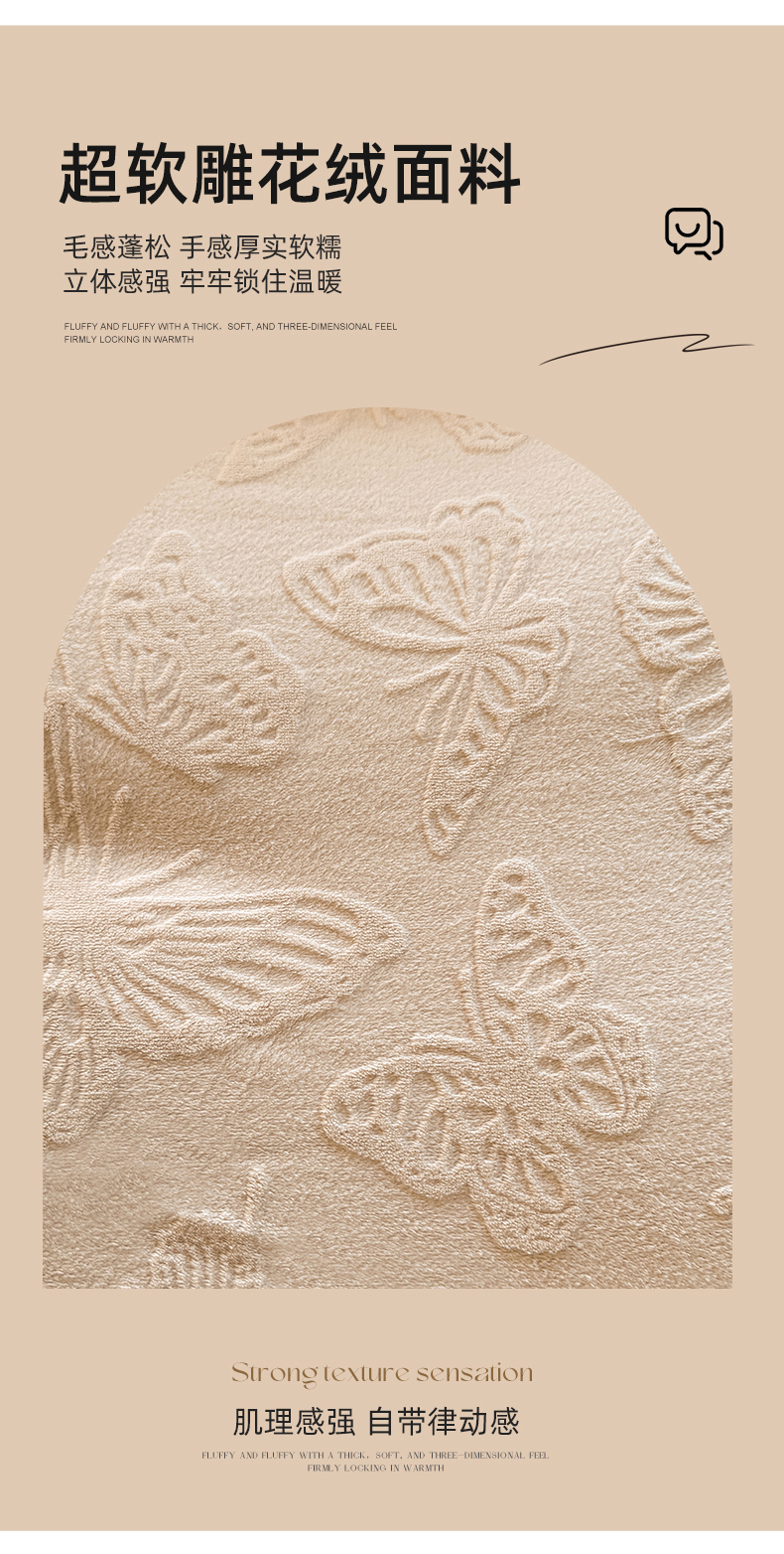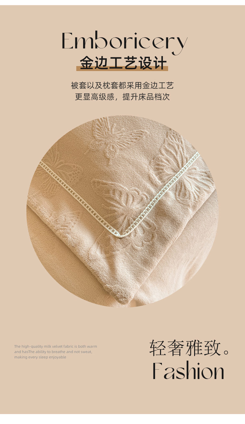 商品名称:艾唯希家纺 2025新款全消光雕花绒织带款四件套牛奶绒-雕花织带系列 花舞蝶飞-驼