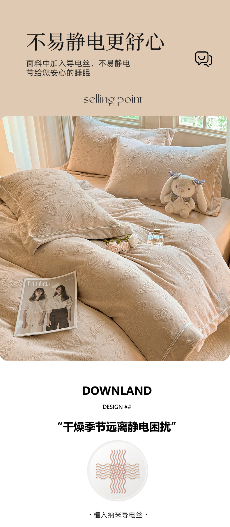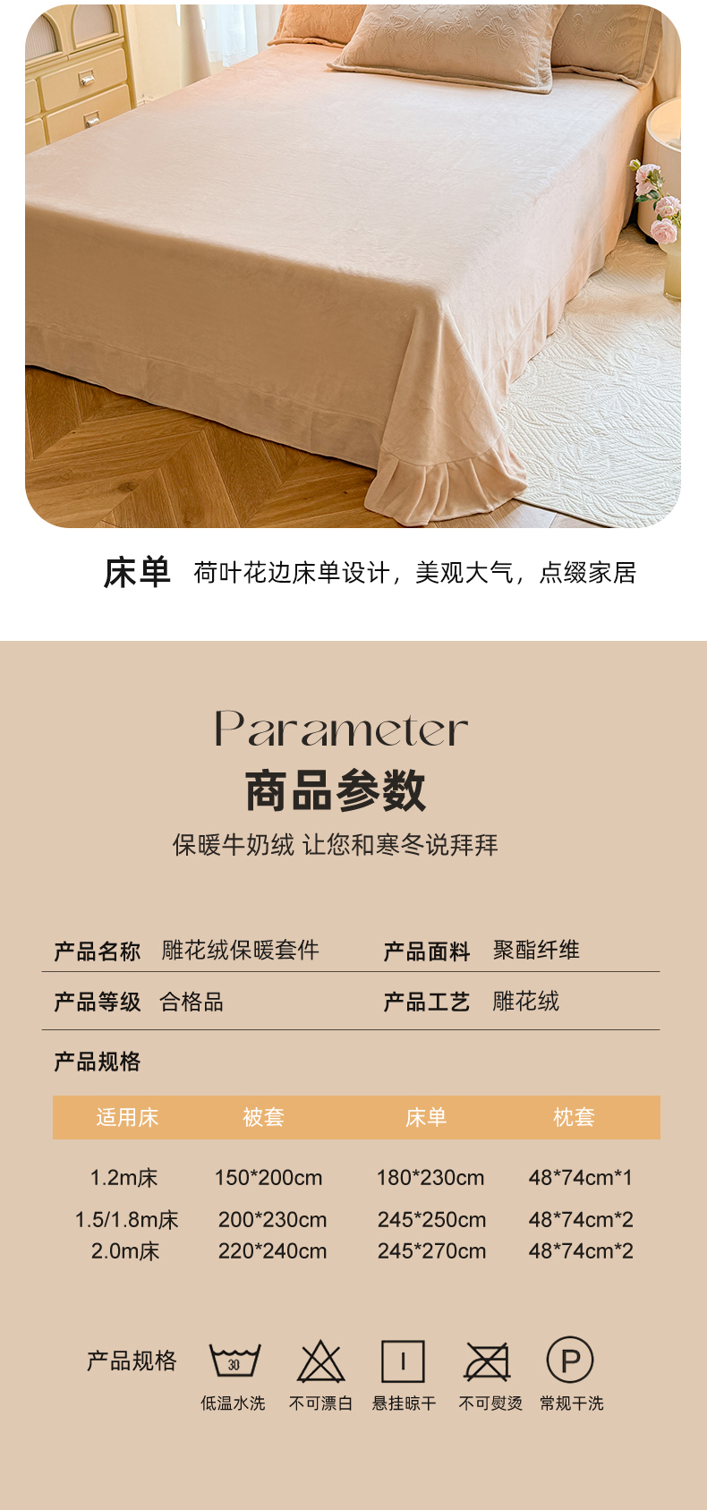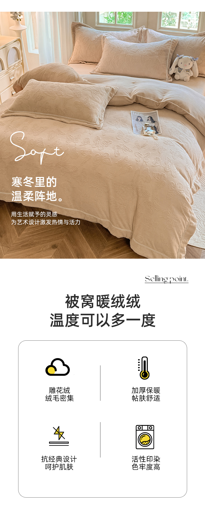 商品名称:艾唯希家纺 2025新款全消光雕花绒织带款四件套牛奶绒-雕花织带系列 花舞蝶飞-驼