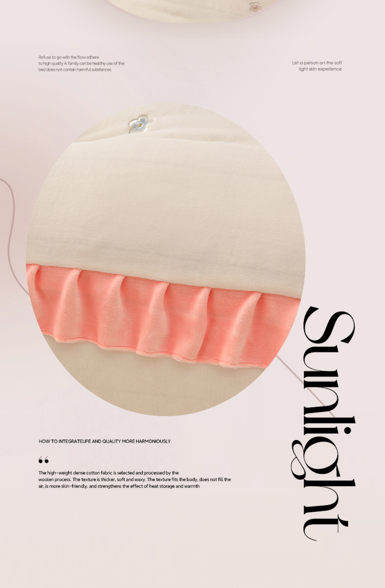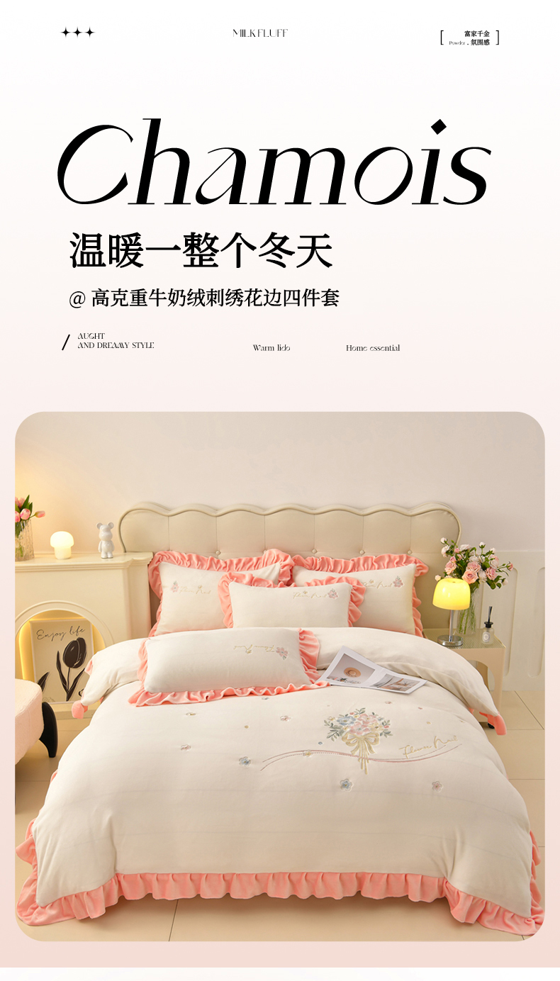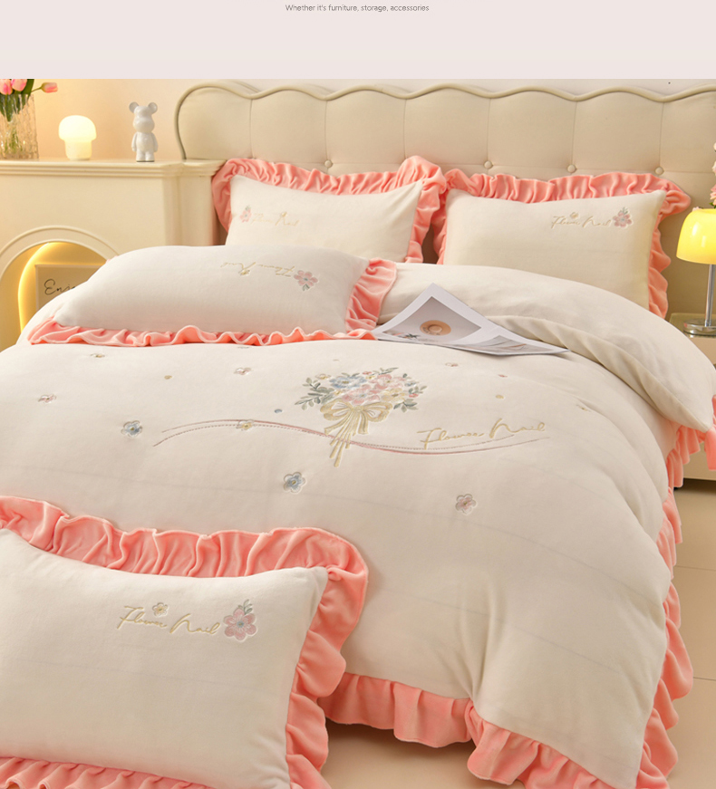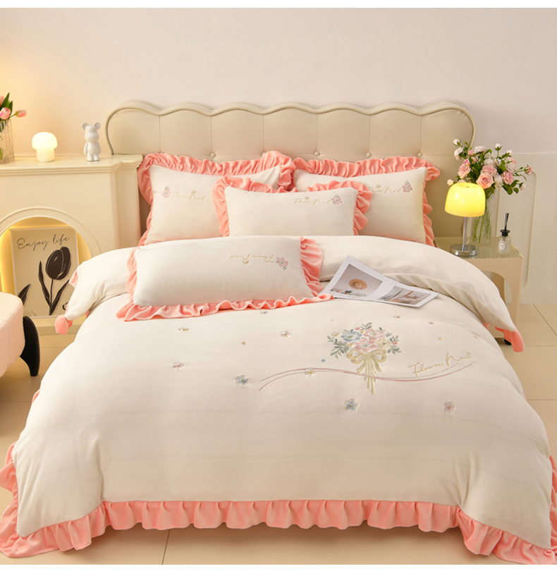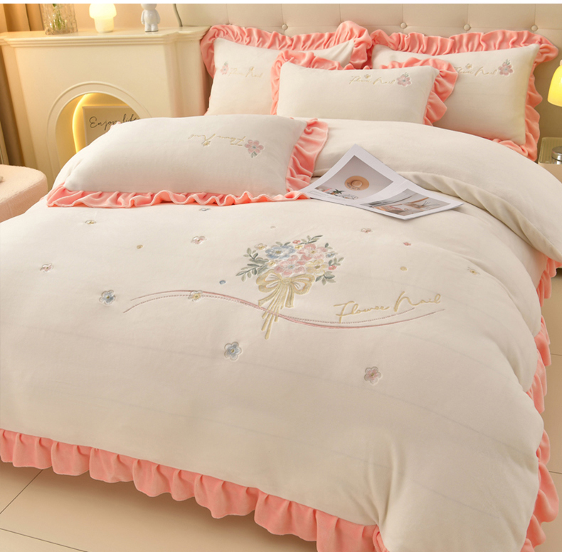 畅畅家纺 2025新款亲肤舒适冬季刺绣花边保暖牛奶绒四件套-花束 花束-米白