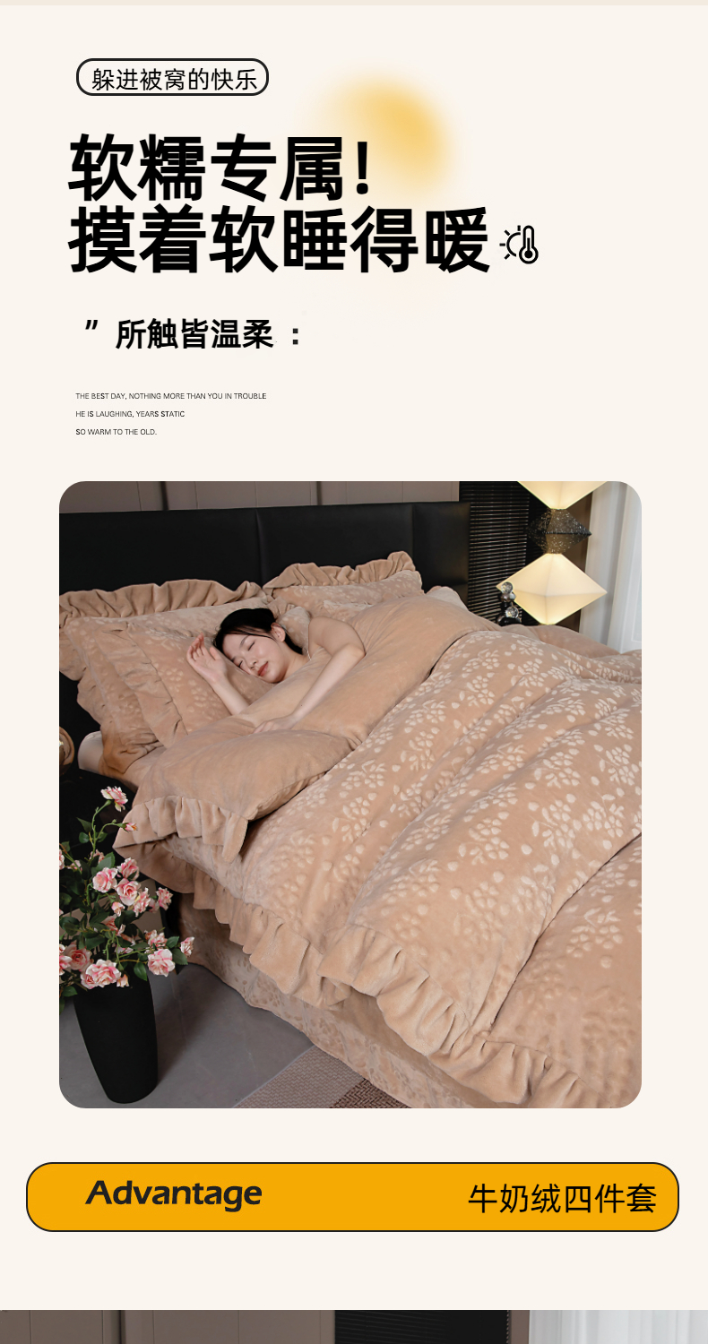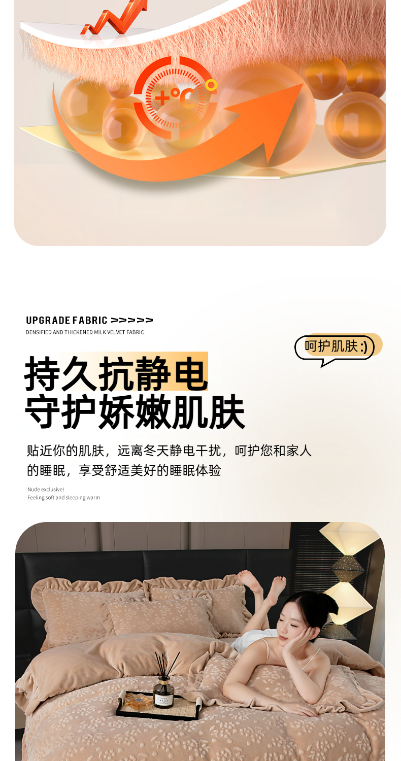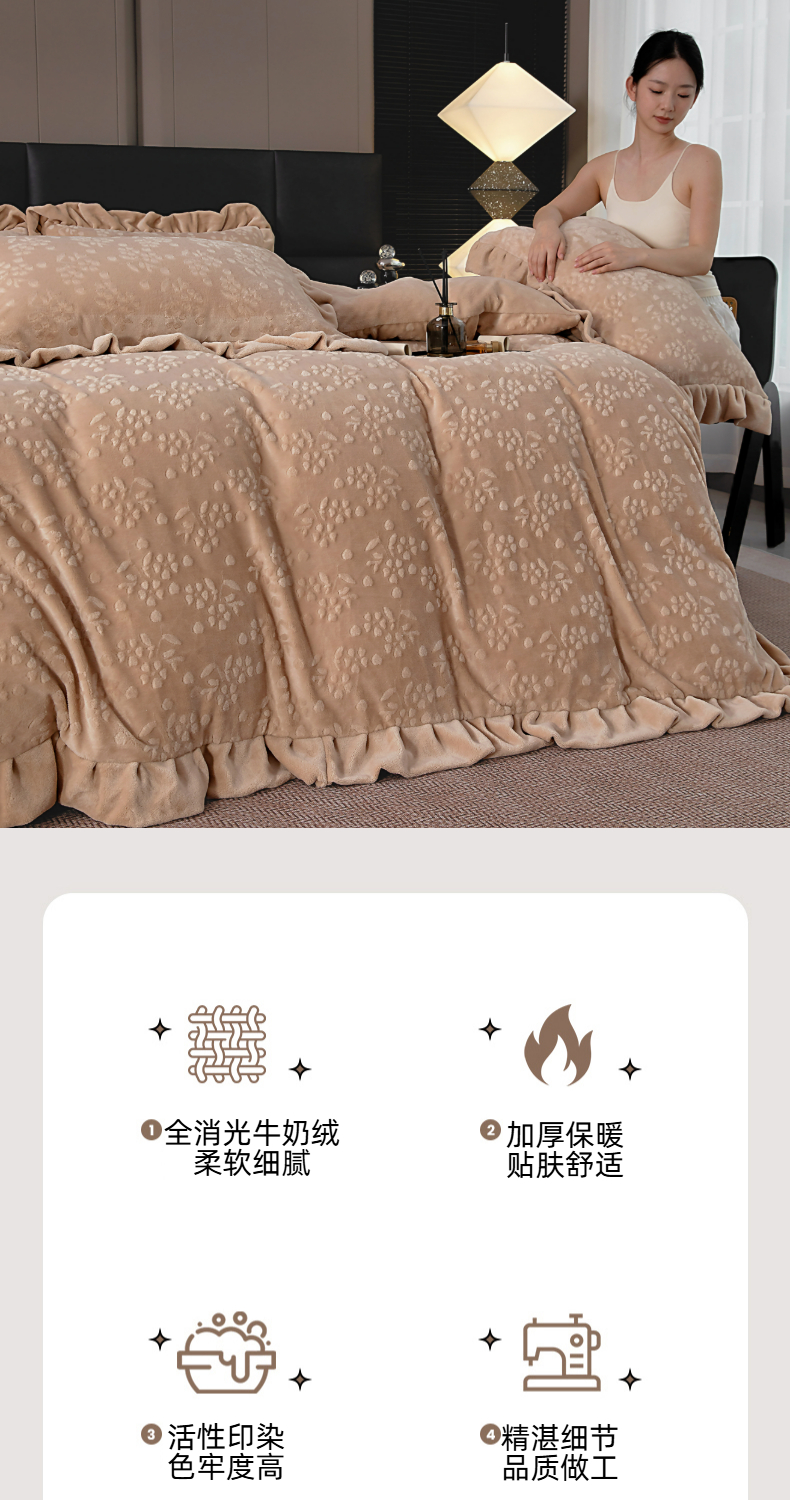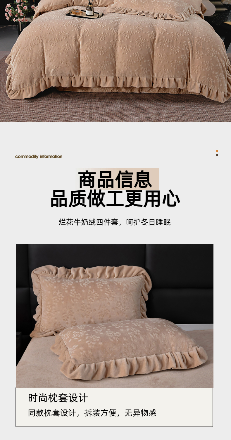 商品名称:找底底家纺 2025新款加厚韩版全消光烂花牛奶绒四件套(加厚8斤重 日销20单客户优惠8元) 澜花-咖色