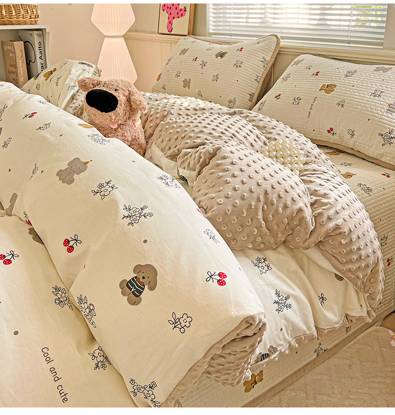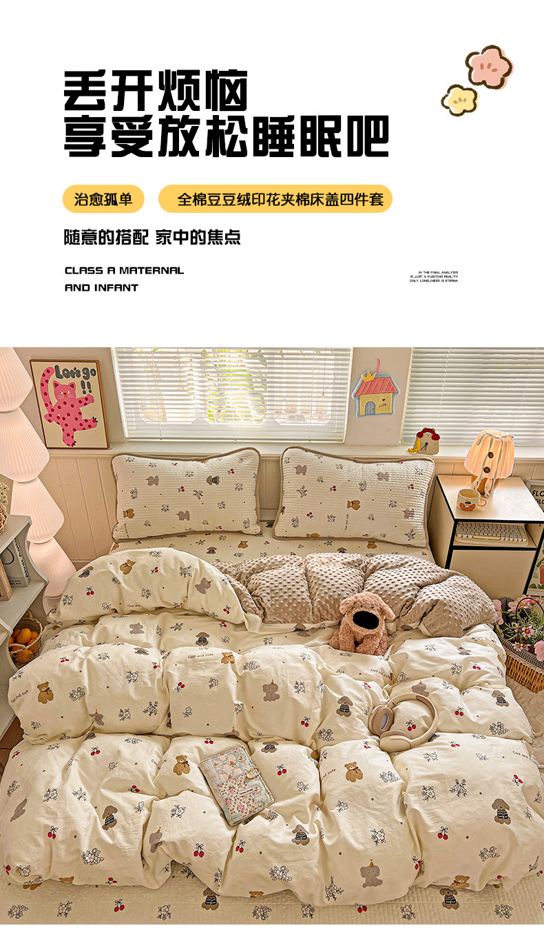 (总)漫时光 2025新款正面纯棉反面宝宝绒印花夹棉砂洗床盖四件套,班尼熊,曲奇小狗,条纹熊,蕾丝小狗,汪汪曲,开心屋,小狗日记,花园兔,小伙伴,花间小兔,小熊猫,风铃小兔,猫咪派对