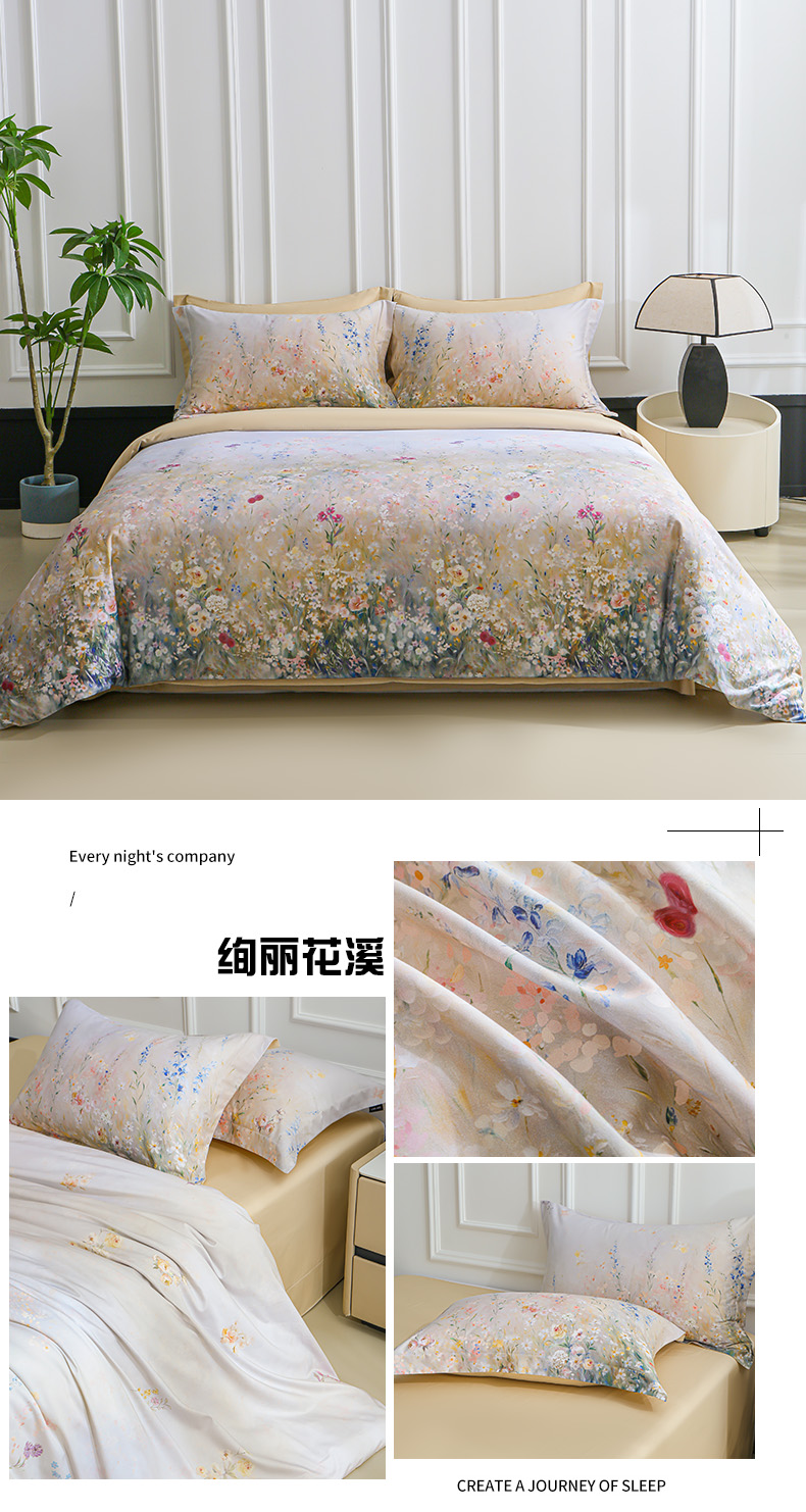 (总)洺兰家居 2026年新疆长绒棉100支天丝棉高端工艺款床单床笠四件套床上用品,淡若清香,陌上花开,羽墨