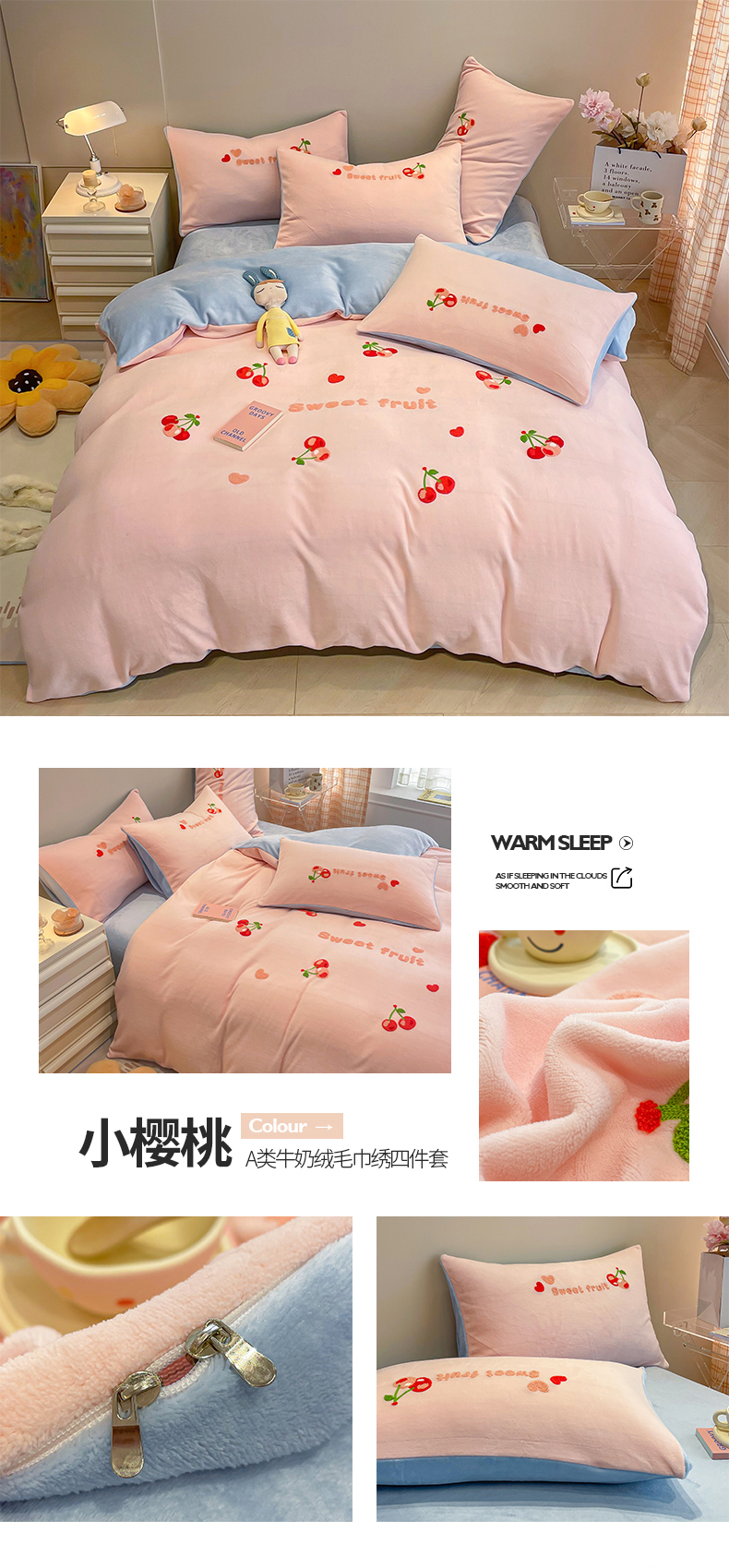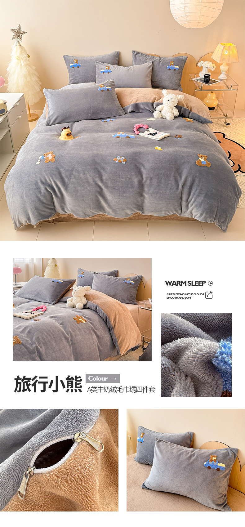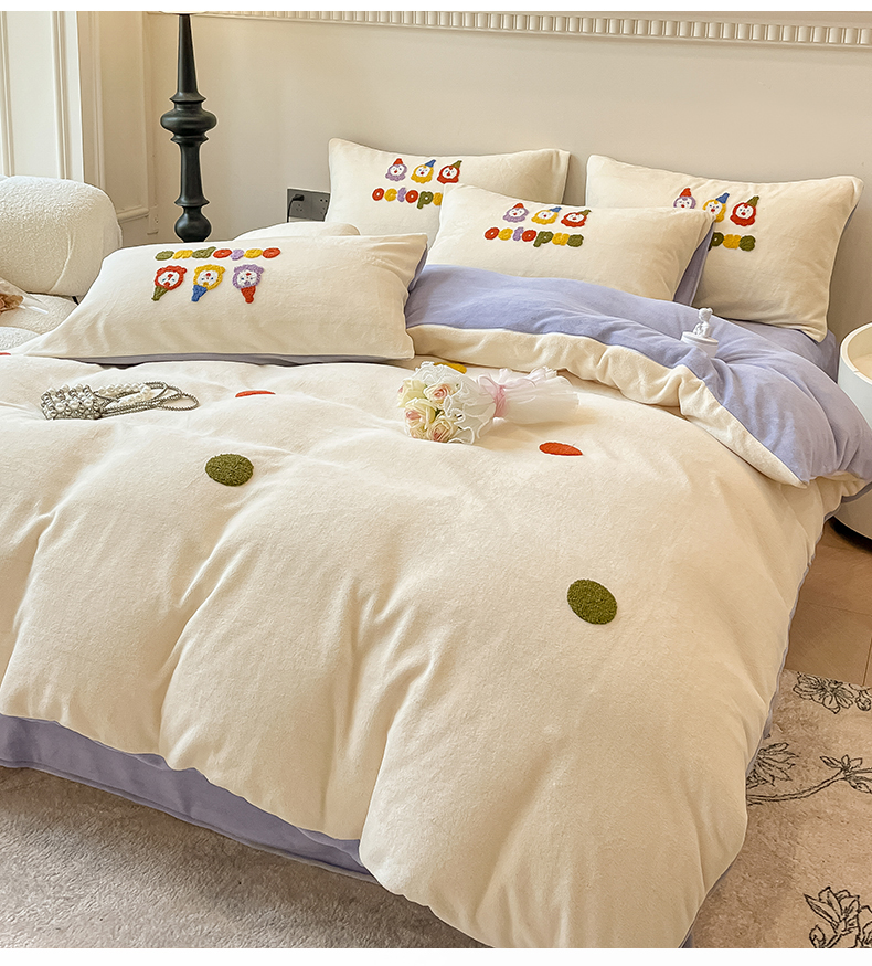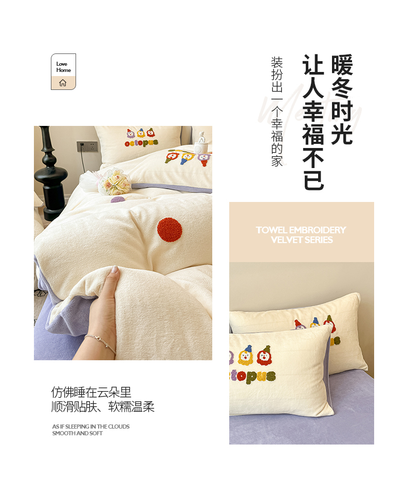 商品名称:懒猫家纺 2025新款牛奶绒毛巾绣四件套 聚会小象