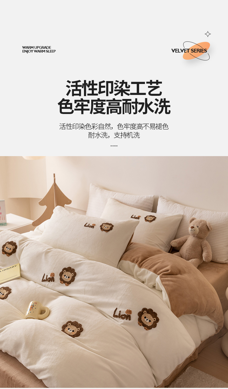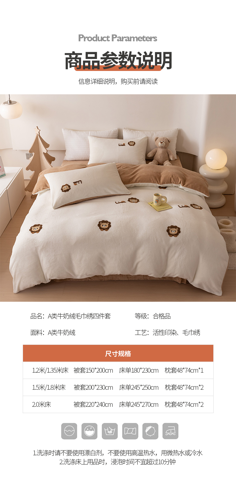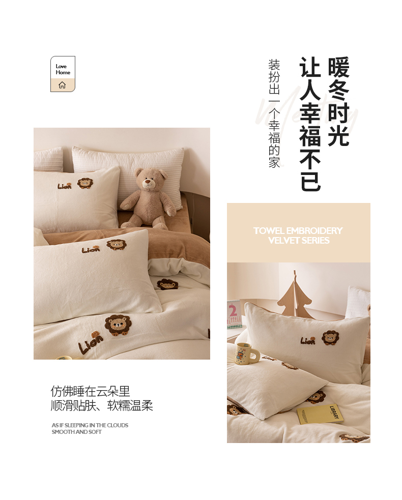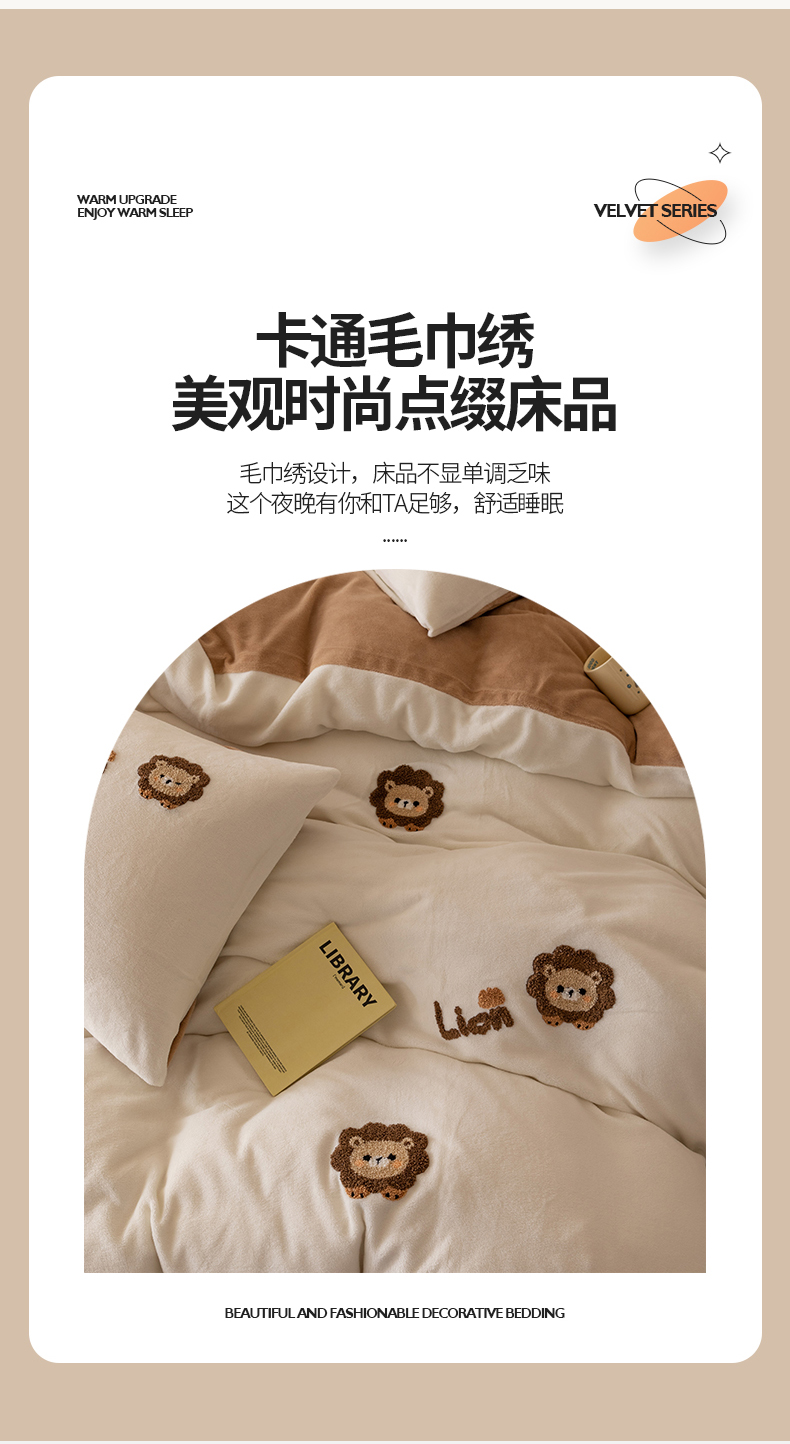 商品名称:懒猫家纺 2025新款牛奶绒毛巾绣四件套 小狮子