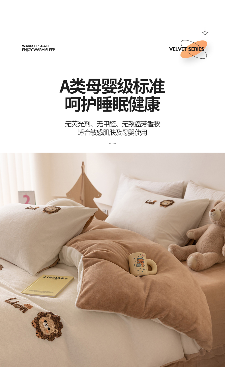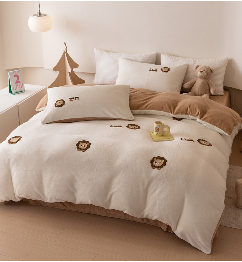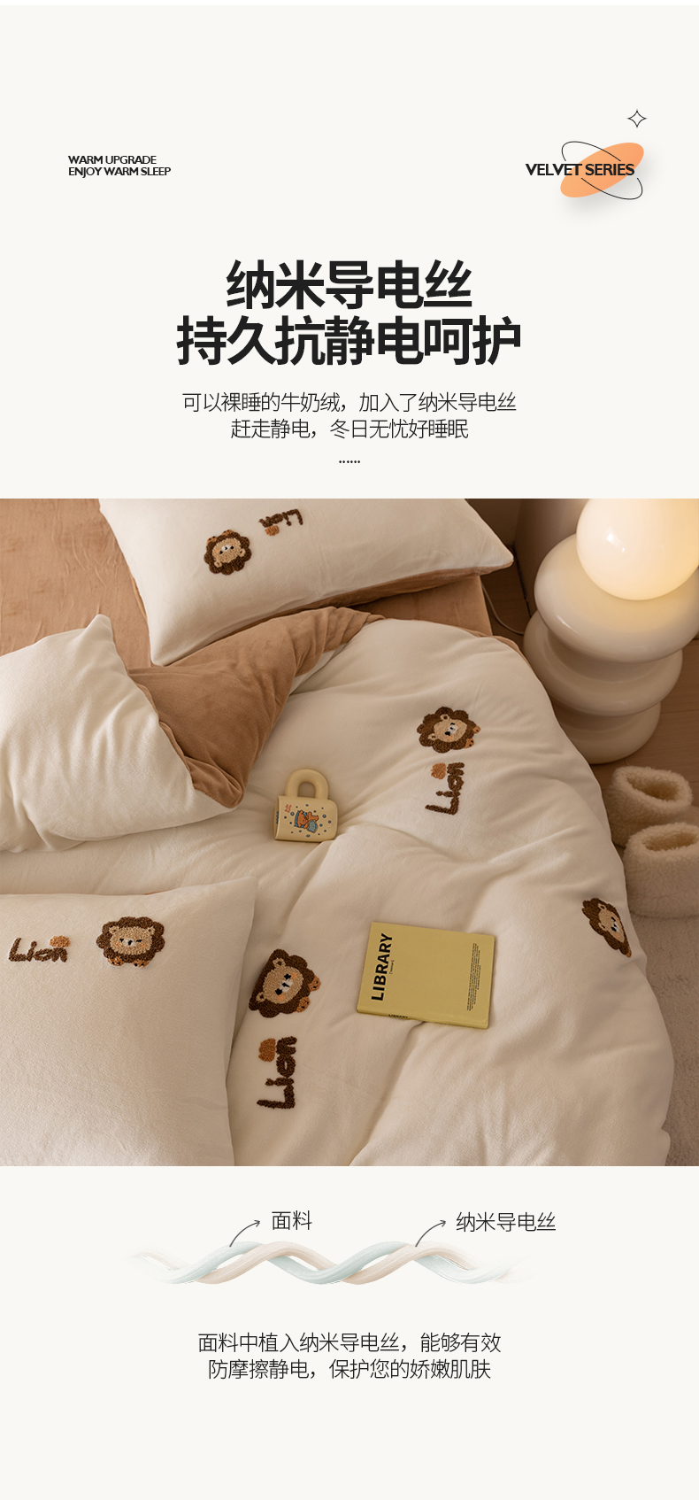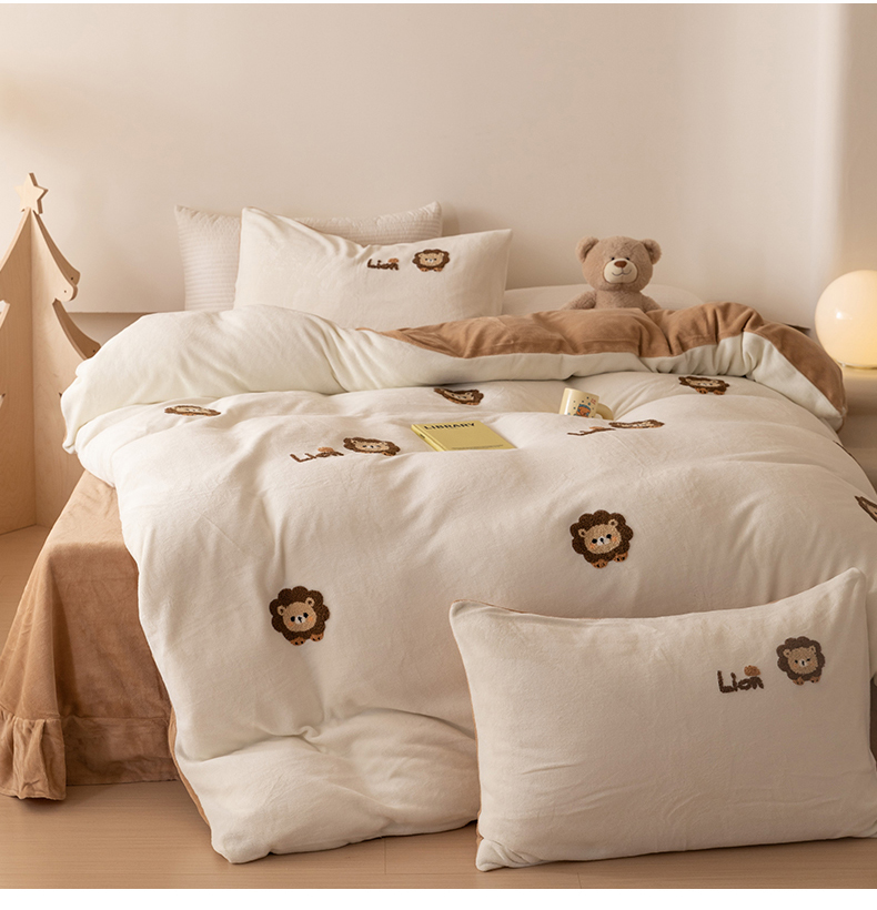 商品名称:懒猫家纺 2025新款牛奶绒毛巾绣四件套 小狮子