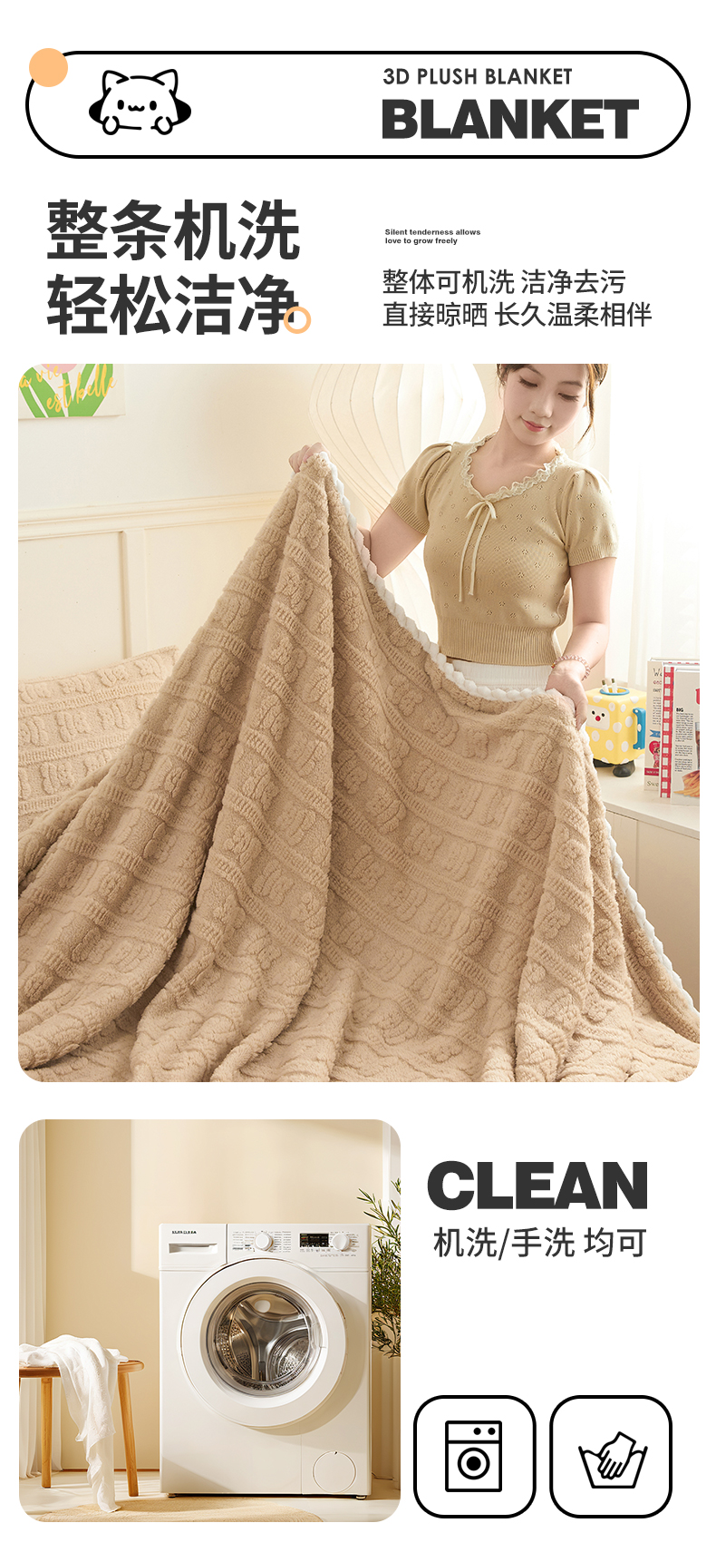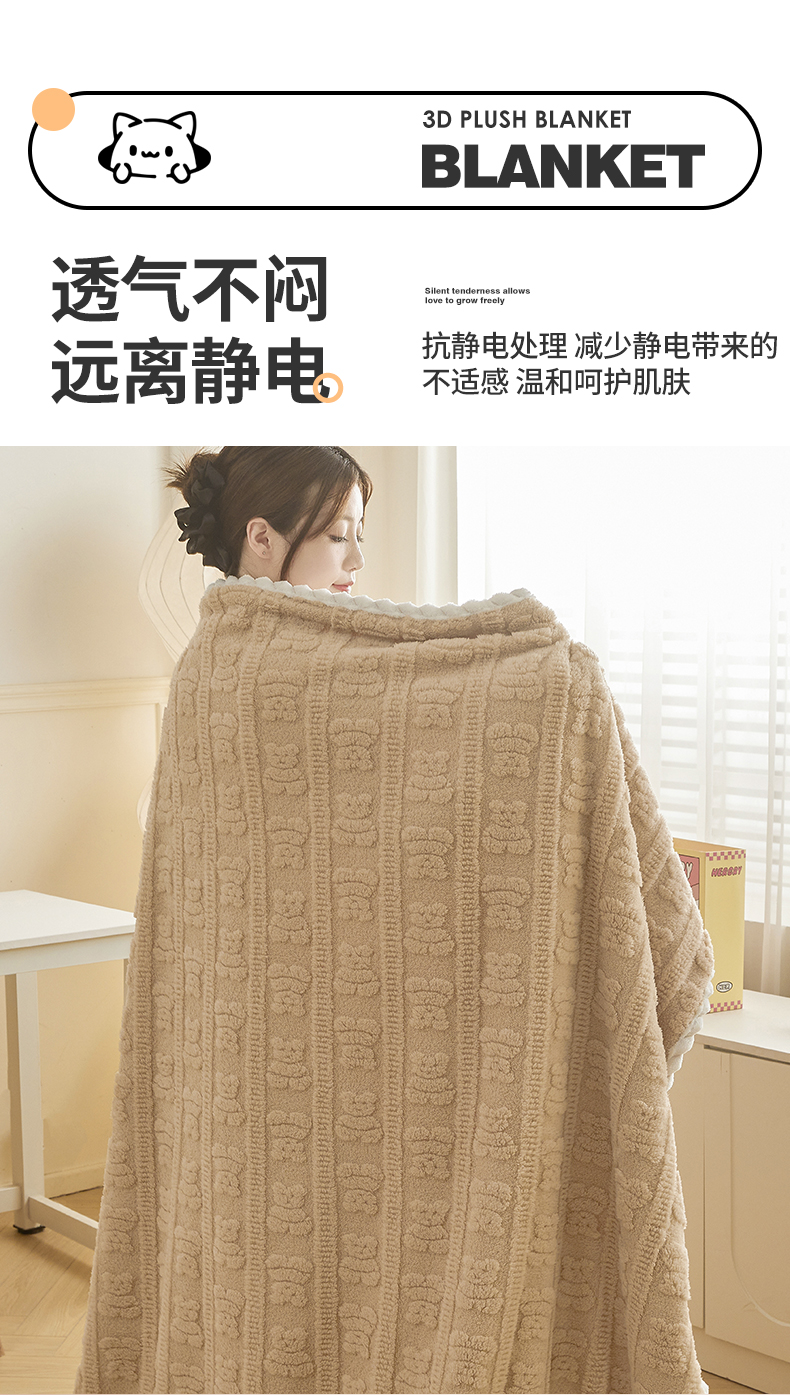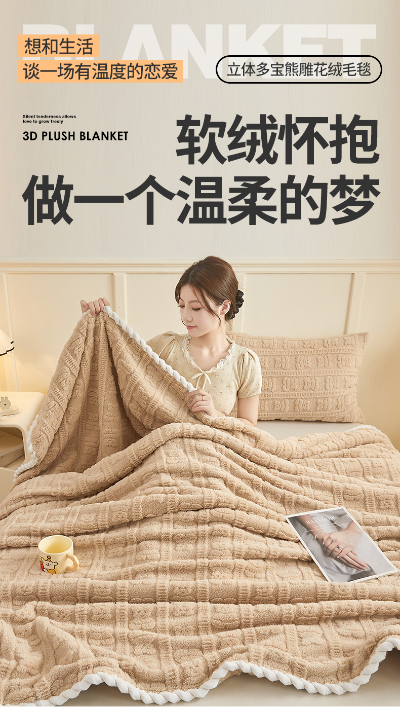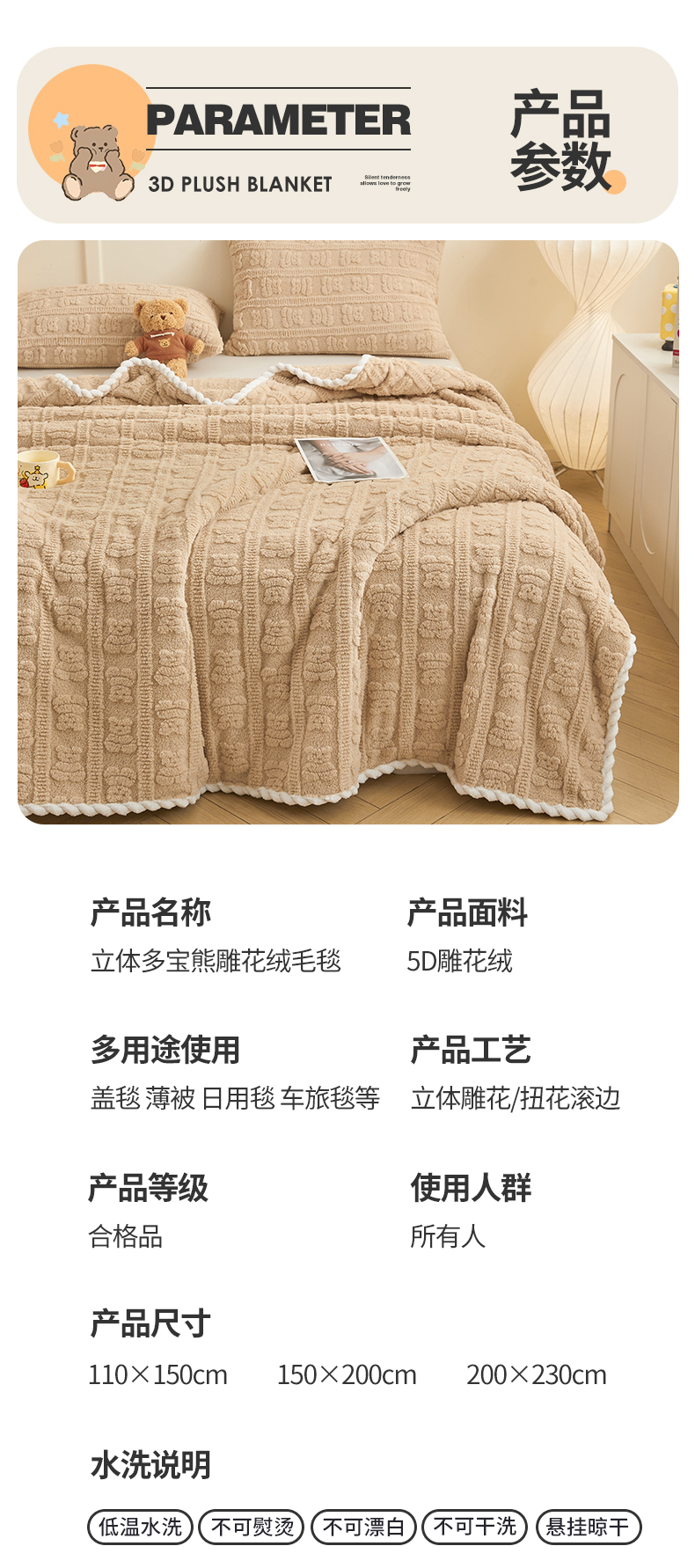 商品名称:世纪绒品 2025新款A类立体牛奶绒雕花绒单层毛毯毯子-多宝熊 多宝熊 卡其