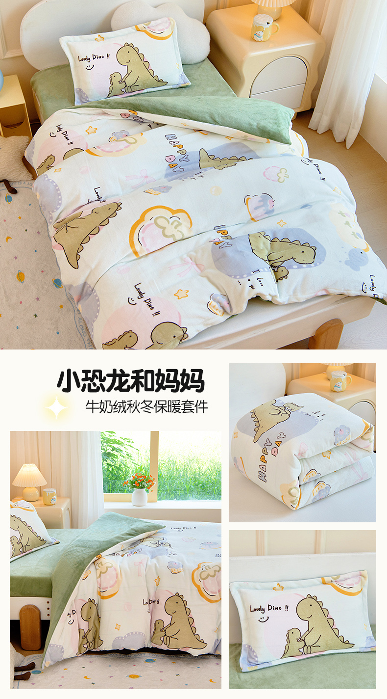 • 91家纺网 家纺一手货源 找家纺 (总)梵赫 2025新款加厚牛奶绒贴布绣原创卡通幼儿园套件儿童三件套,超级小萌怪,可爱小鸭,围巾兔,机灵小挖机,巧克力熊,组合,大象先生