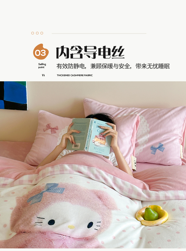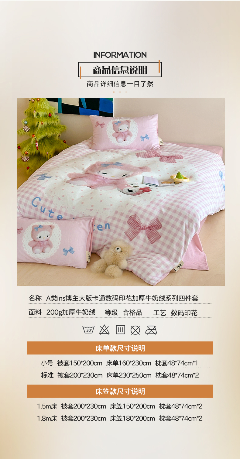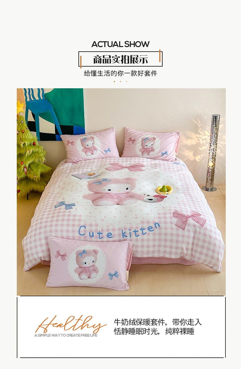 商品名称:桃子家居 2025新品A类ins博主大版卡通数码印花加厚牛奶绒系列四件套 绒大版-粉格蕾丝喵