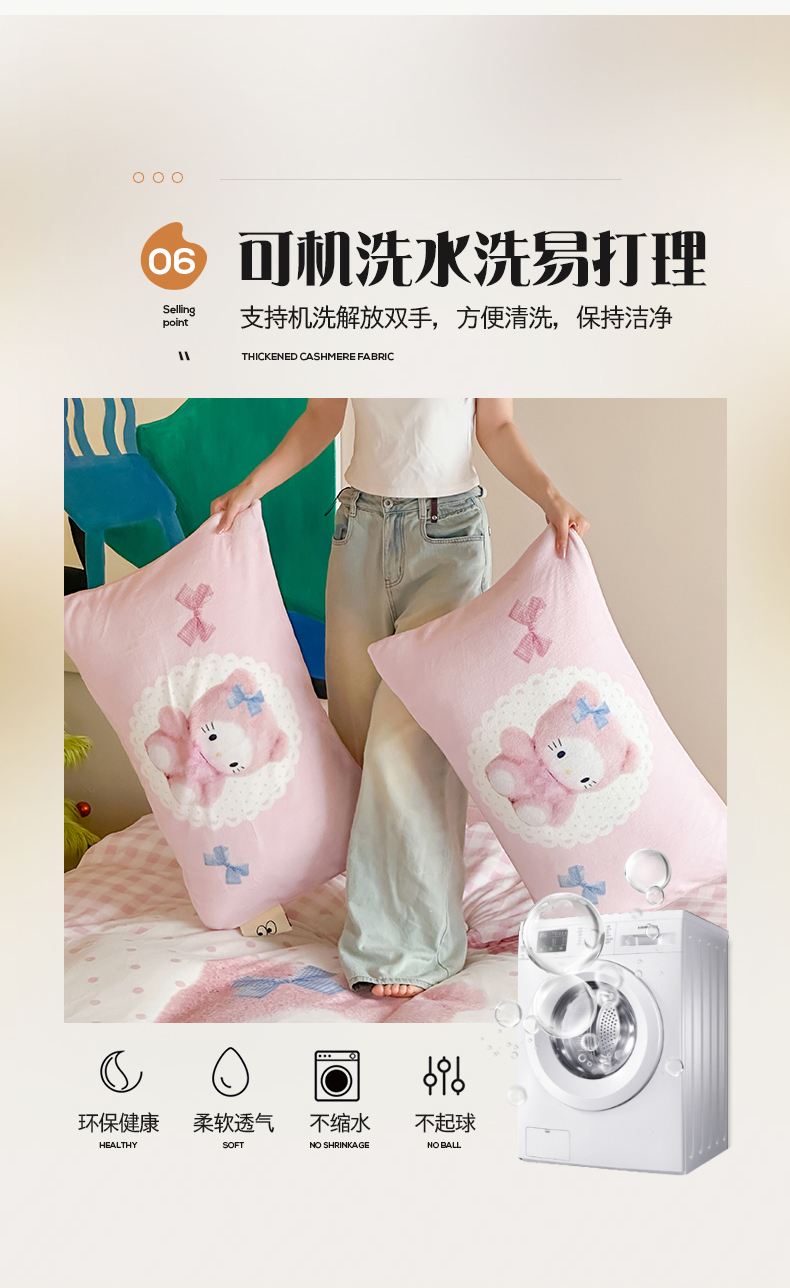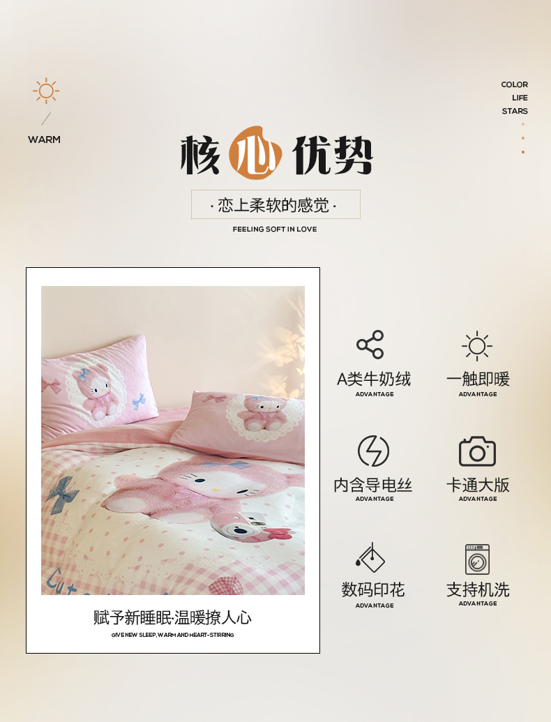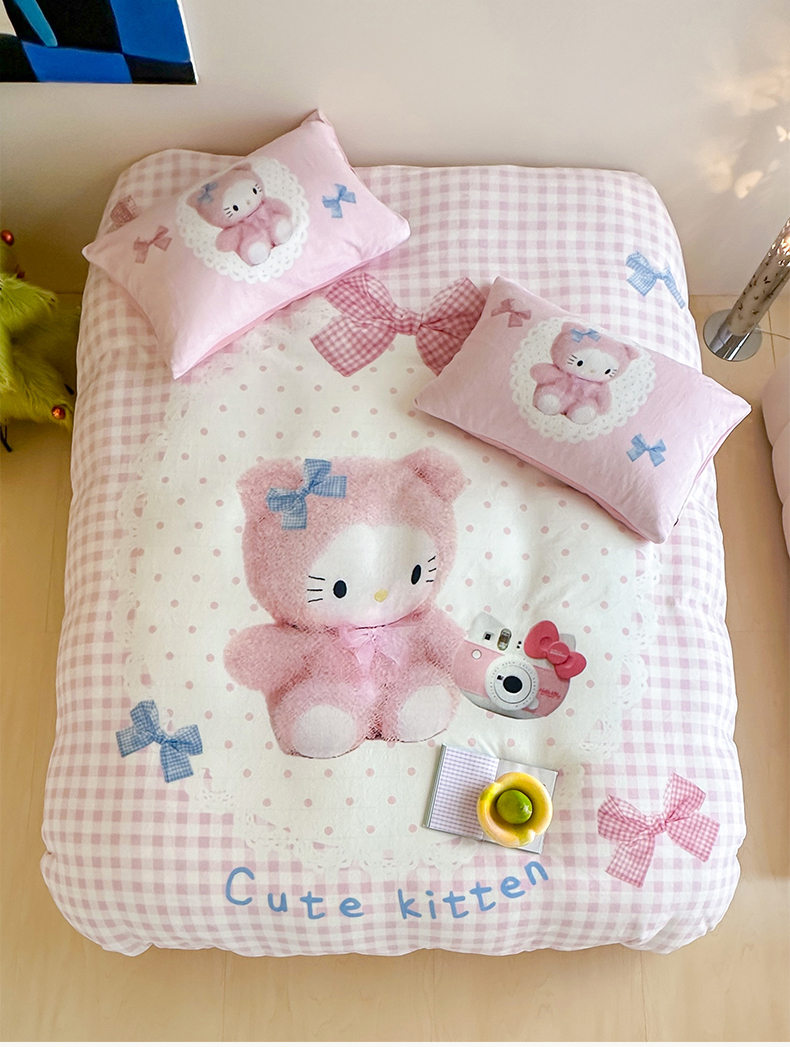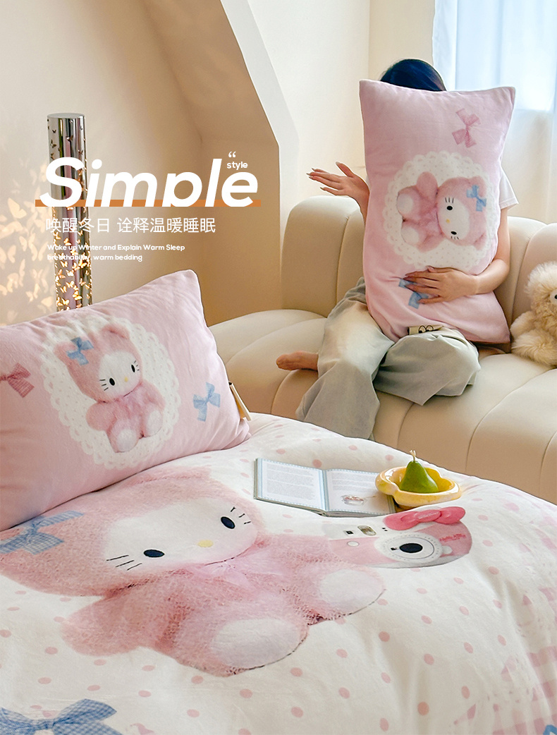 商品名称:桃子家居 2025新品A类ins博主大版卡通数码印花加厚牛奶绒系列四件套 绒大版-粉格蕾丝喵